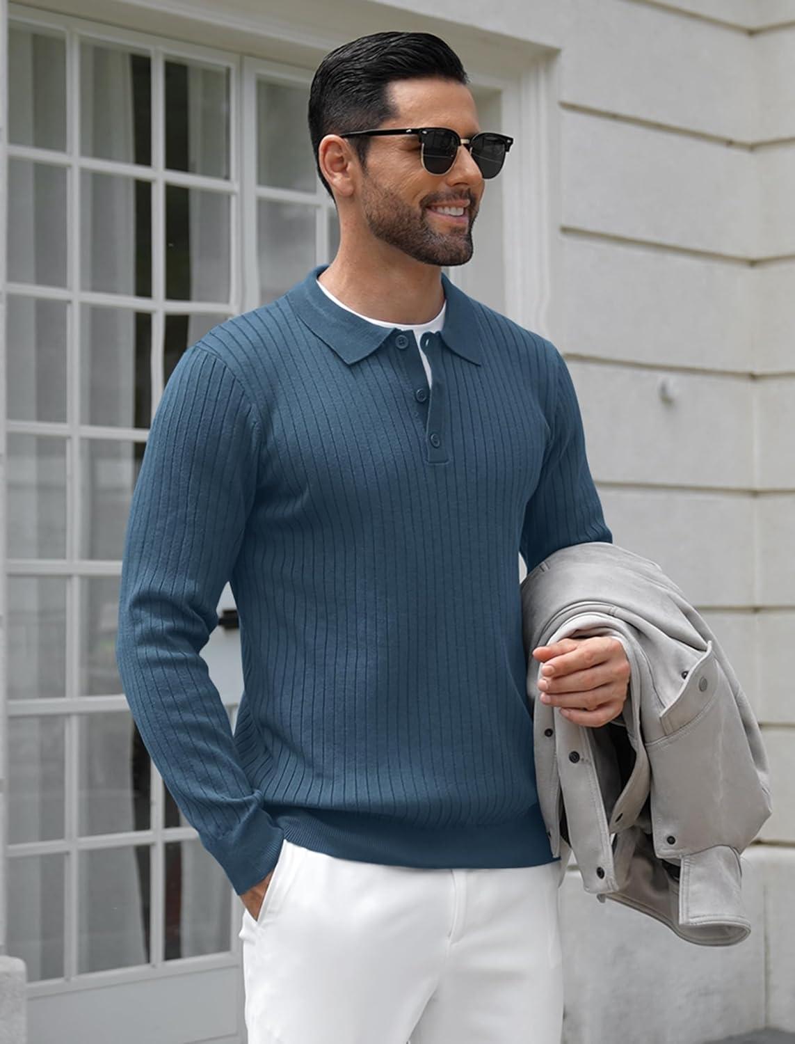 COOFANDY Mens Knit Polo Shirts Casual Long Sleeve Classic Polo Shirts Button Down Golf Shirts(Ribbed Denim Blue)