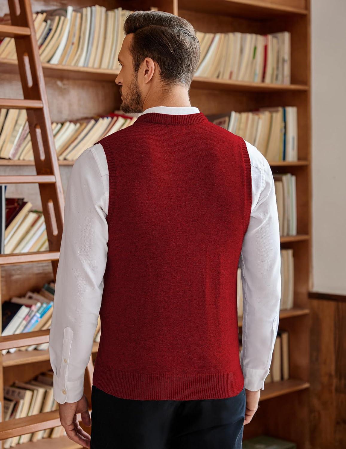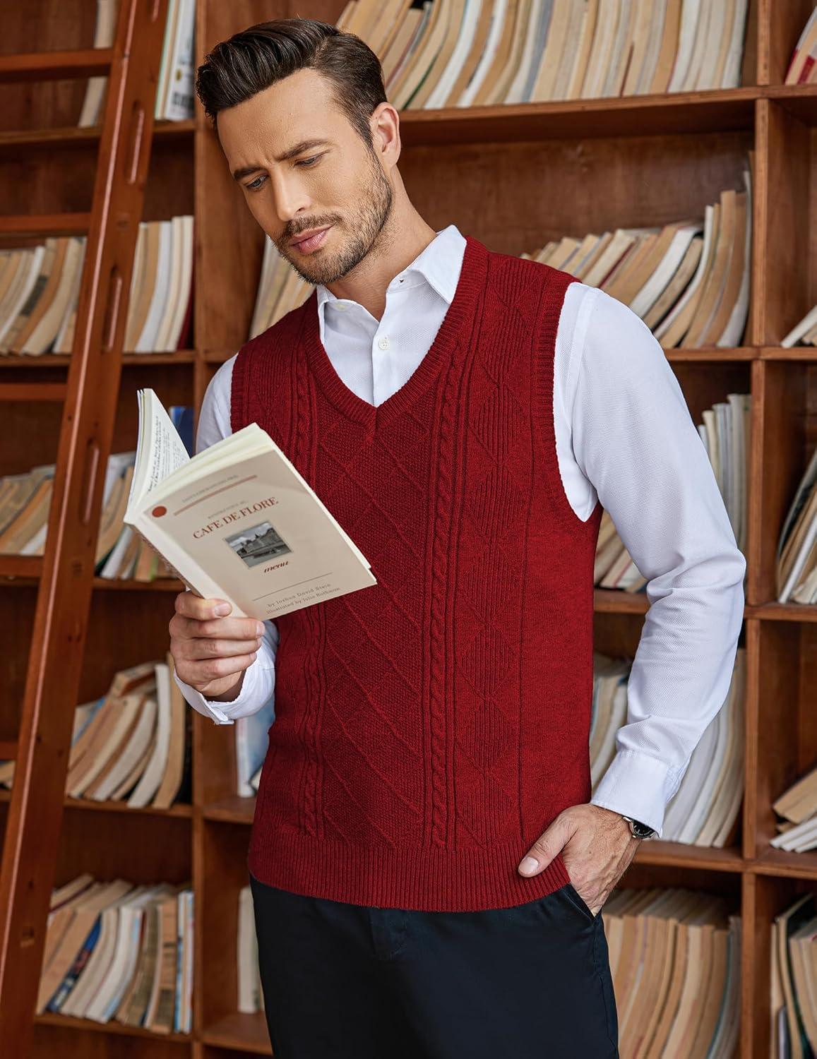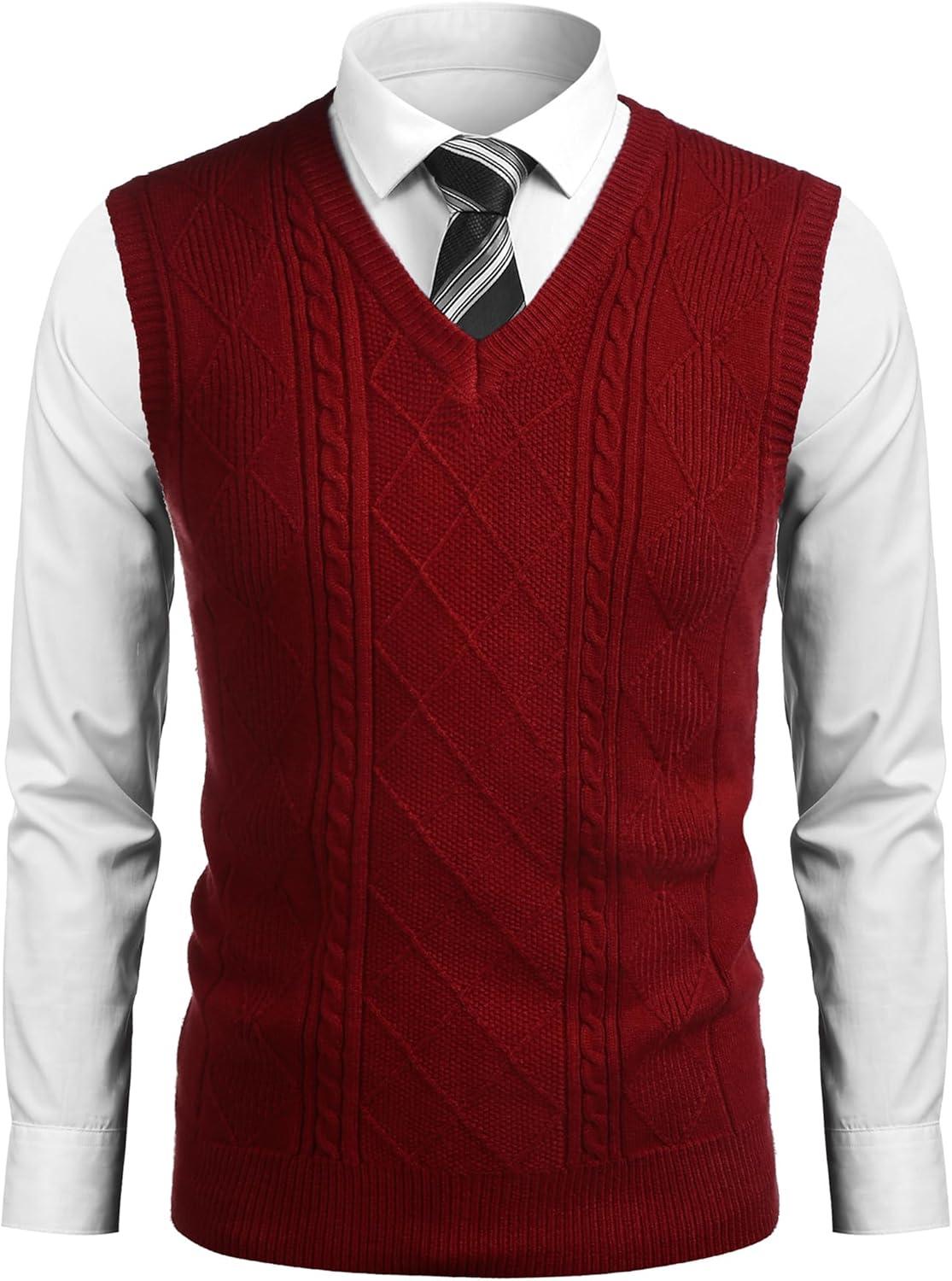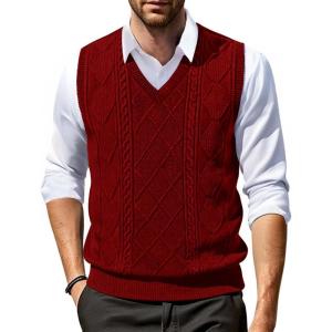 • COOFANDY Men’s Sweater Vest Cable Knitted V Neck Slim Fit Sleeveless Pullover Sweater(Wine Red)