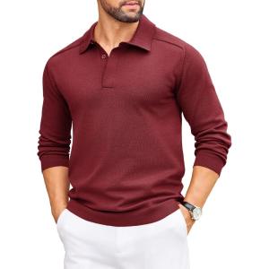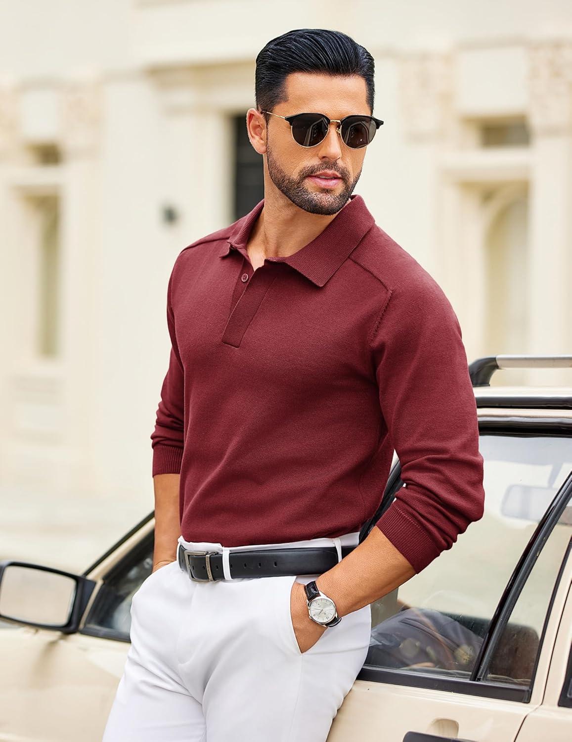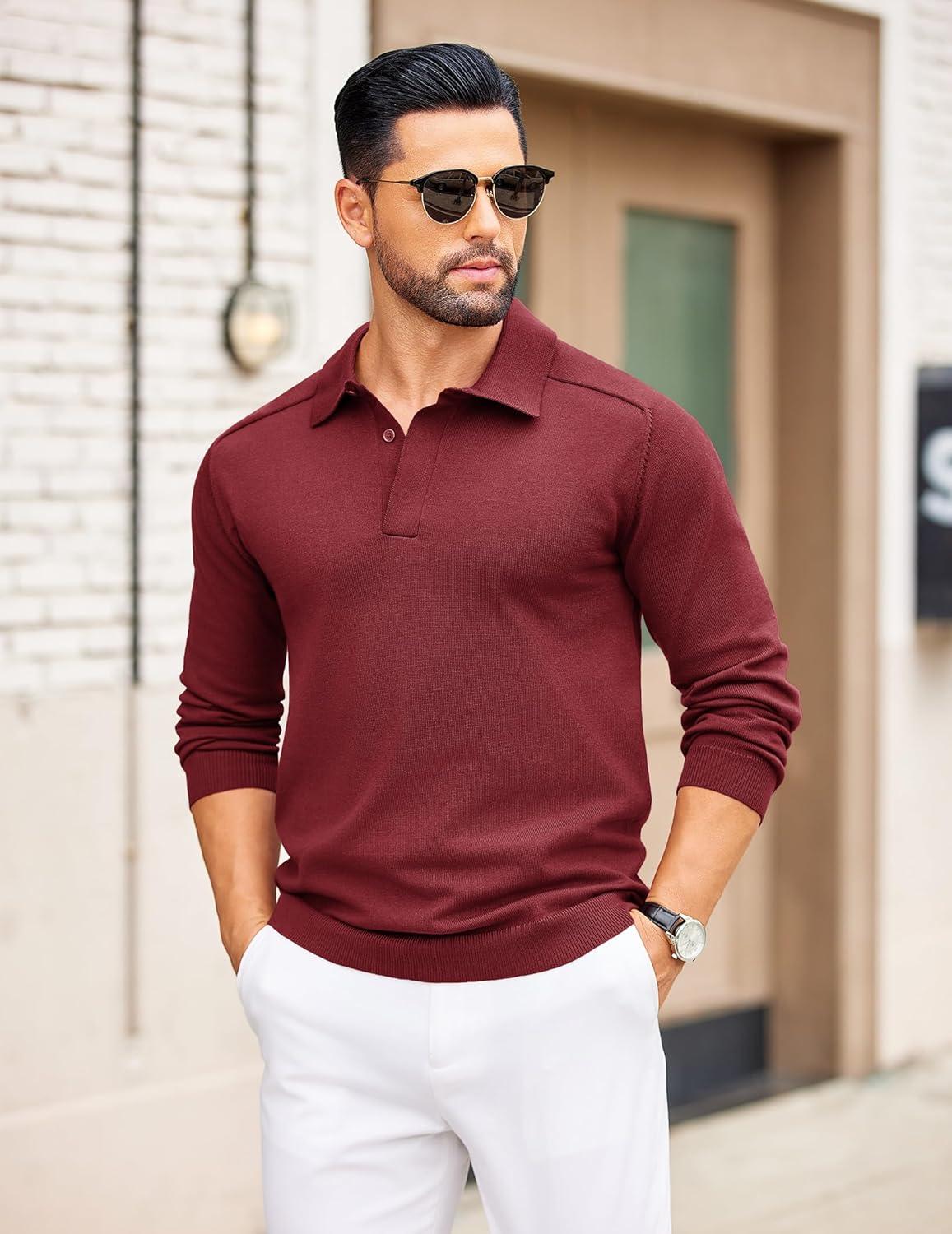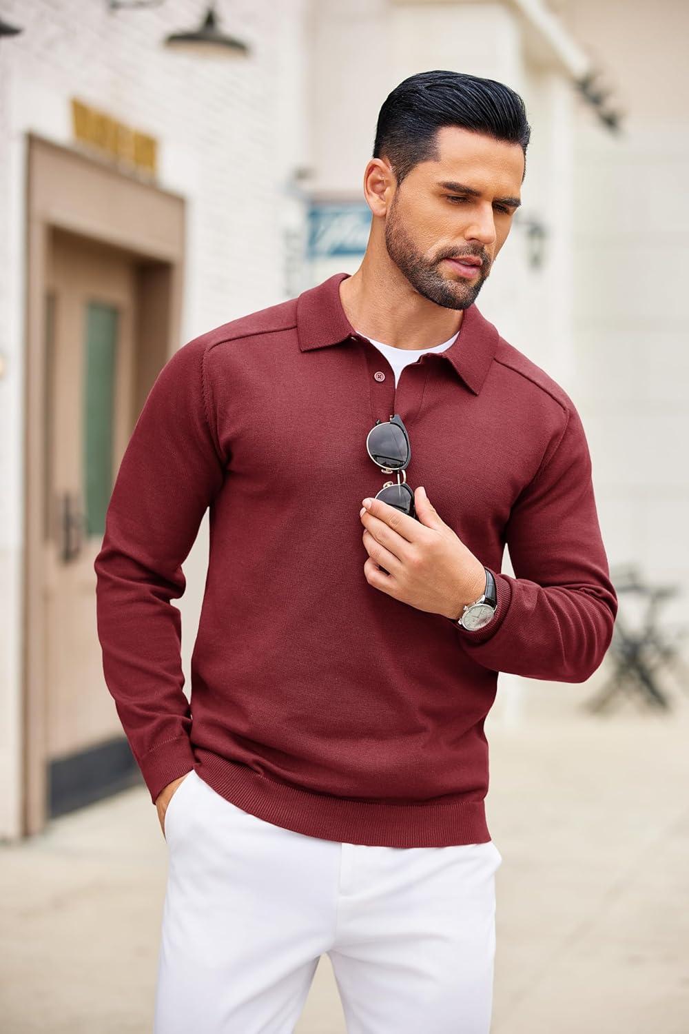 COOFANDY Mens Knit Polo Sweater Long Sleeve Polo Collared Sweaters Hidden Button Casual Pullover Sweater(Wine Red)