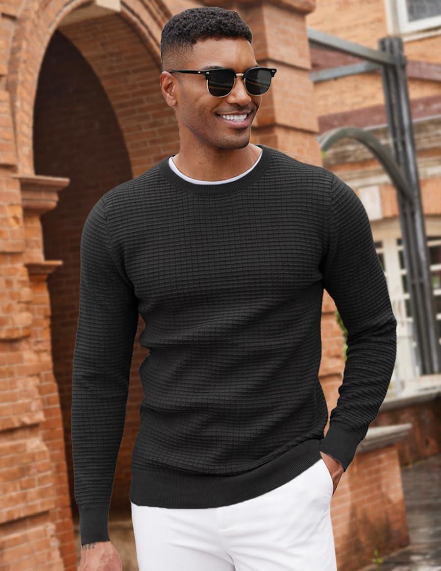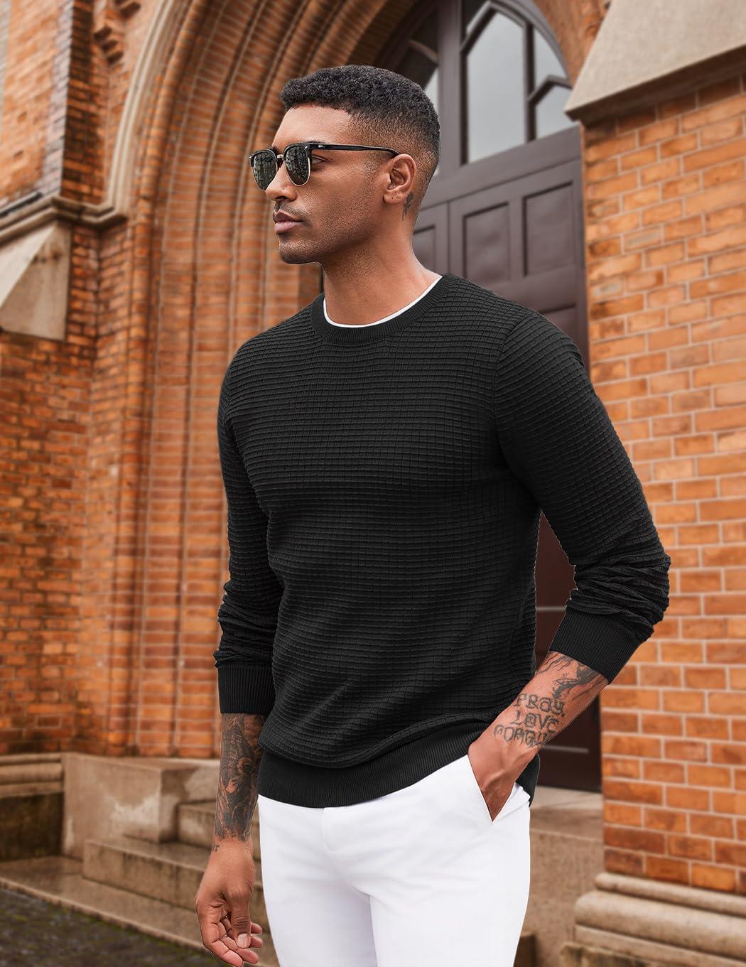 COOFANDY Mens Pullover Sweater Waffle Knit Crewneck Long Sleeve Dress Sweater(Black)