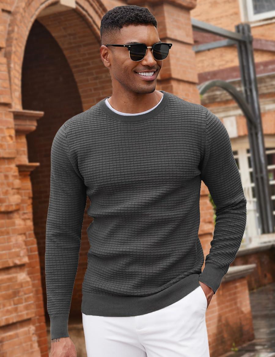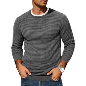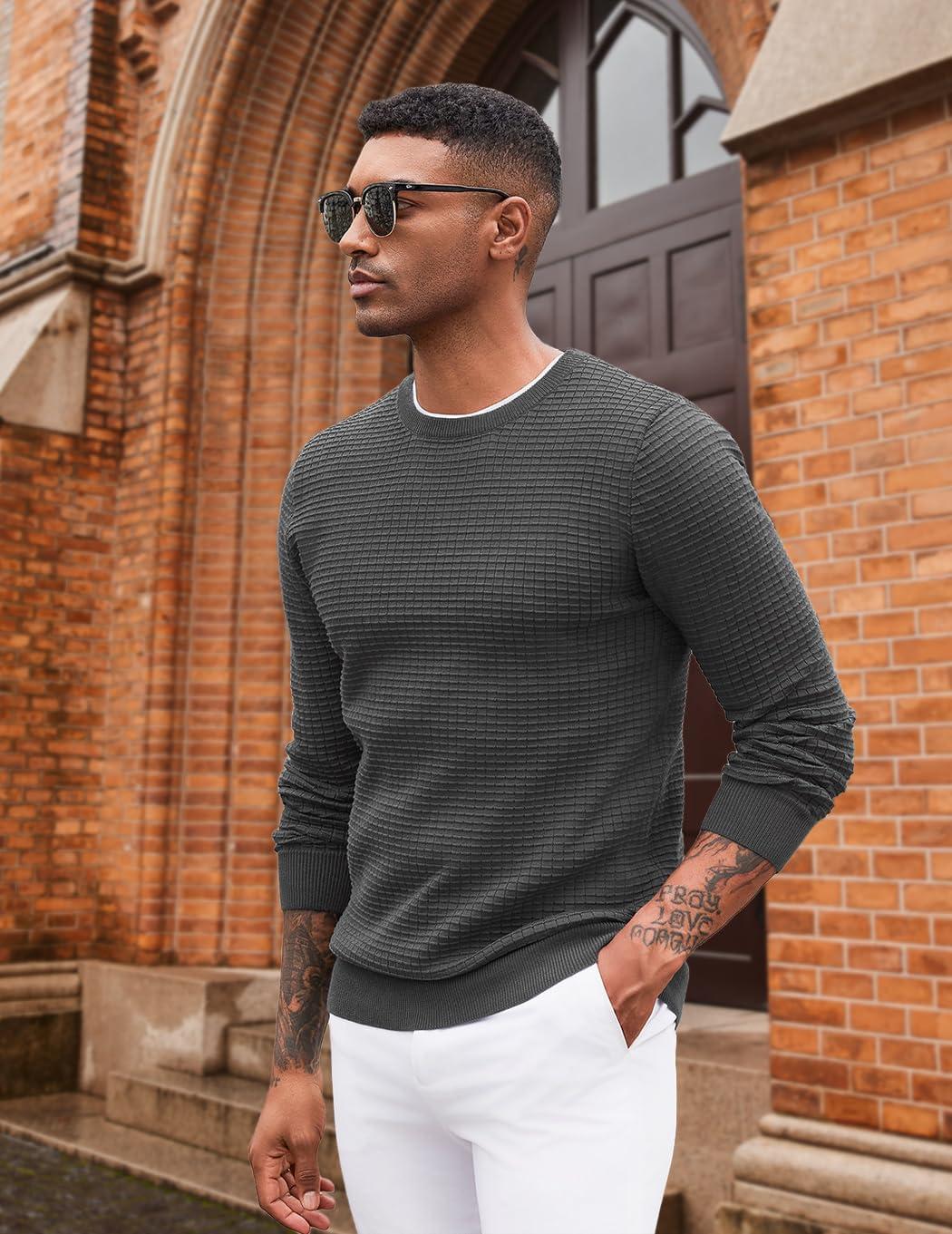 COOFANDY Mens Pullover Sweater Waffle Knit Crewneck Long Sleeve Dress Sweater(Dark Grey)