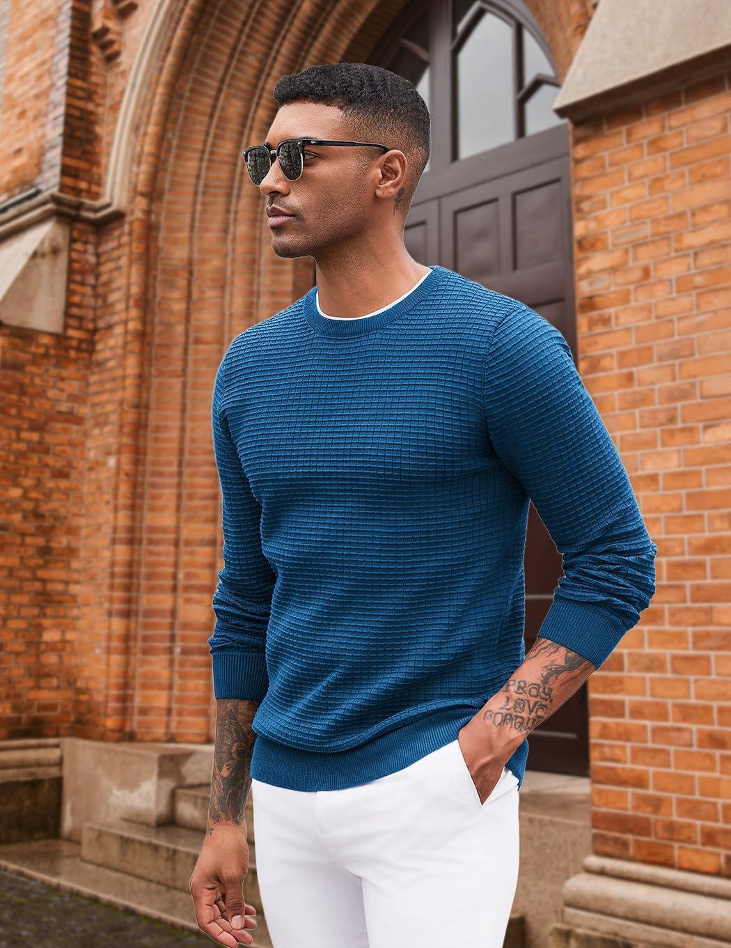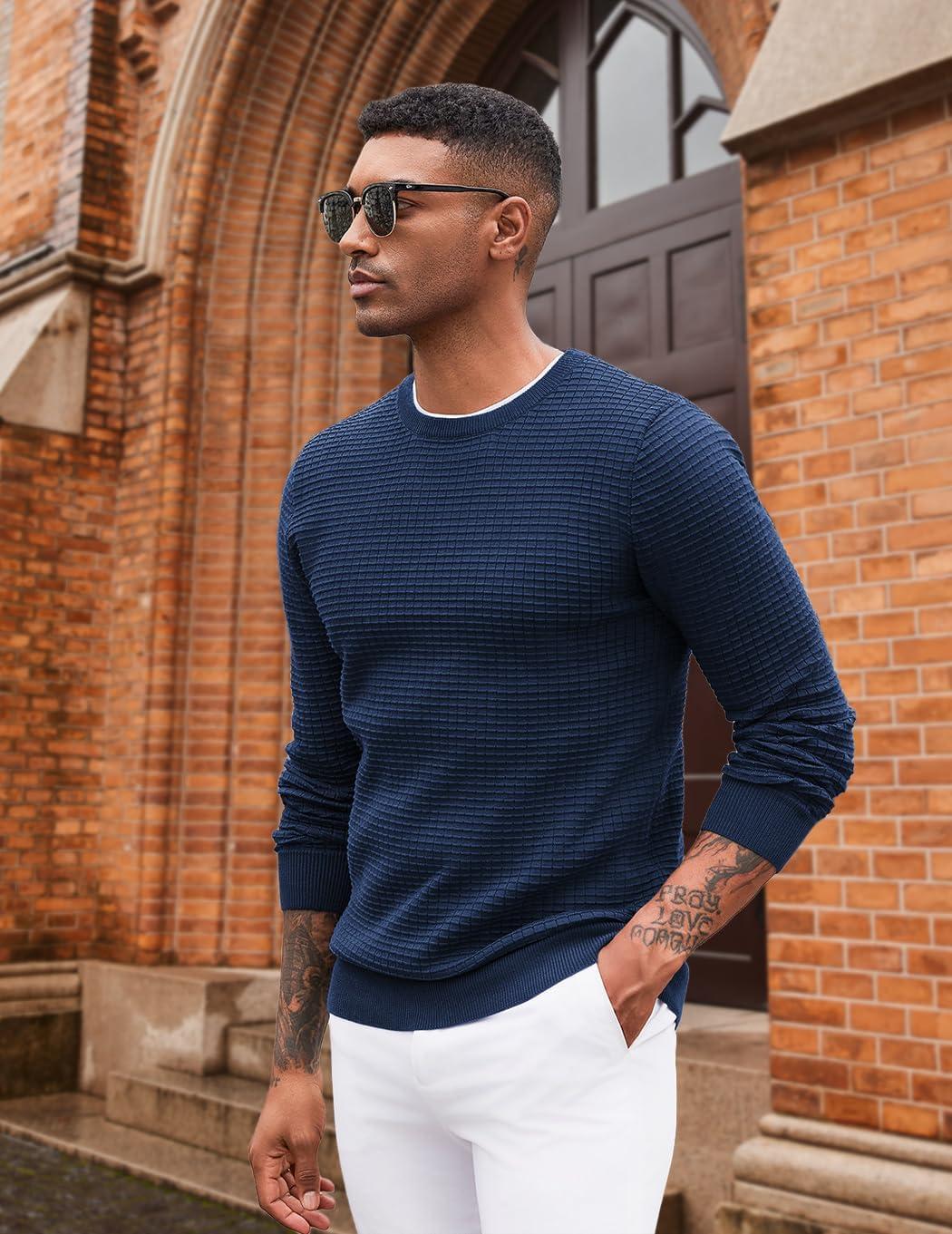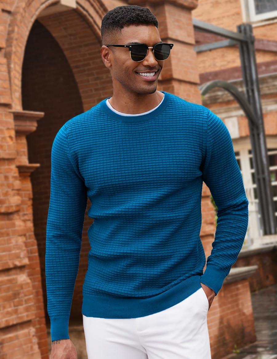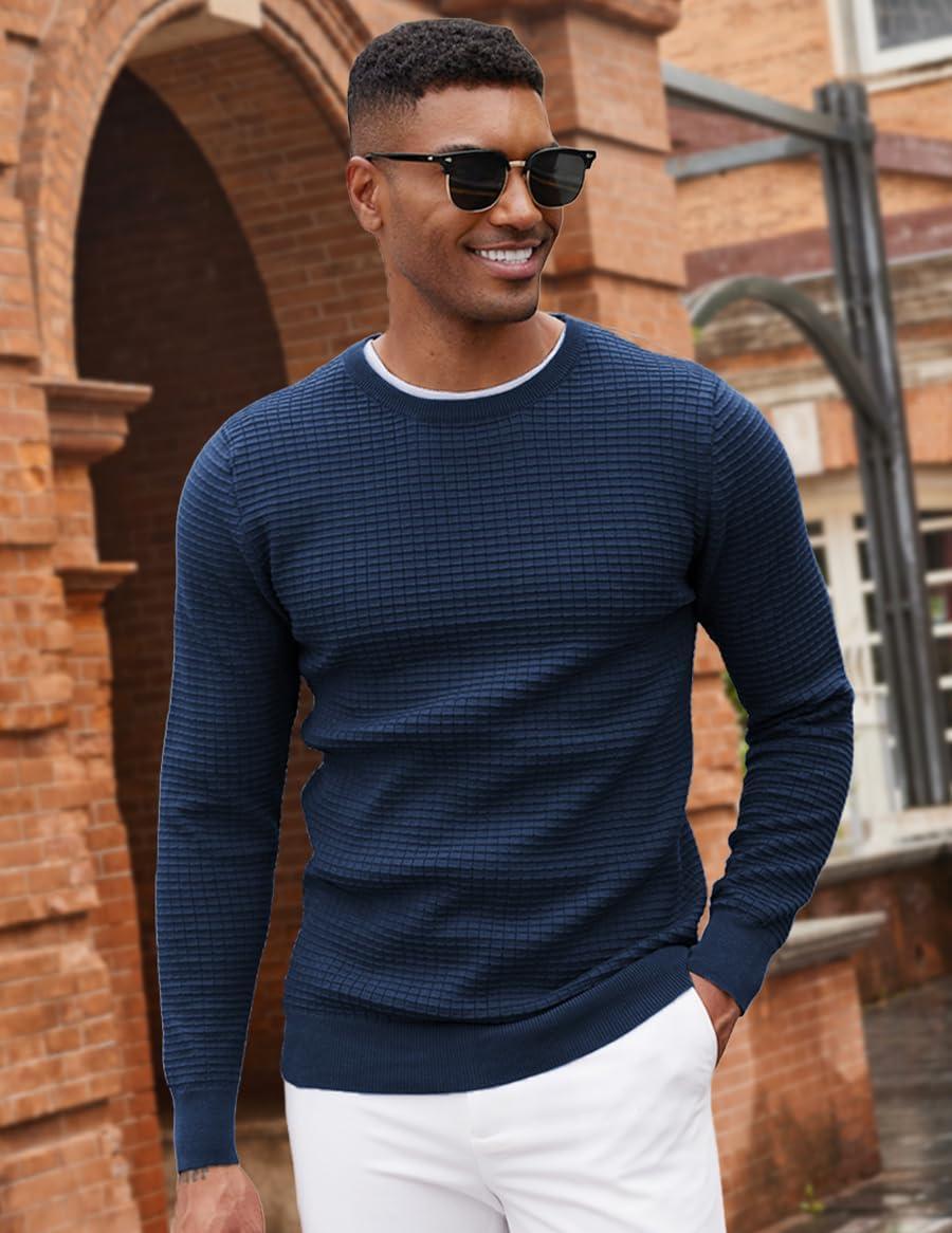 COOFANDY Mens Pullover Sweater Waffle Knit Crewneck Long Sleeve Dress Sweater(Deep Blue)
