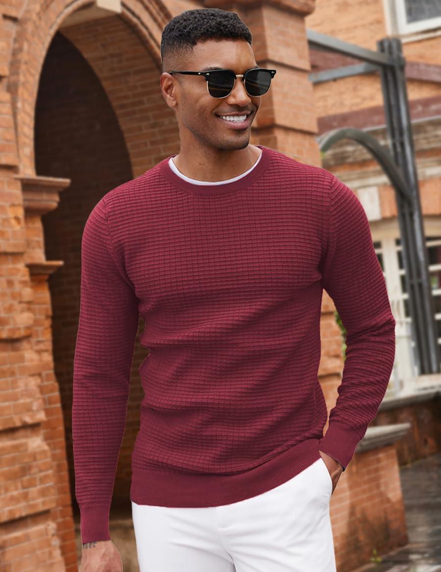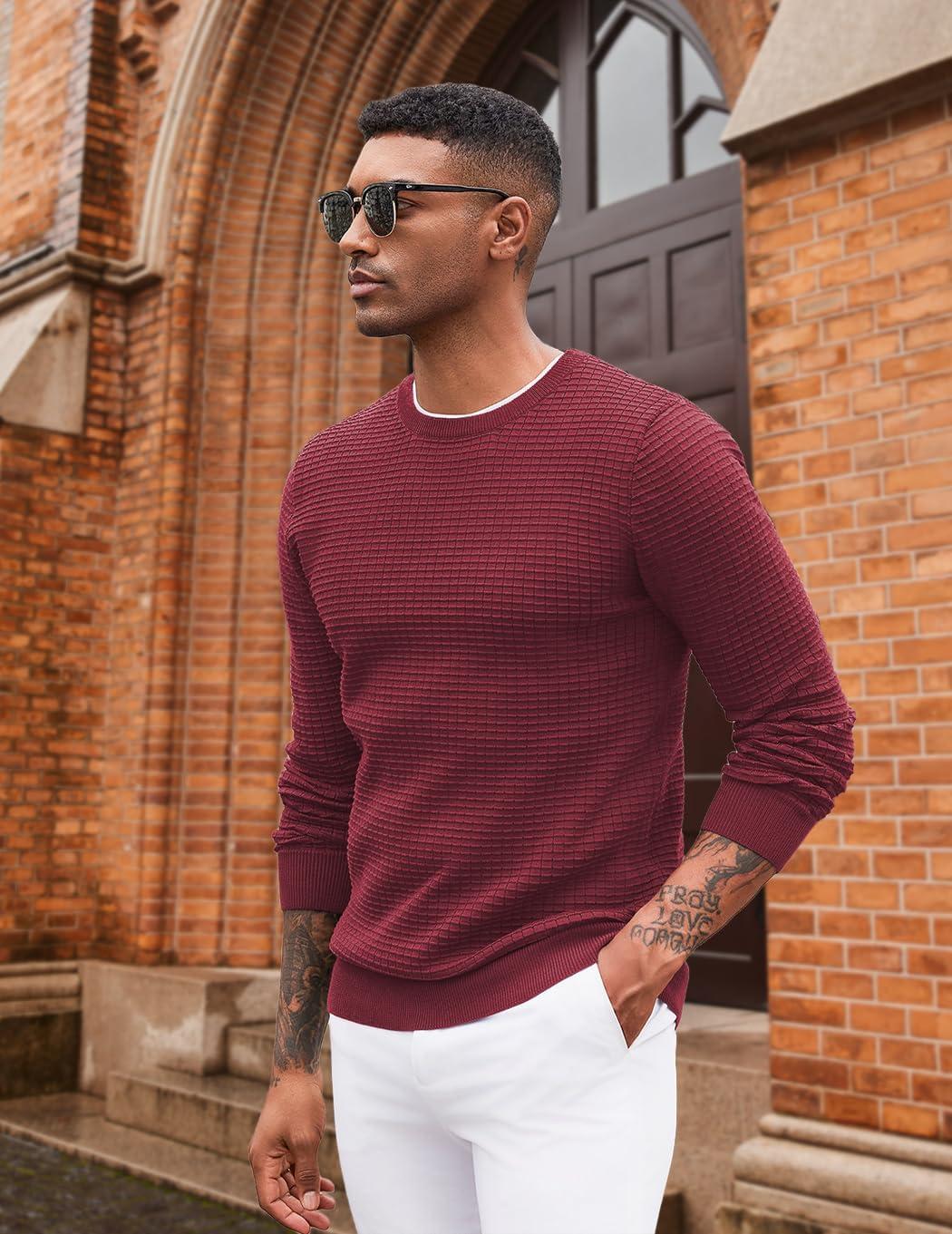 COOFANDY Mens Pullover Sweater Waffle Knit Crewneck Long Sleeve Dress Sweater(Deep Red)