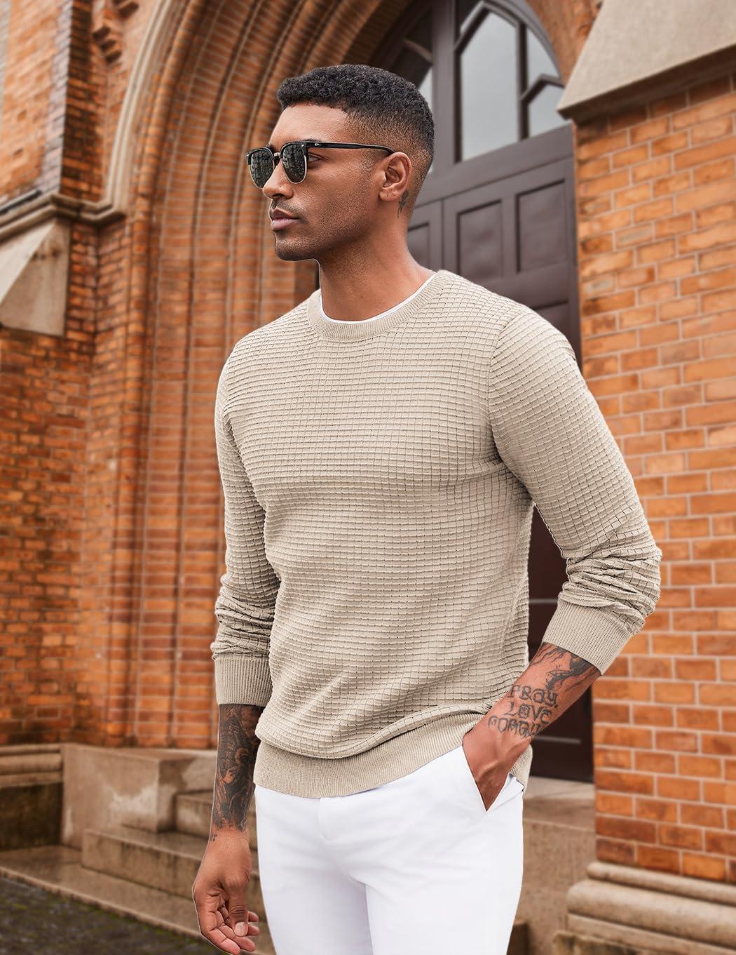 COOFANDY Mens Pullover Sweater Waffle Knit Crewneck Long Sleeve Dress Sweater(Khaki)