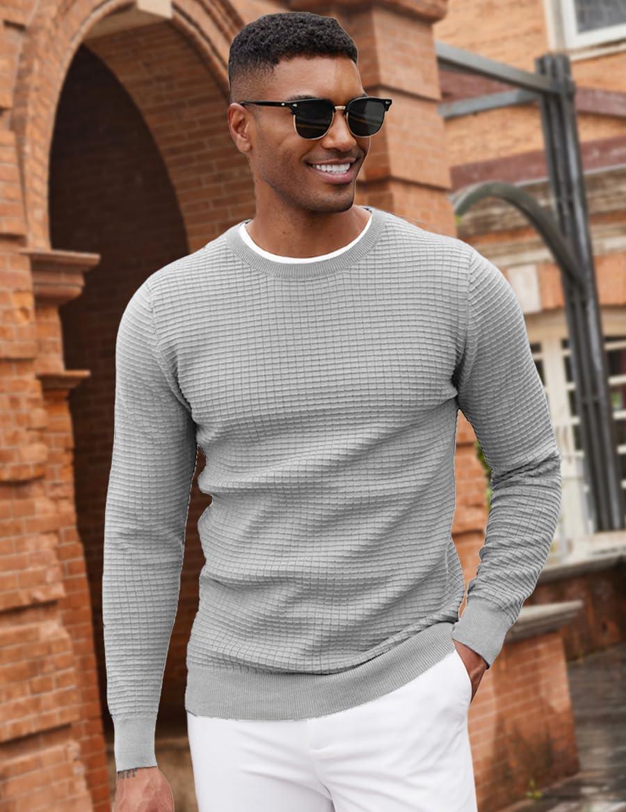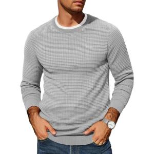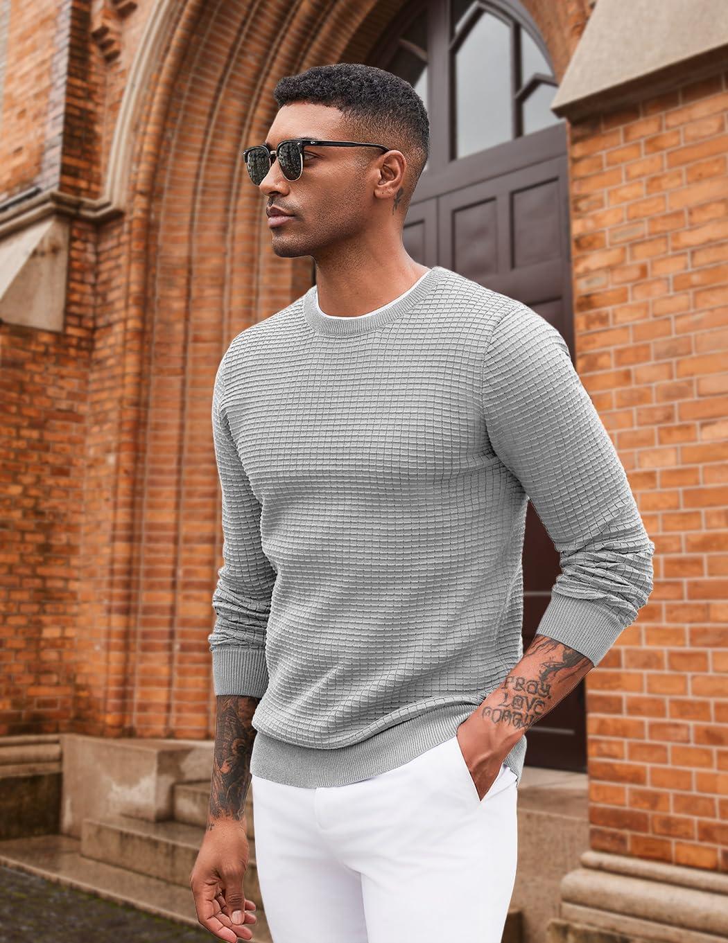 COOFANDY Mens Pullover Sweater Waffle Knit Crewneck Long Sleeve Dress Sweater(Light Grey)