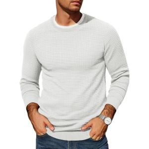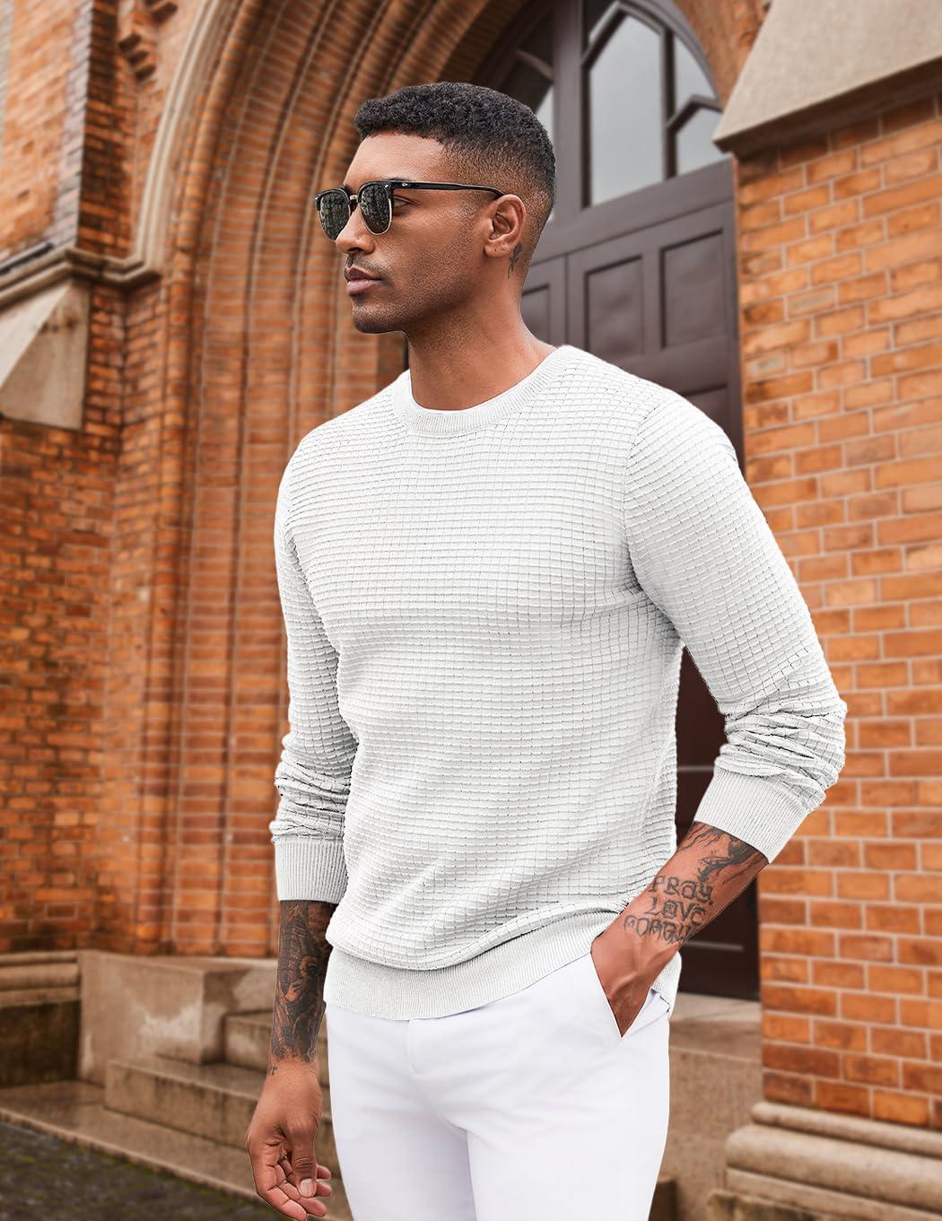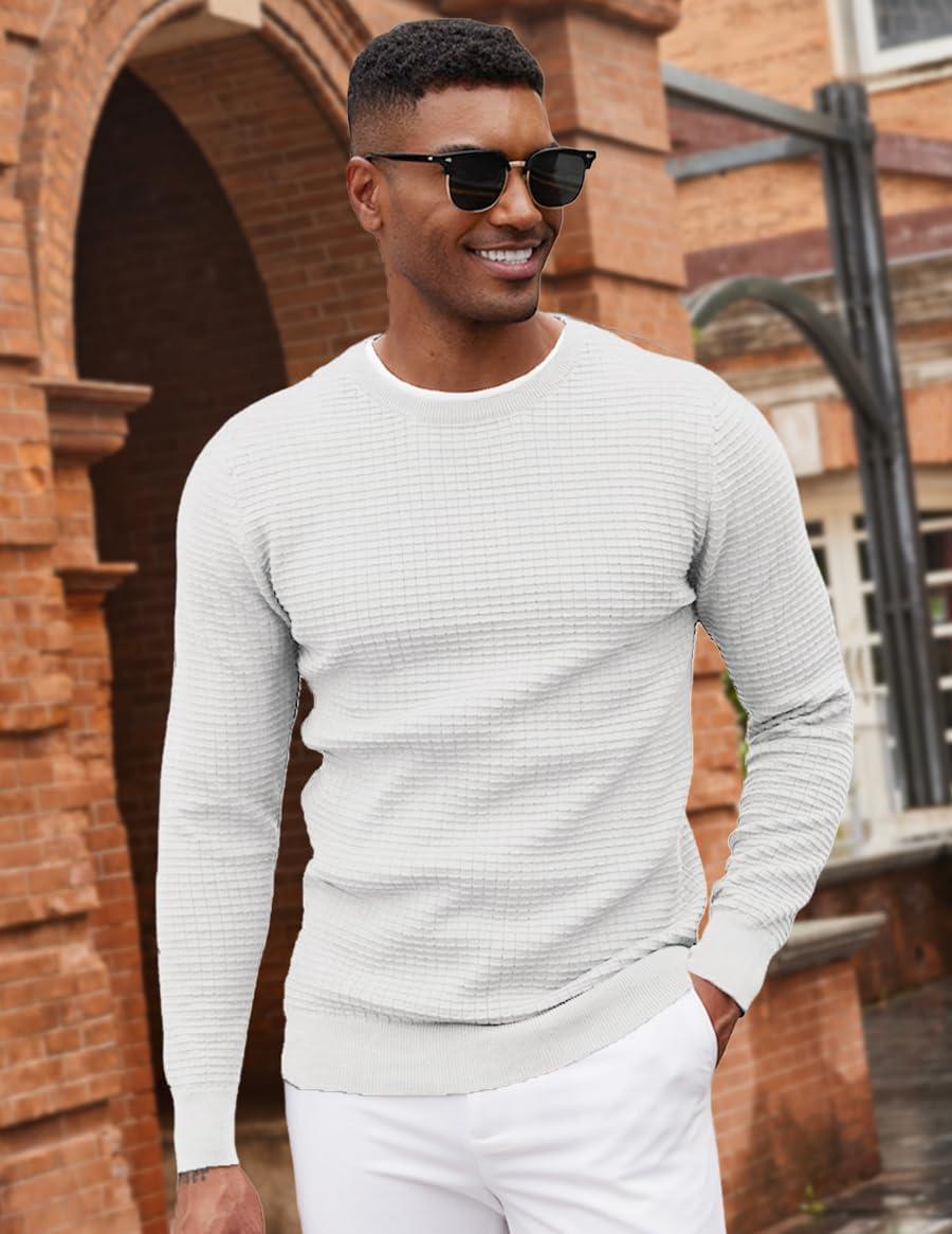 COOFANDY Mens Pullover Sweater Waffle Knit Crewneck Long Sleeve Dress Sweater(White)