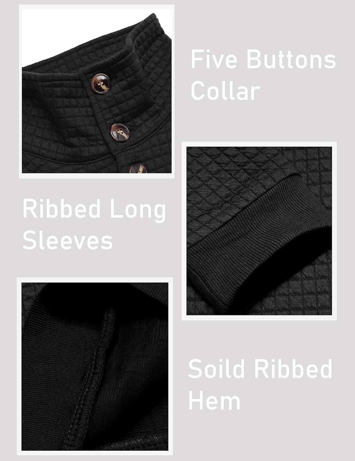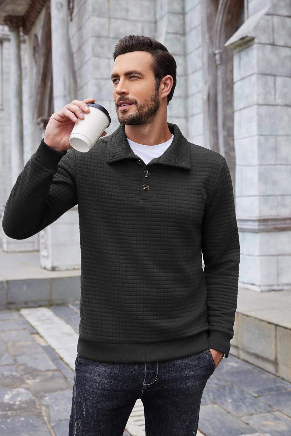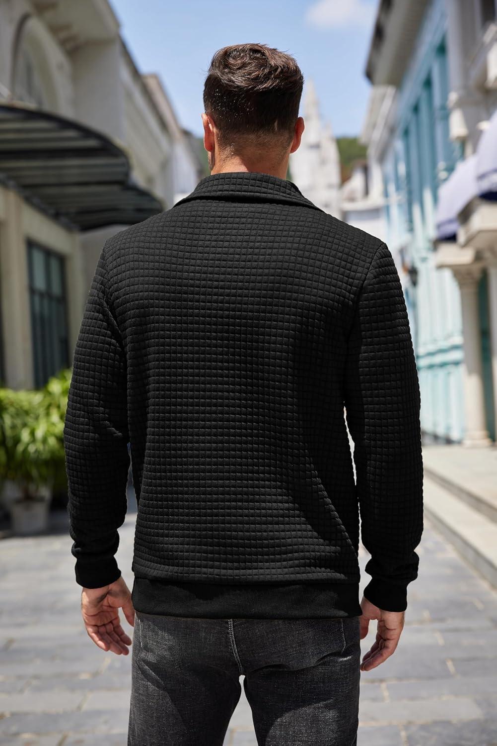 COOFANDY Mens Quarter Pullover Quilted Sweatshirt Casual Knit Long Sleeve Mock Neck Sweater Waffle Collared Pullover(Black)