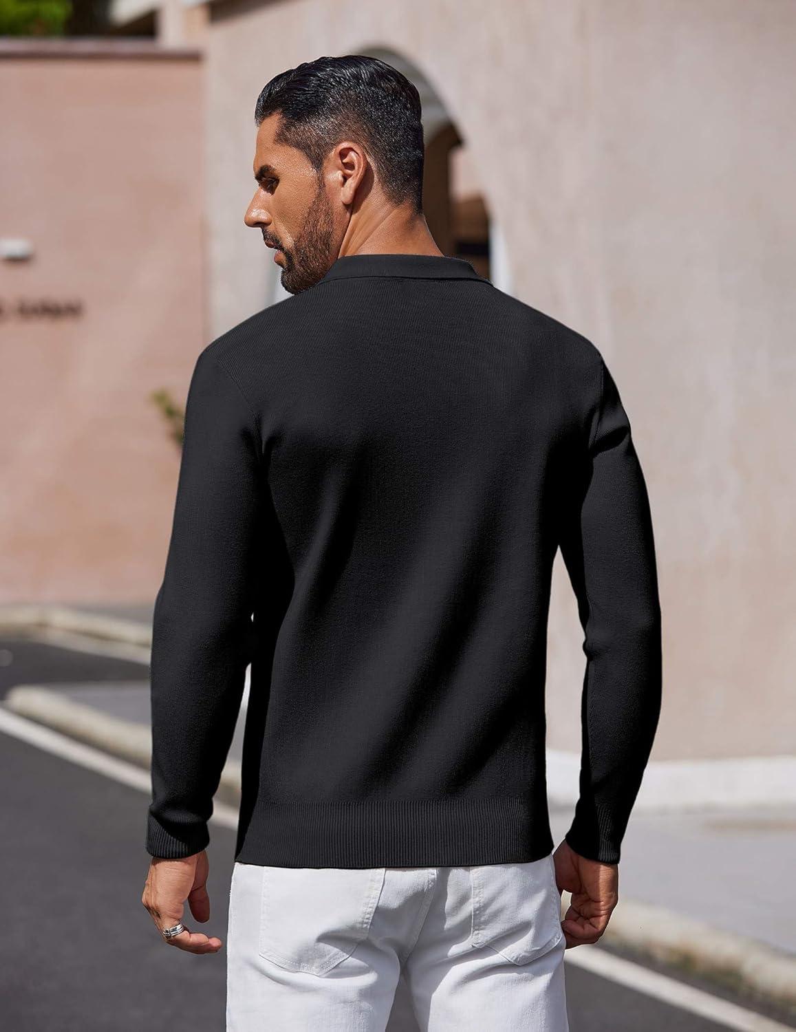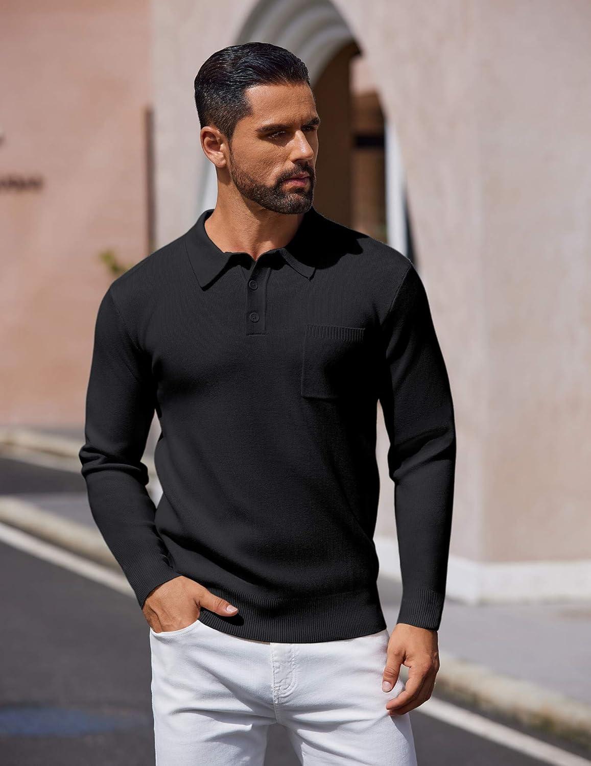 COOFANDY Mens Long Sleeve Polo Sweater Knit Polo Casual Thermal Pullover Sweater with Pocket(Black)