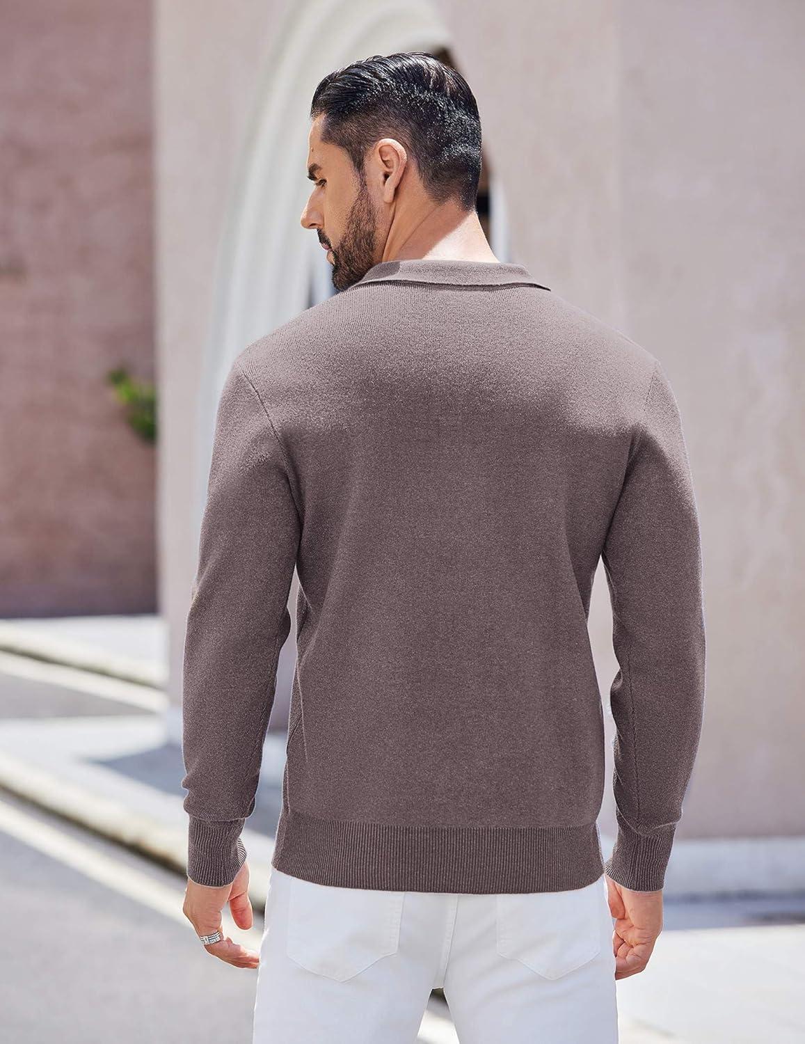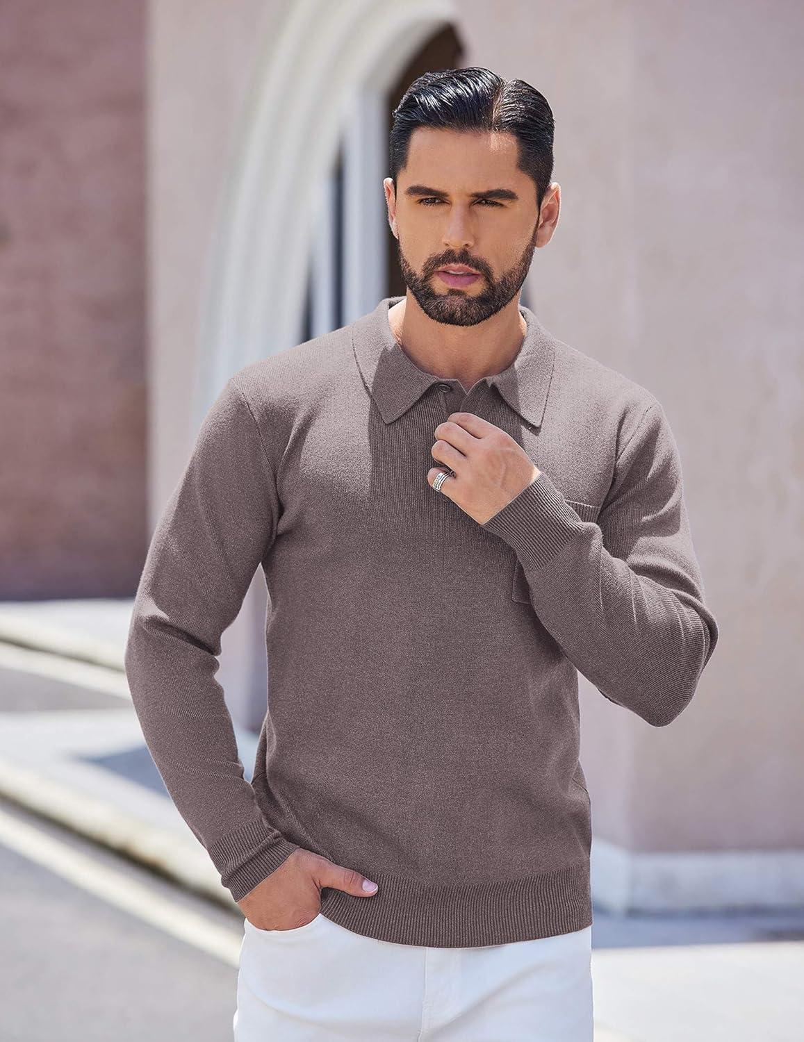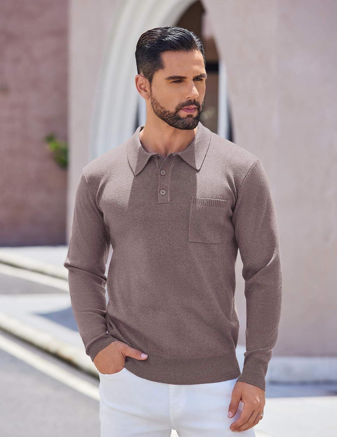 COOFANDY Mens Long Sleeve Polo Sweater Knit Polo Casual Thermal Pullover Sweater with Pocket(Brown)
