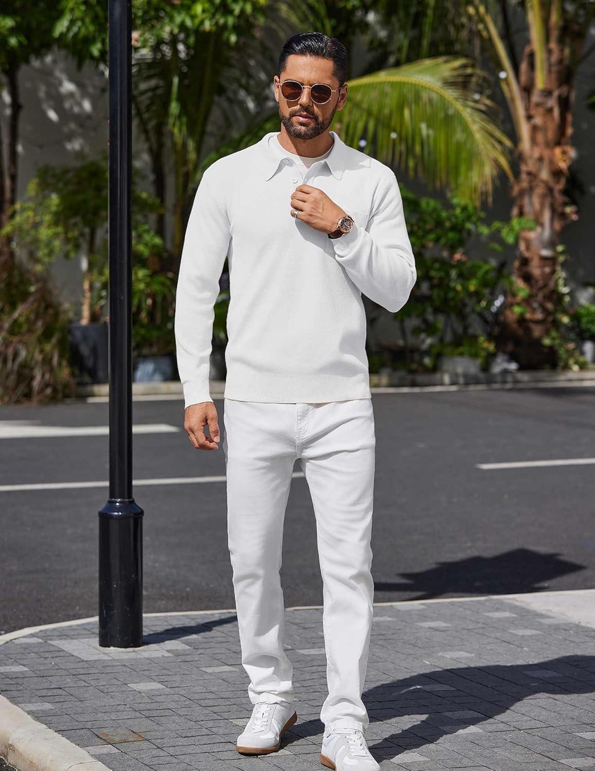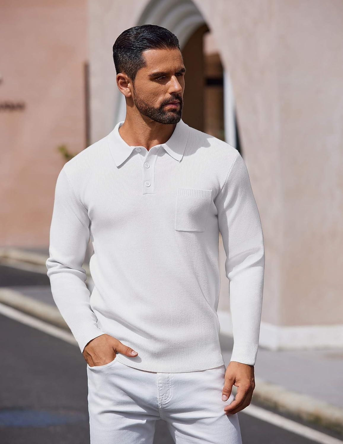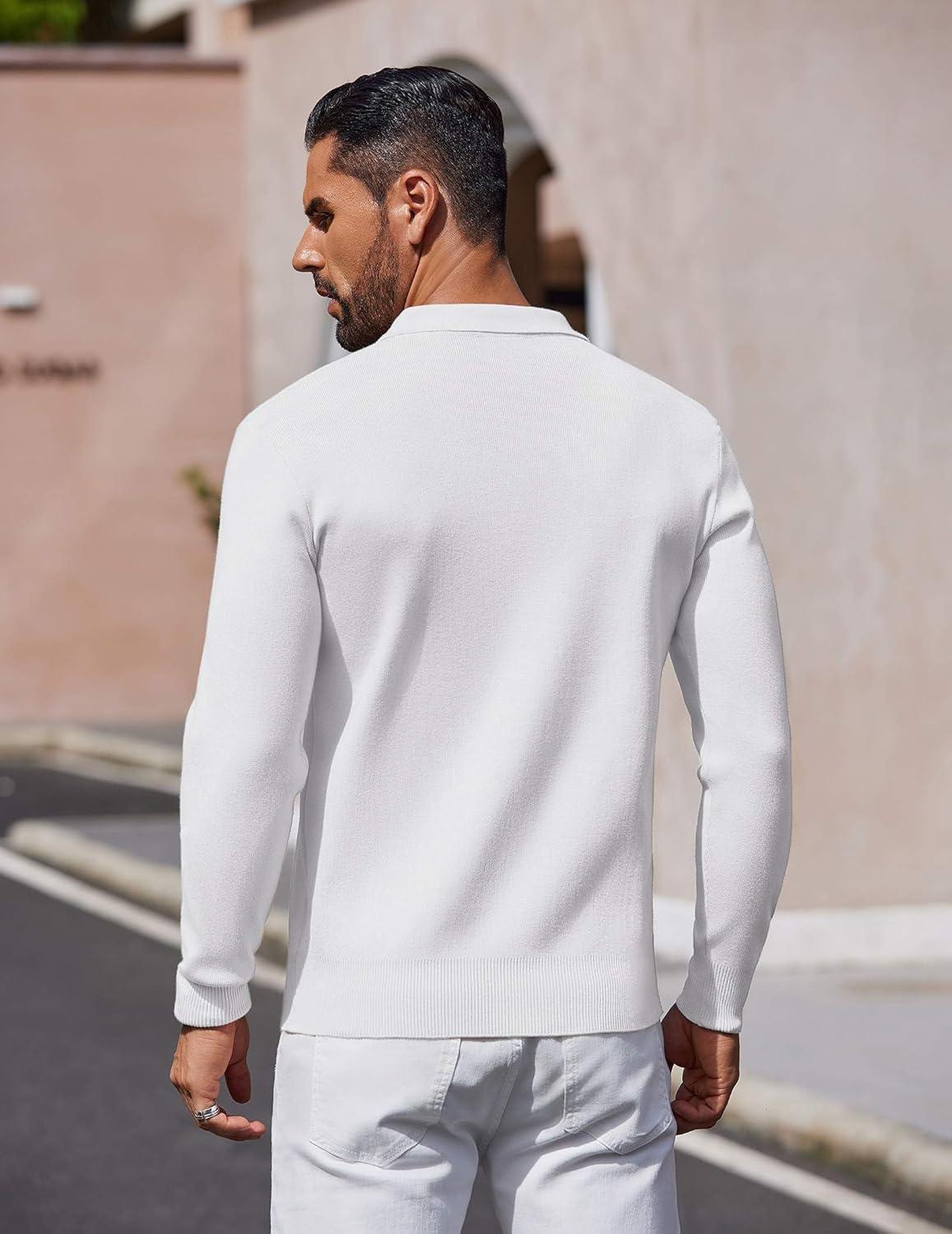 COOFANDY Mens Long Sleeve Polo Sweater Knit Polo Casual Thermal Pullover Sweater with Pocket(White)