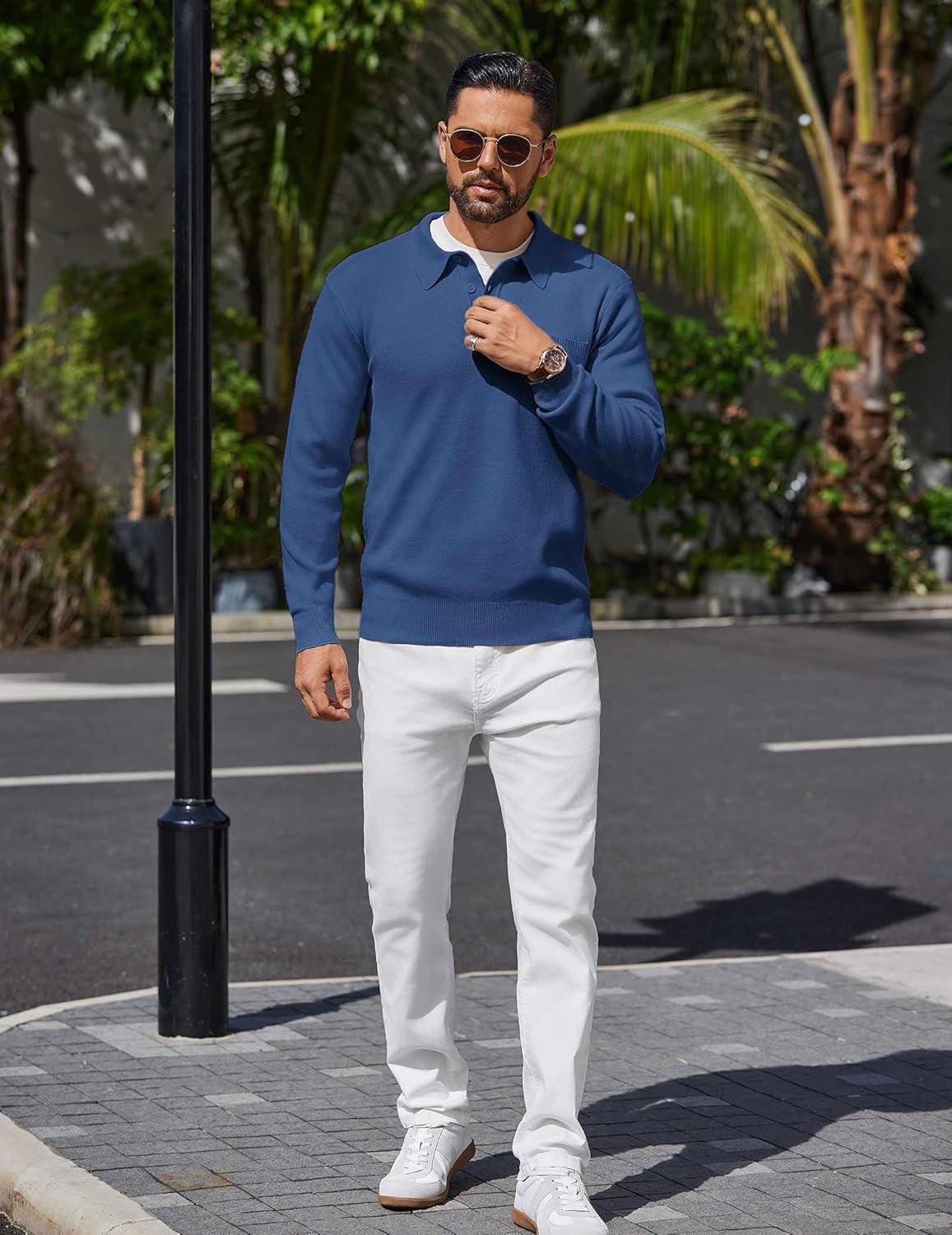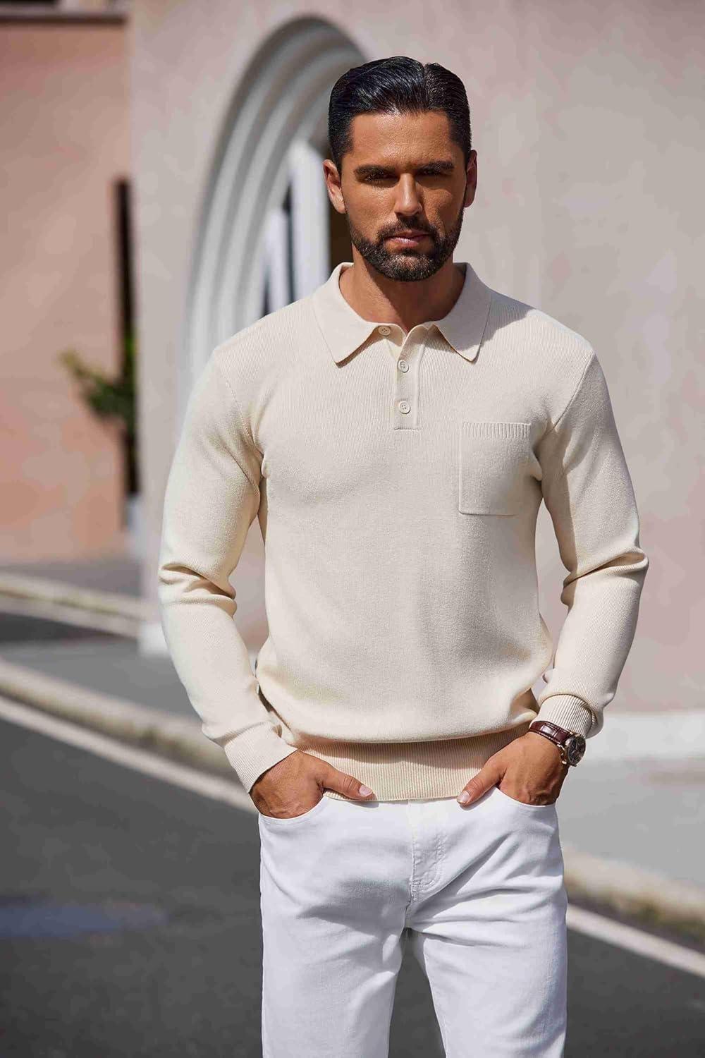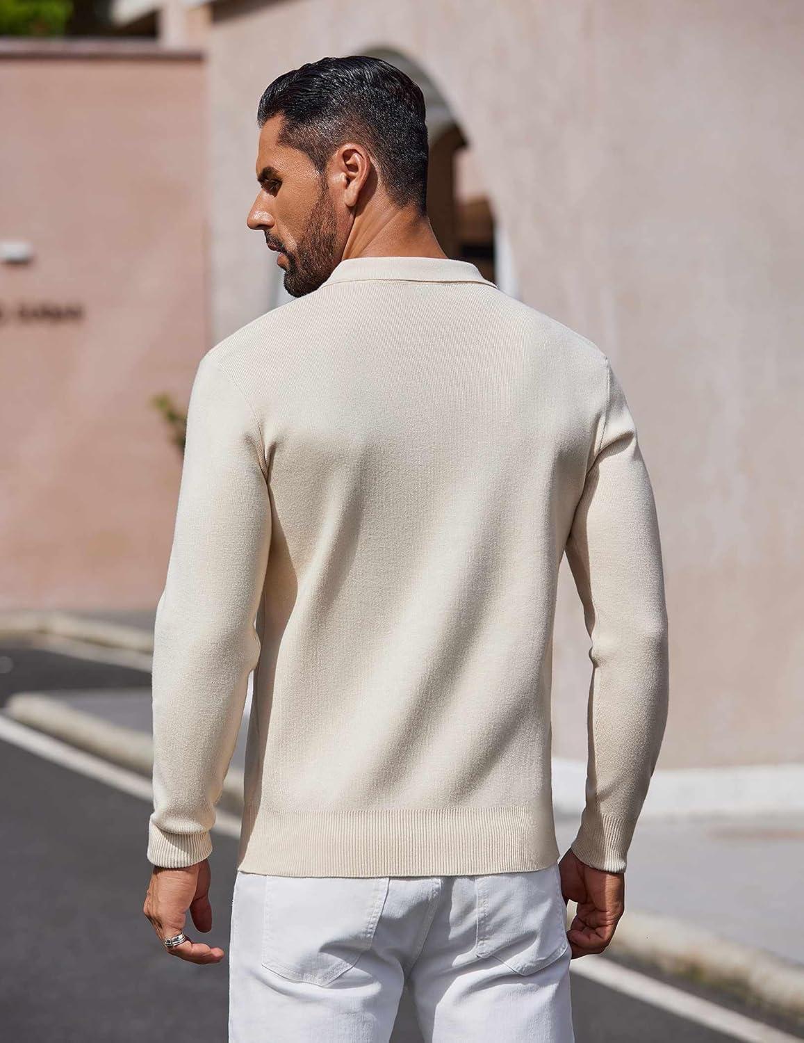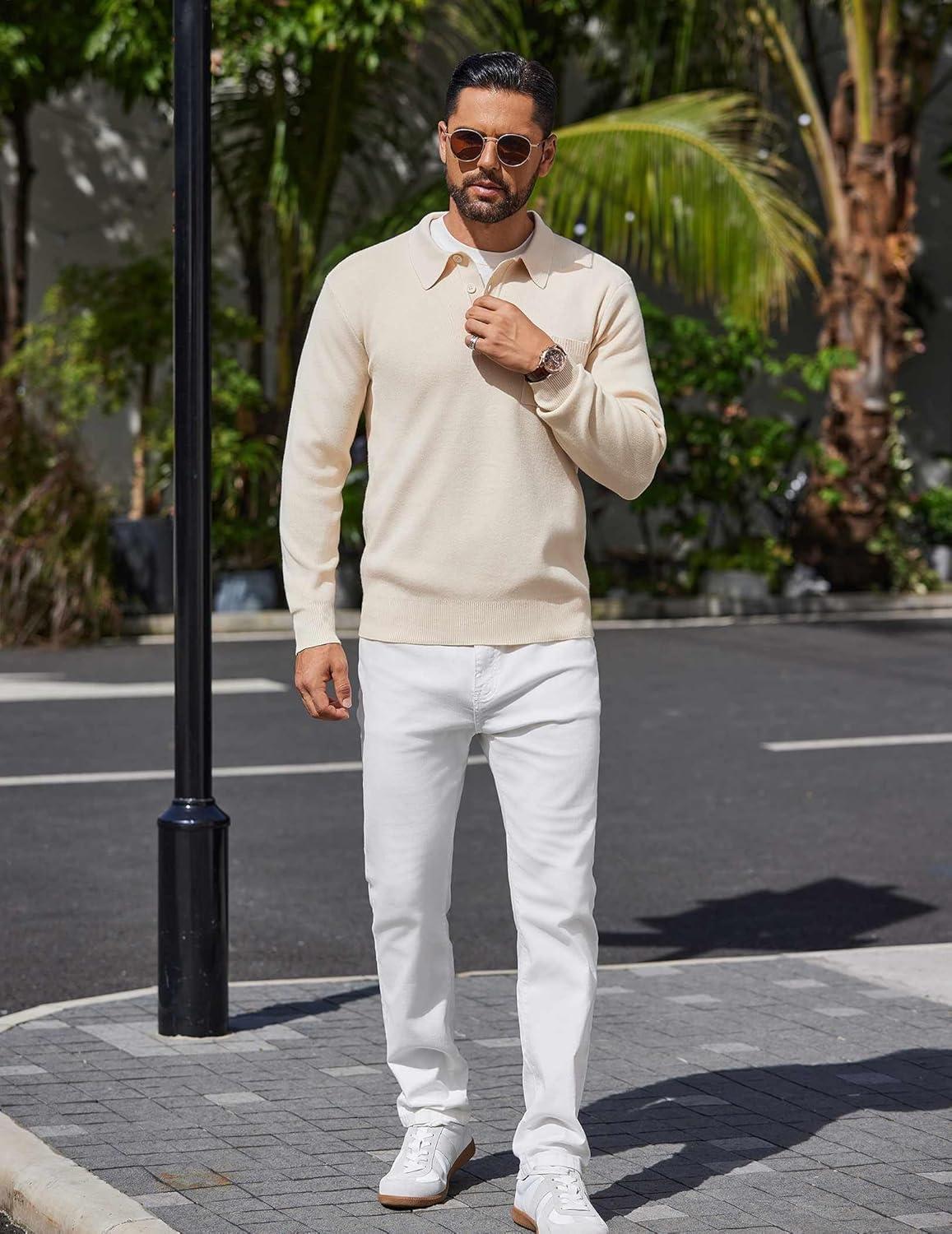 COOFANDY Mens Long Sleeve Polo Sweater Knit Polo Casual Thermal Pullover Sweater with Pocket(White)