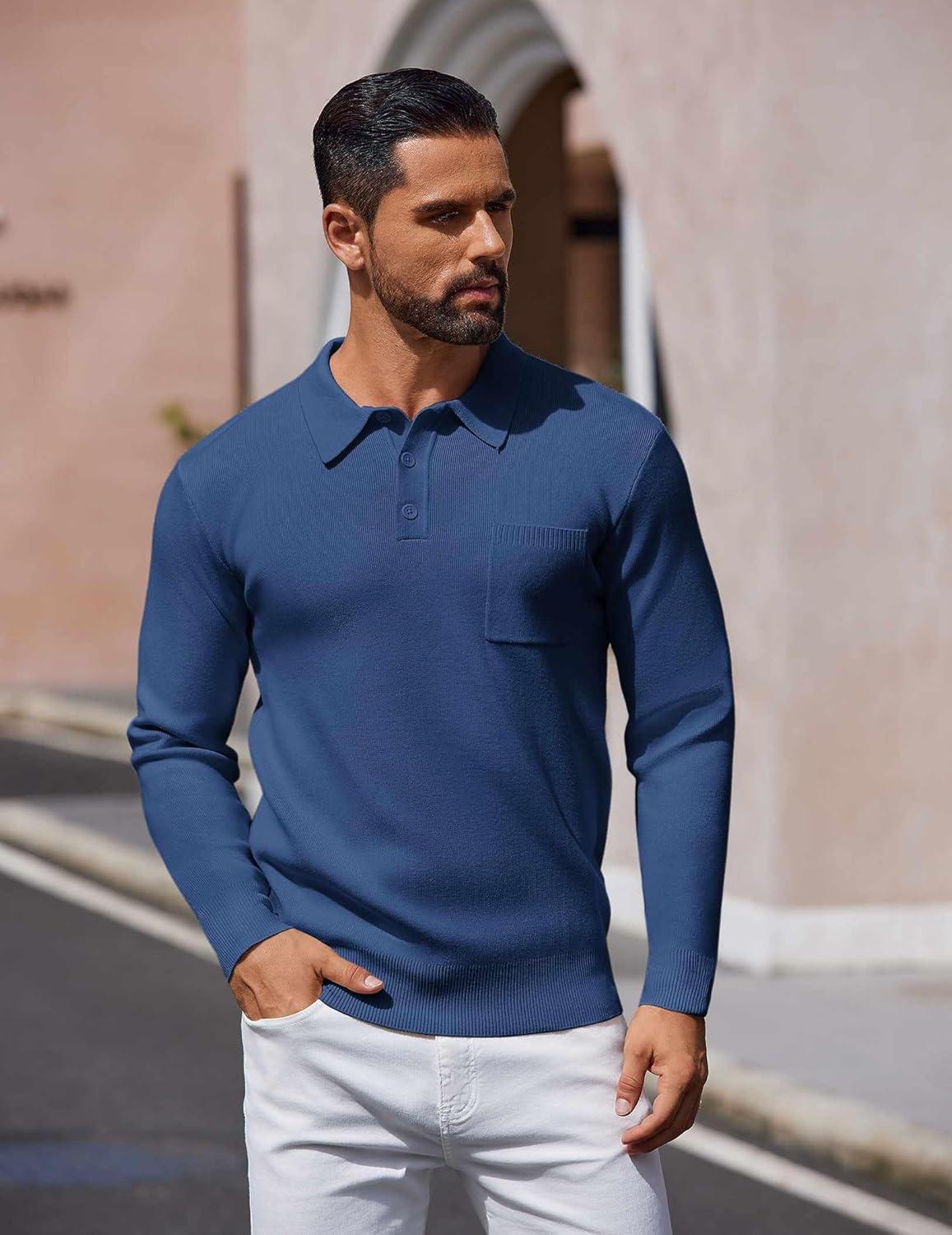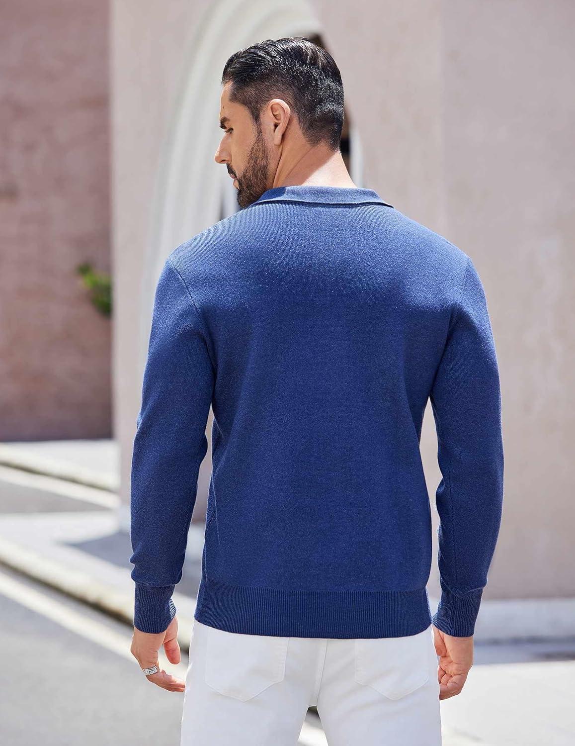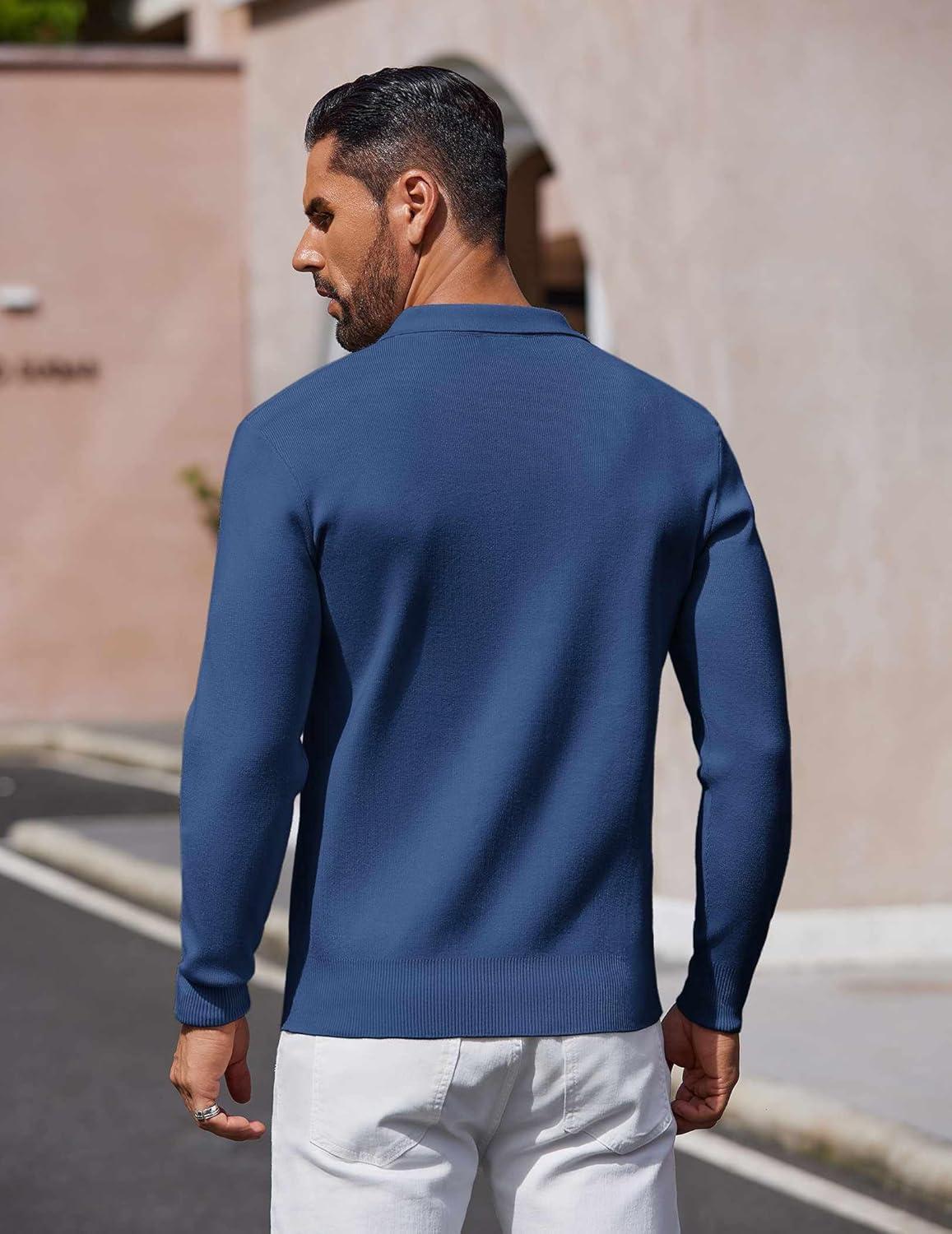 COOFANDY Mens Long Sleeve Polo Sweater Knit Polo Casual Thermal Pullover Sweater with Pocket(Dark Blue)