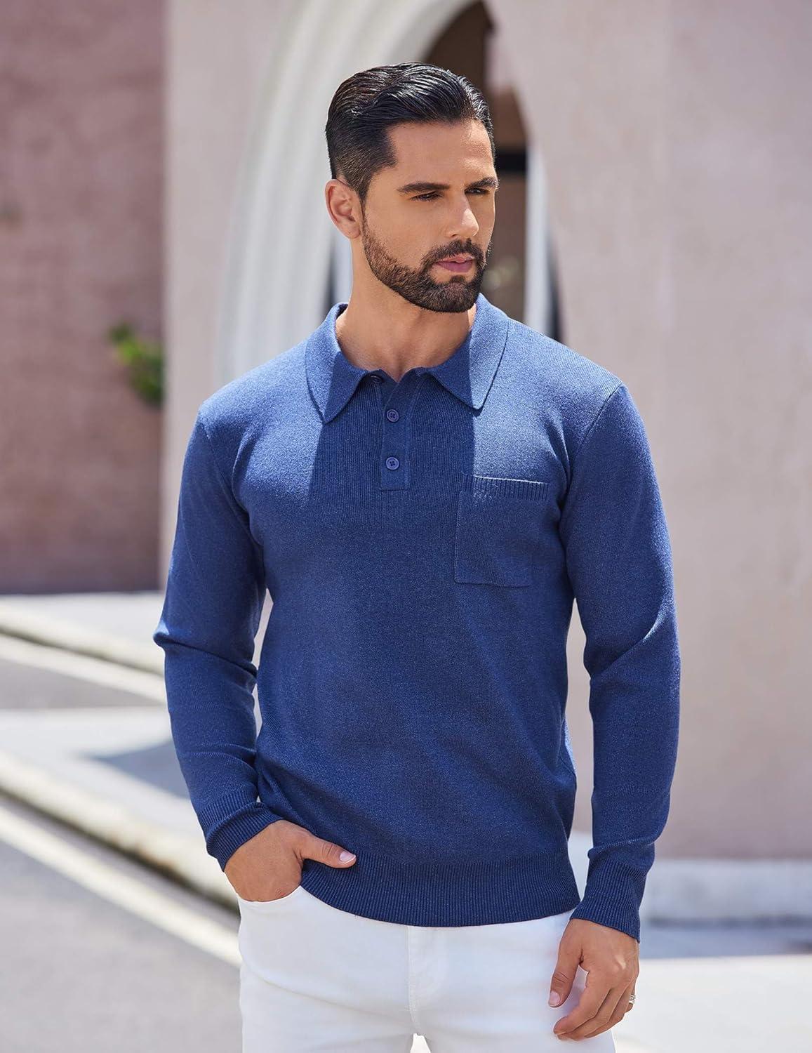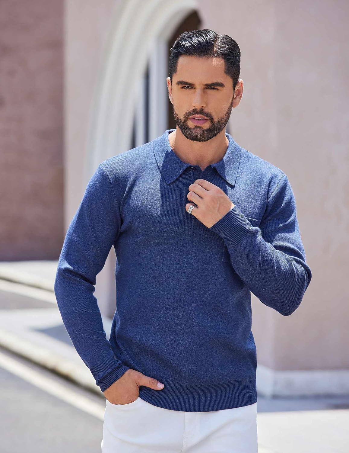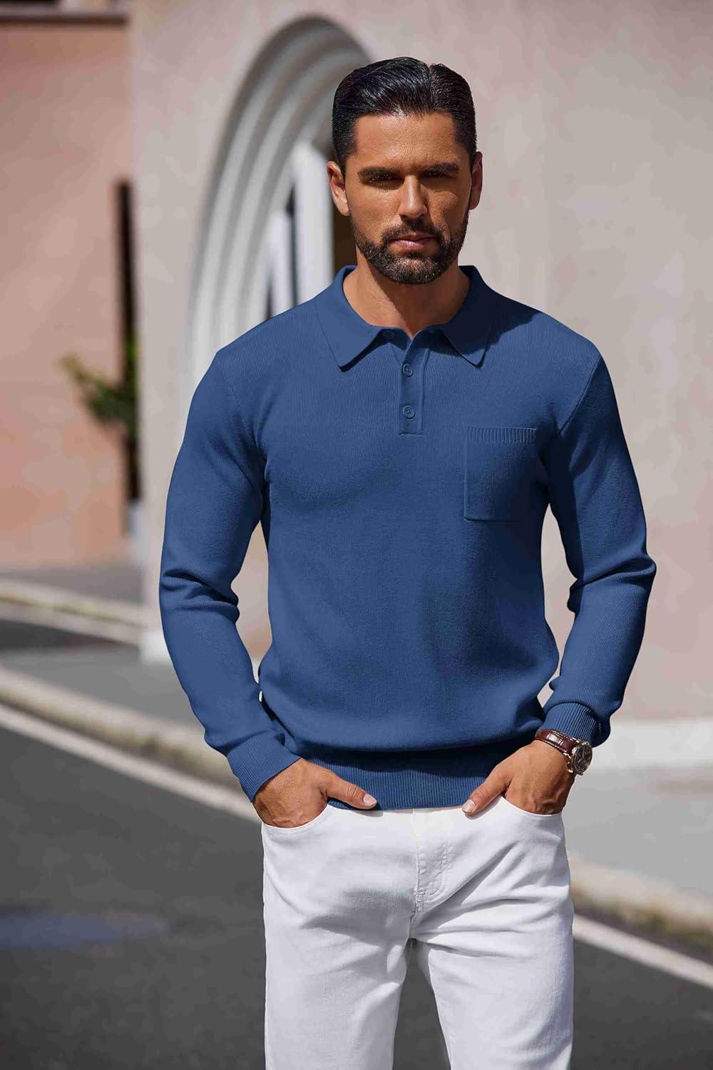 COOFANDY Mens Long Sleeve Polo Sweater Knit Polo Casual Thermal Pullover Sweater with Pocket(Dark Blue)
