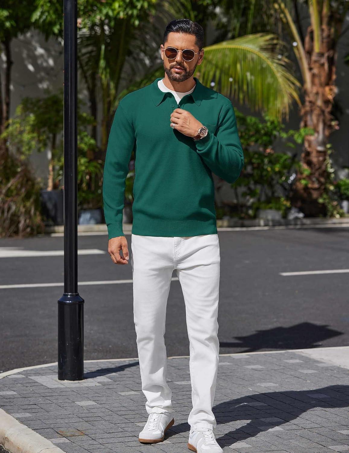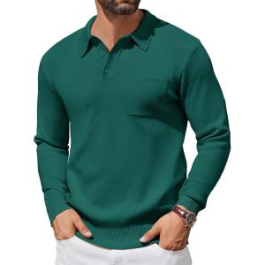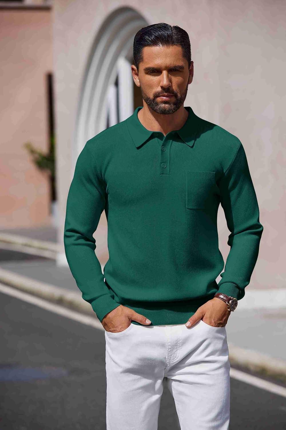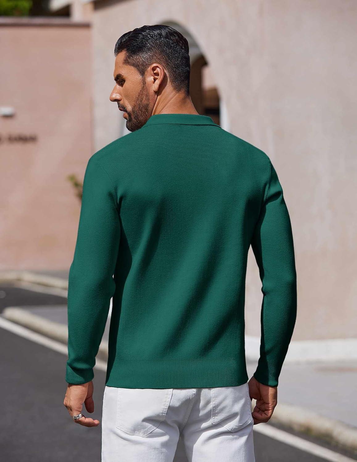 COOFANDY Mens Long Sleeve Polo Sweater Knit Polo Casual Thermal Pullover Sweater with Pocket(Green)