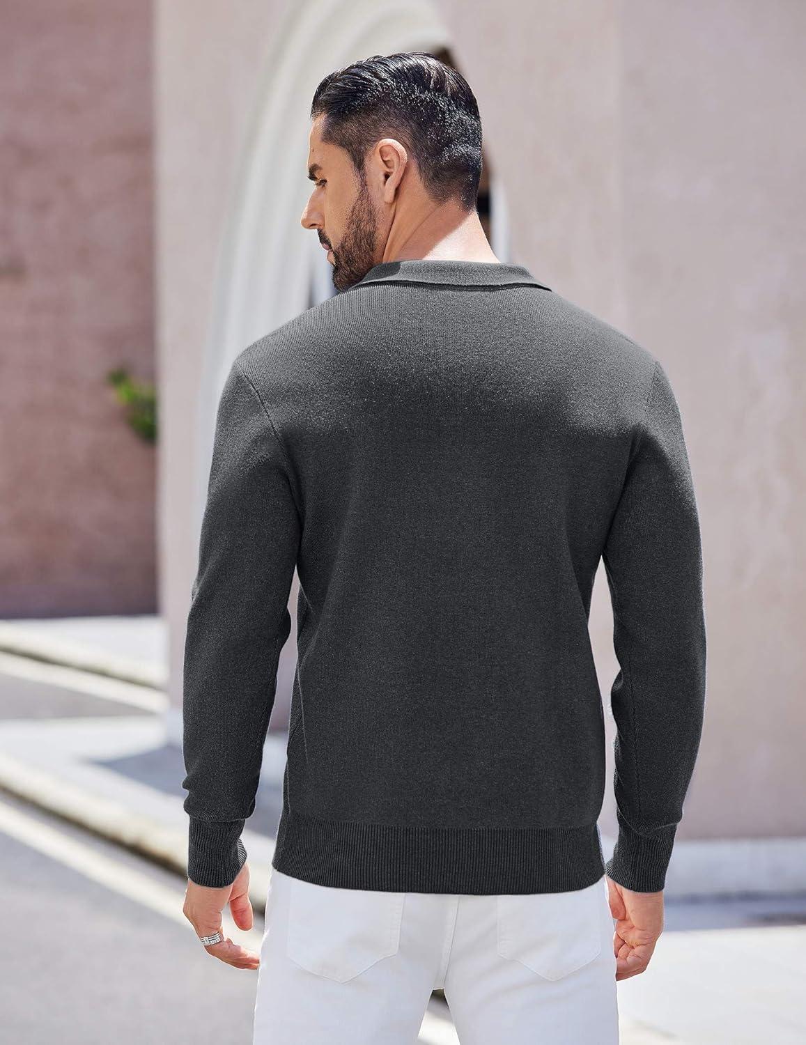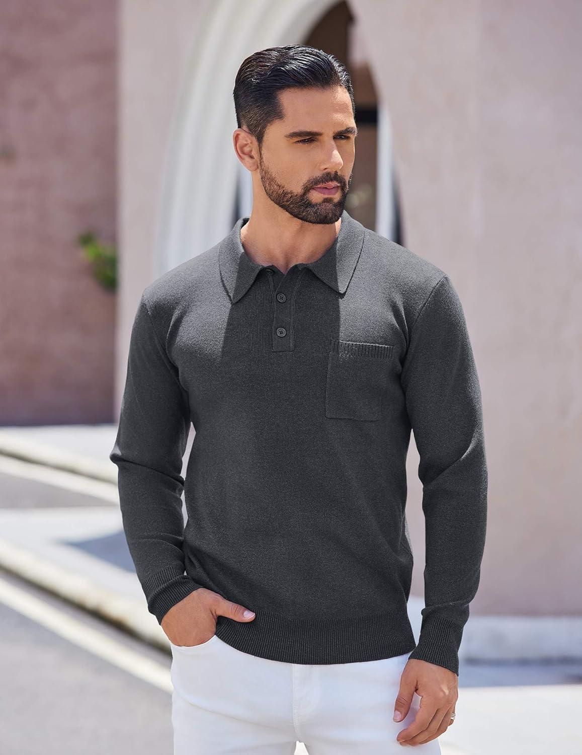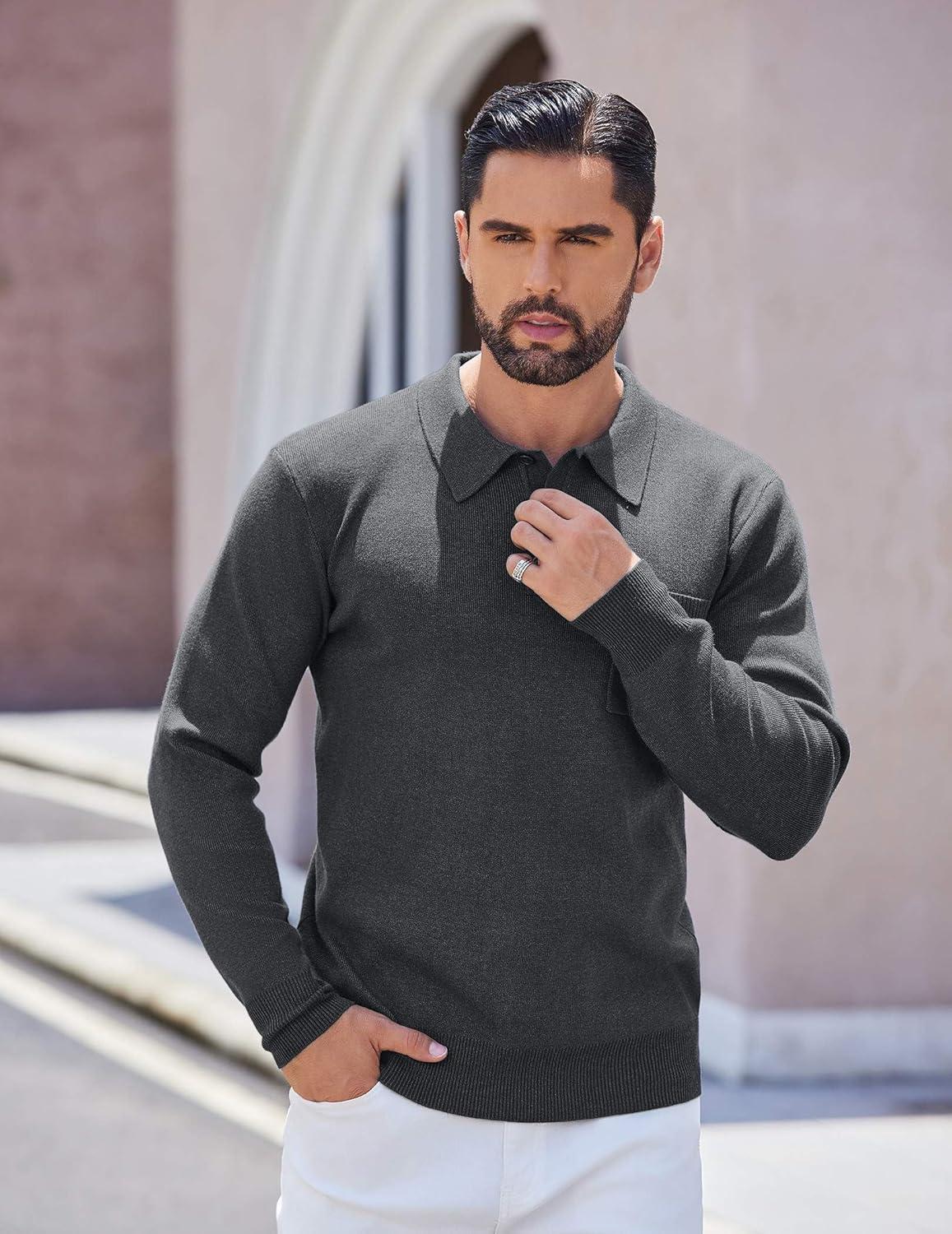 COOFANDY Mens Long Sleeve Polo Sweater Knit Polo Casual Thermal Pullover Sweater with Pocket(Dark Grey)