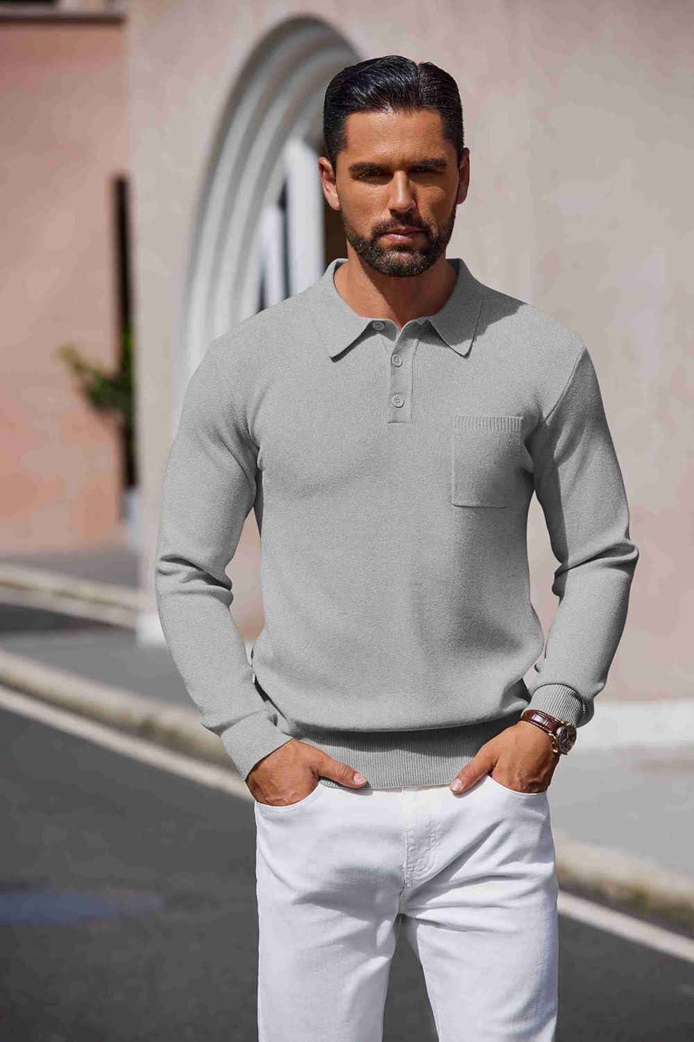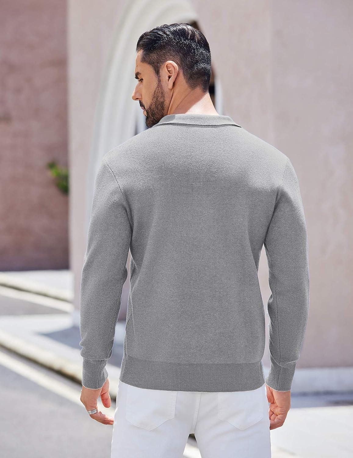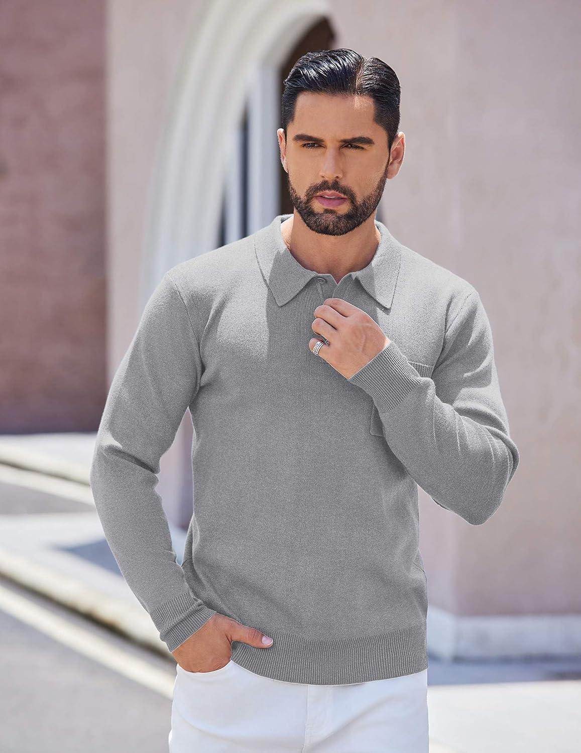 COOFANDY Mens Long Sleeve Polo Sweater Knit Polo Casual Thermal Pullover Sweater with Pocket(Light Grey)
