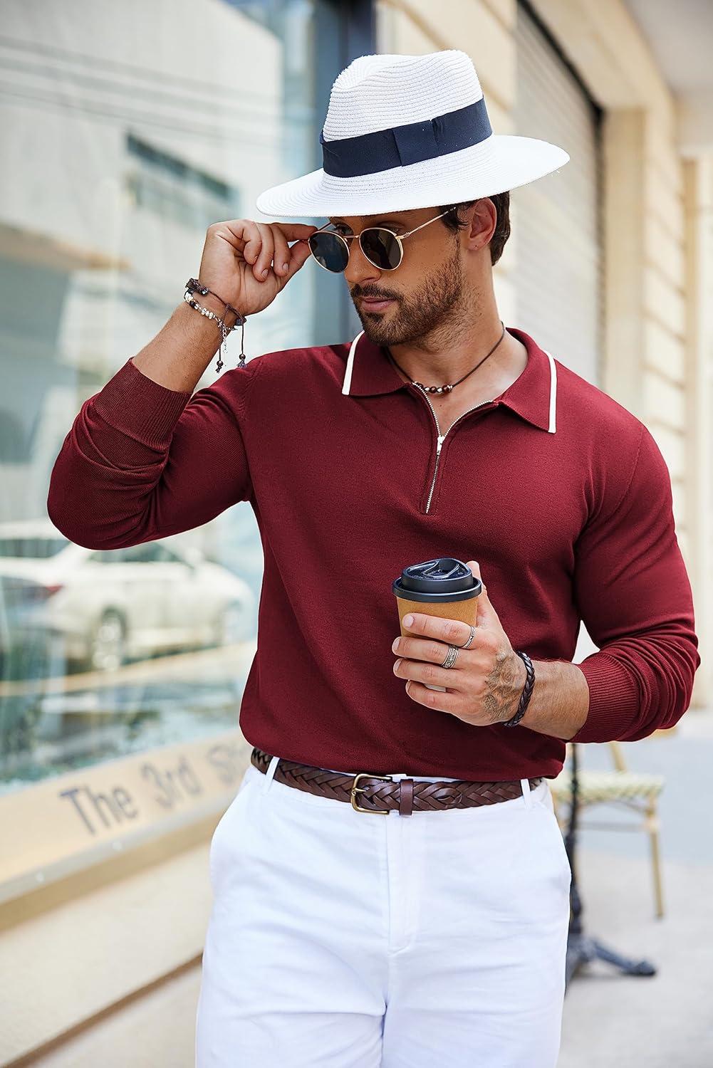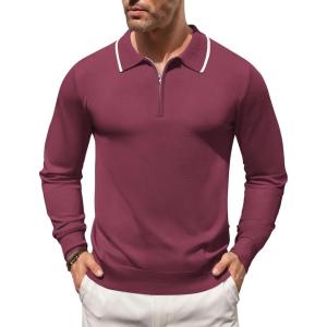 COOFANDY Men’s Knit Polo Shirt Long Sleeve Quarter Zip Polo Sweater Casual Golf Shirts Vintage Striped Collar Polo(Wine Red)