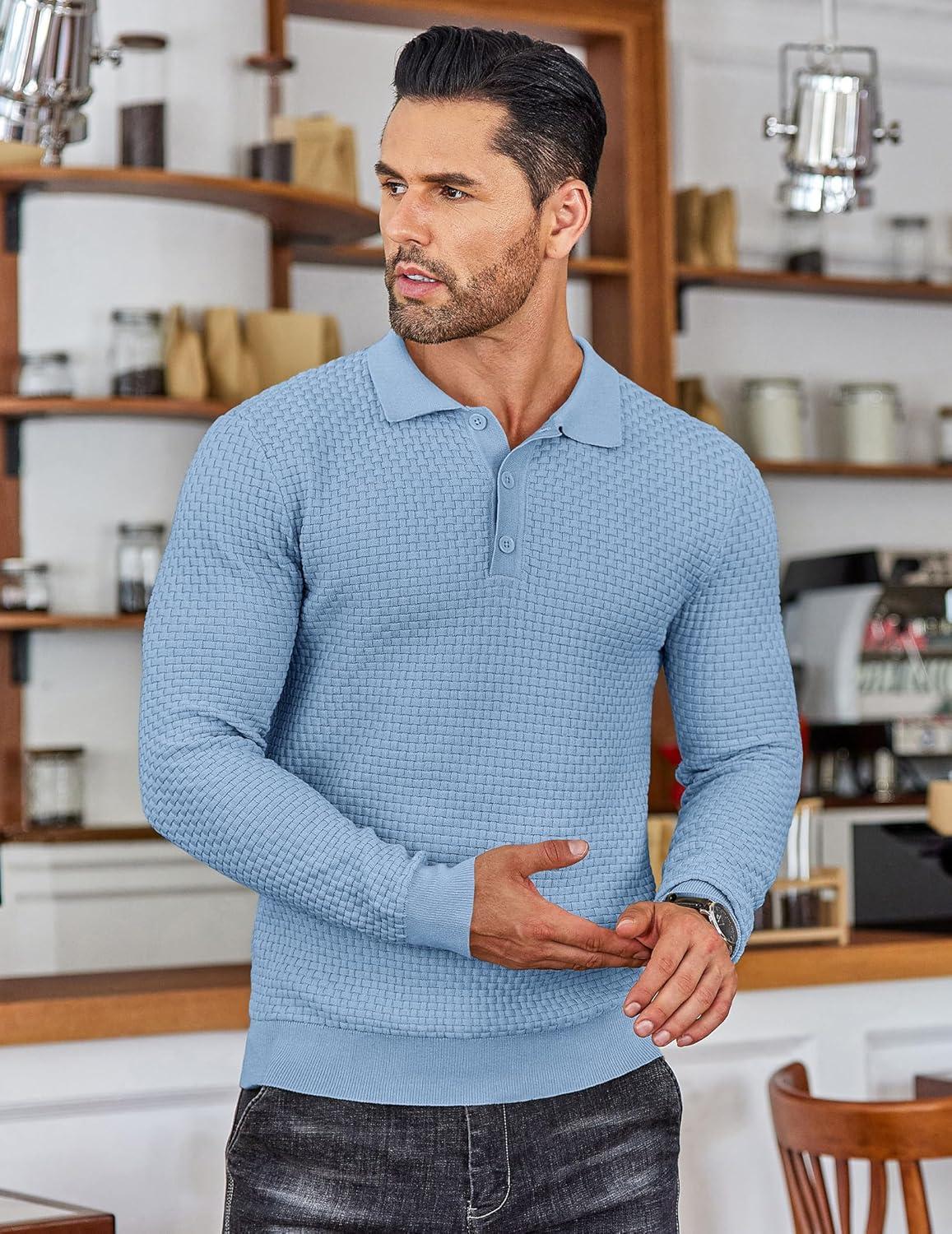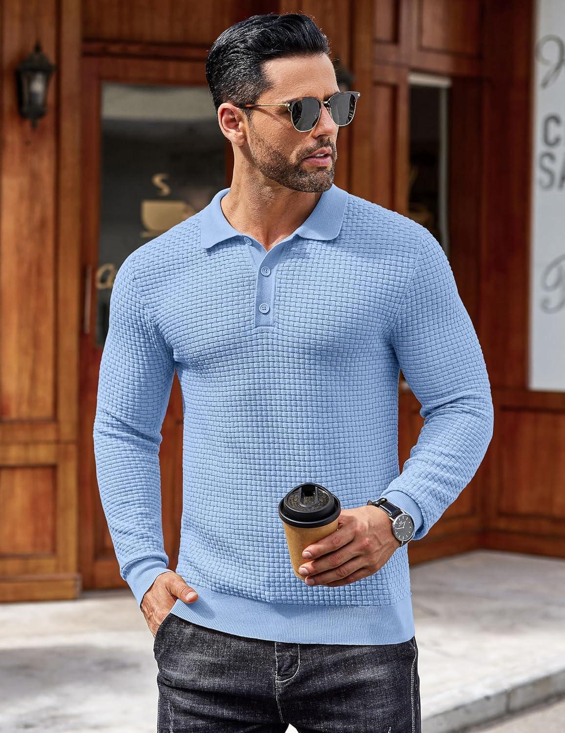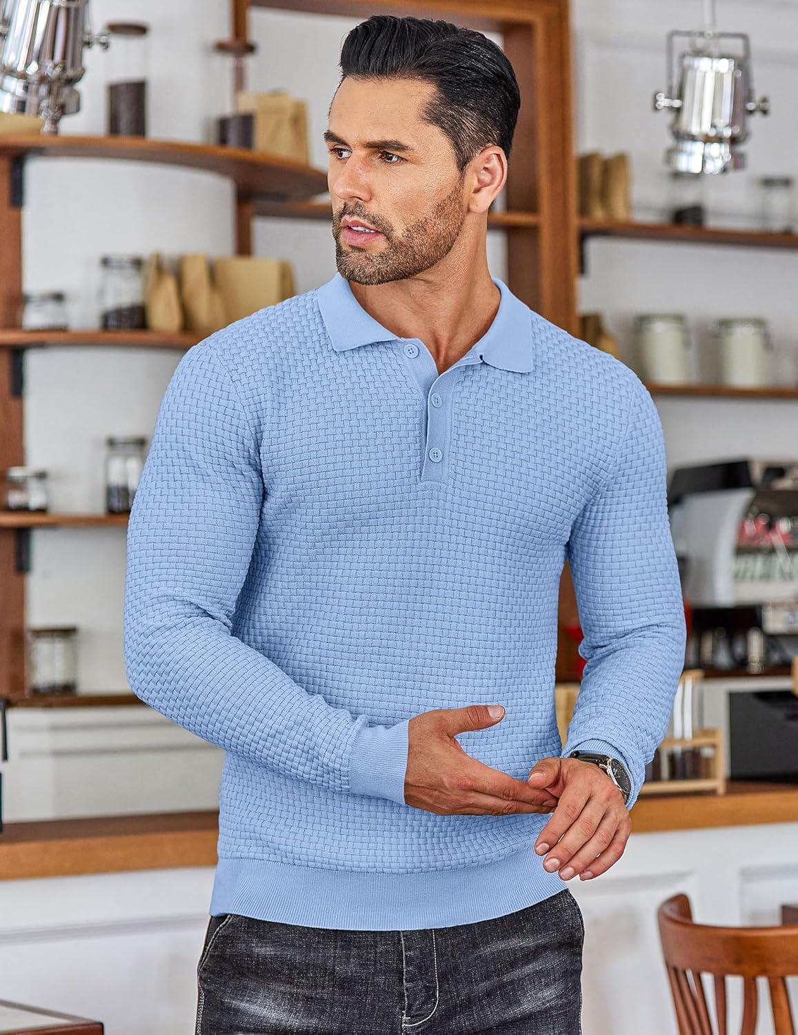 COOFANDY Men’s Knit Polo Shirts Long Sleeve Sweater Polo Lightweight Fashion Casual Collared Shirts(Light Blue)