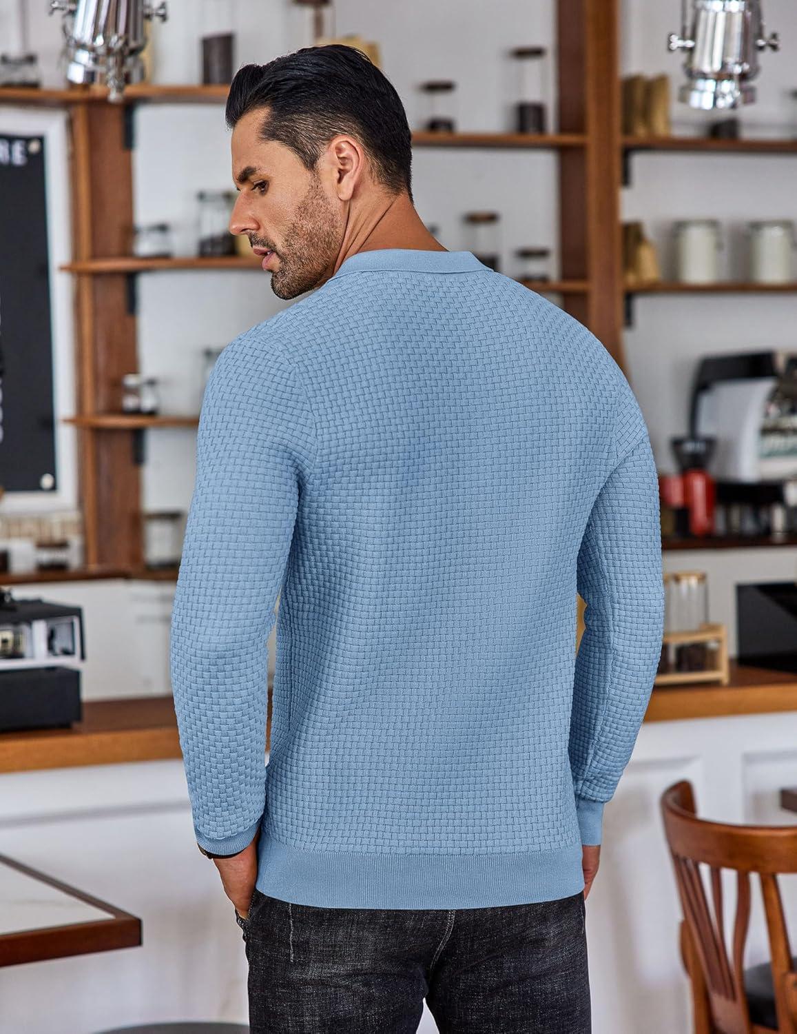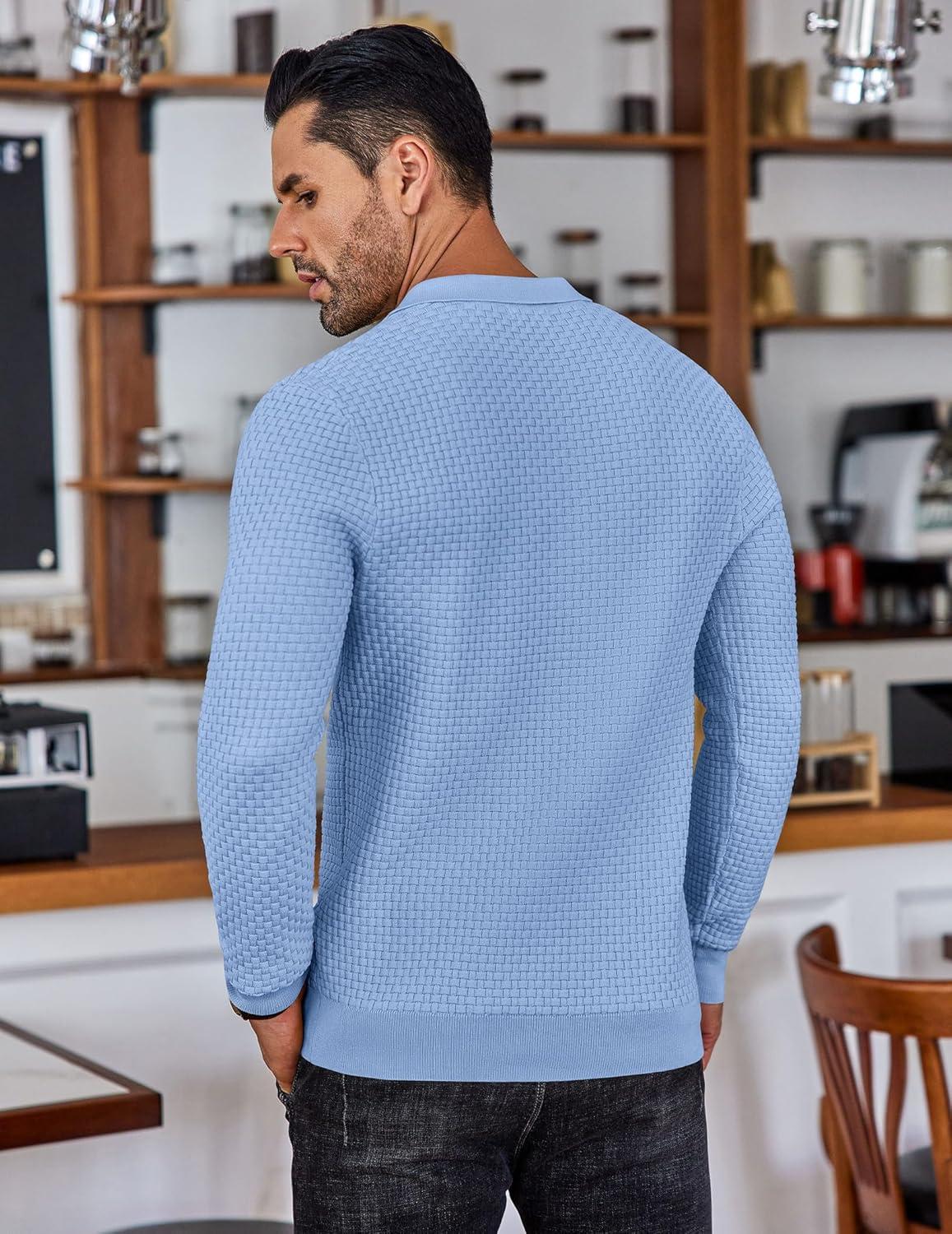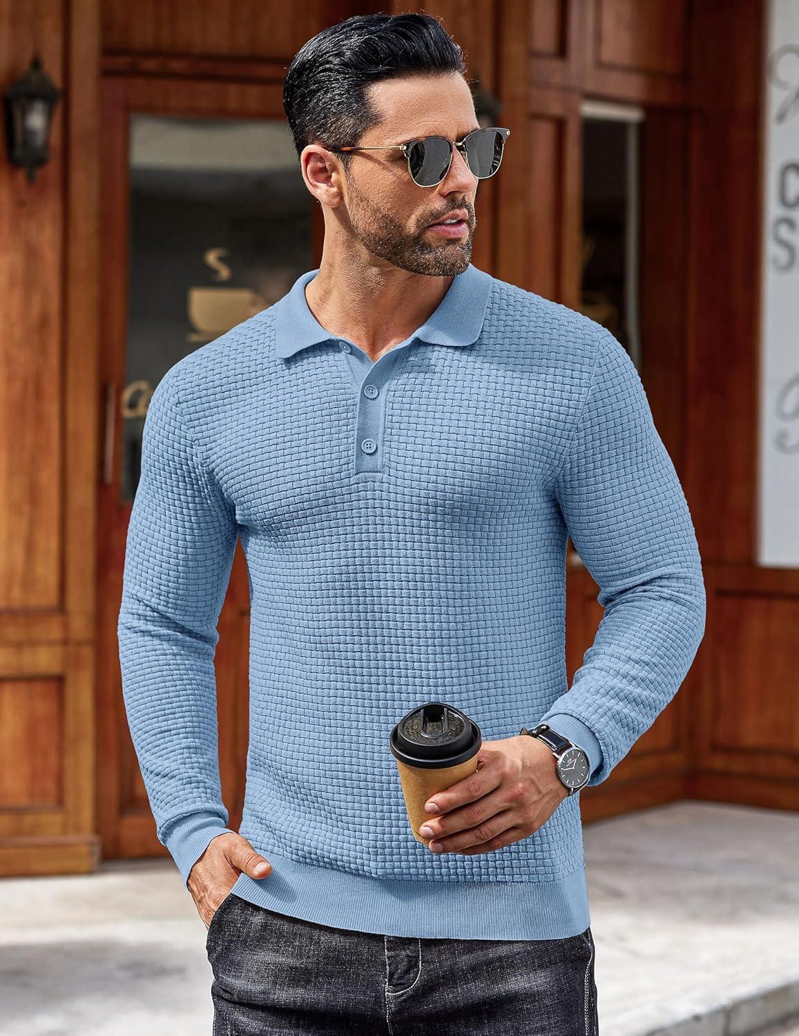 COOFANDY Men’s Knit Polo Shirts Long Sleeve Sweater Polo Lightweight Fashion Casual Collared Shirts(Light Blue)