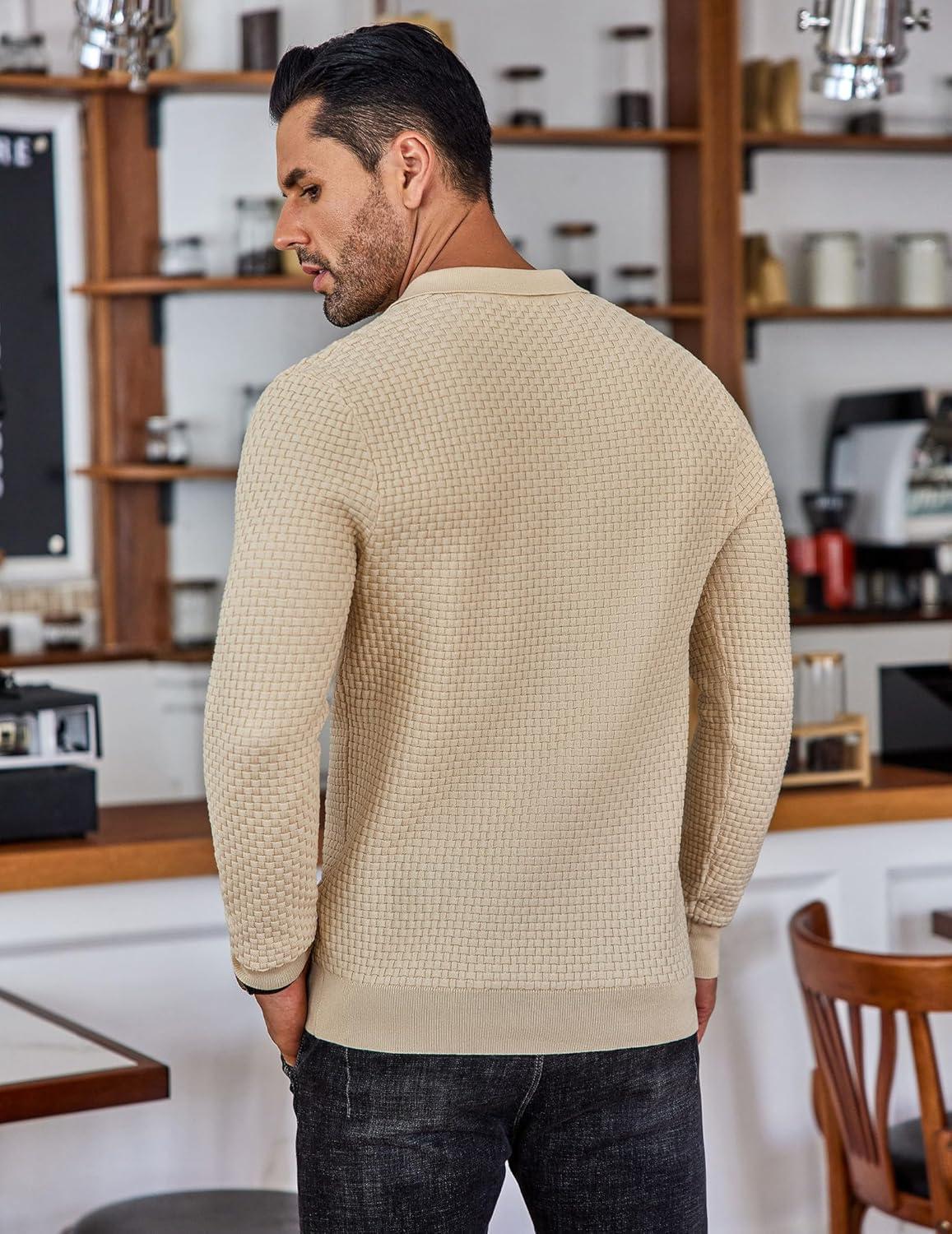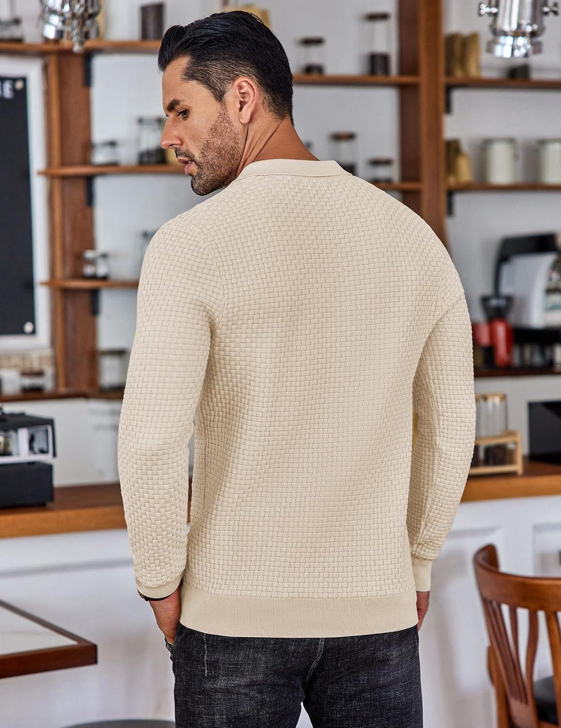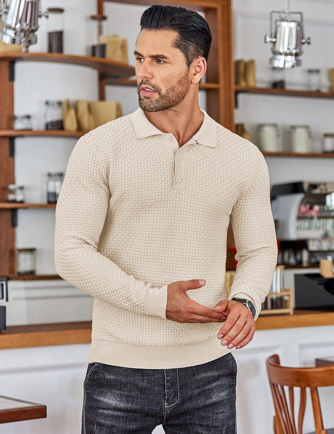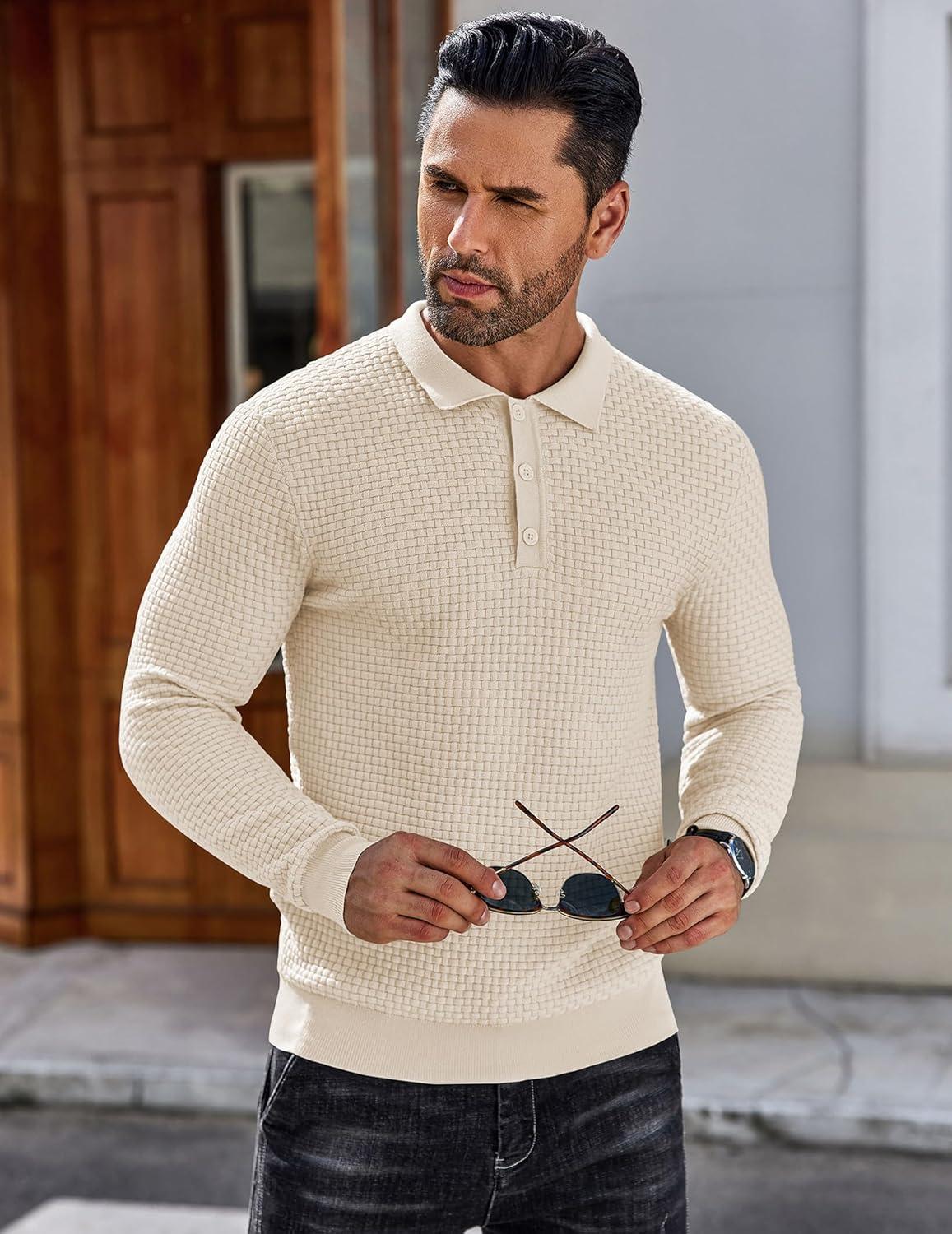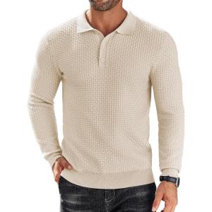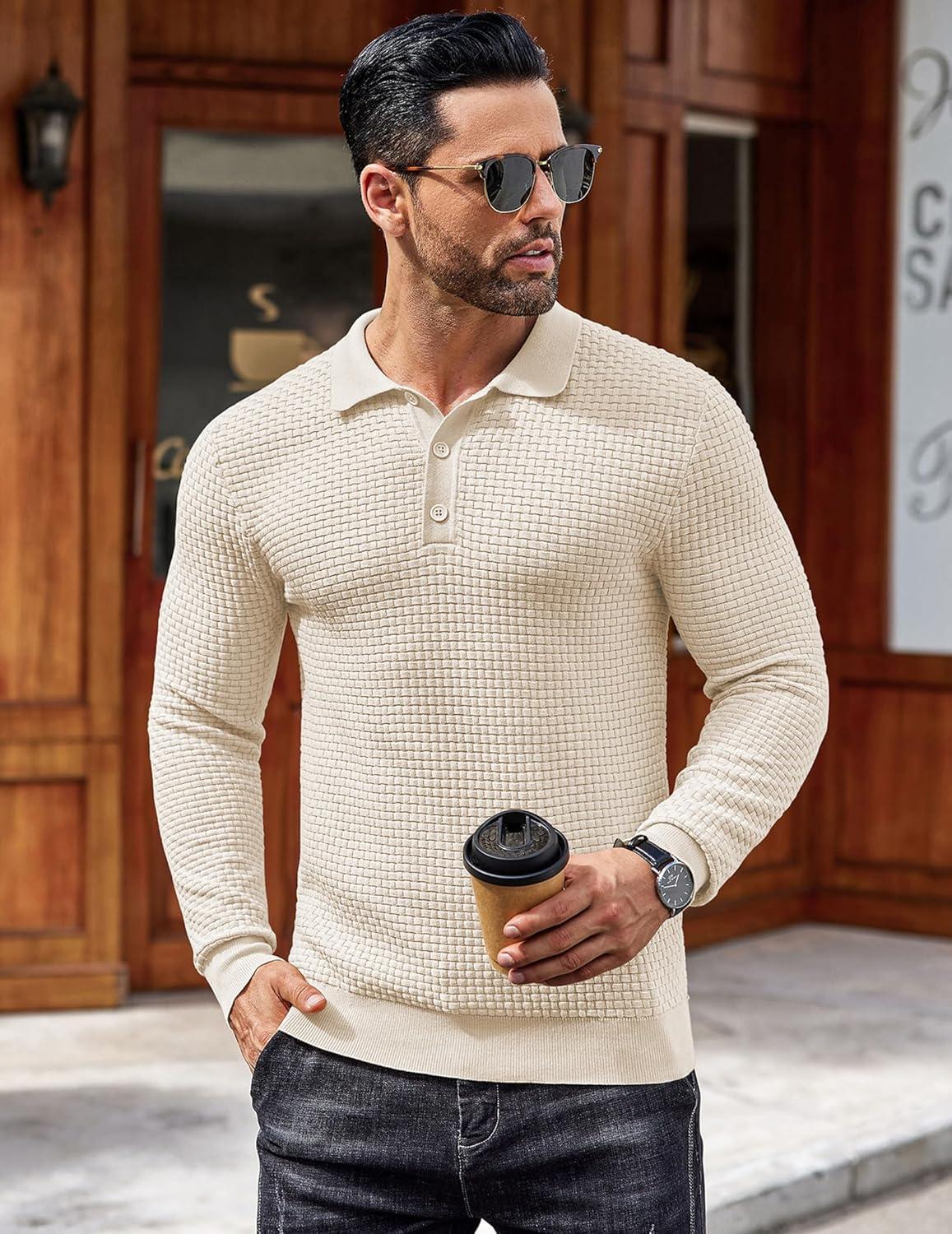 COOFANDY Men’s Knit Polo Shirts Long Sleeve Sweater Polo Lightweight Fashion Casual Collared Shirts(Cream)