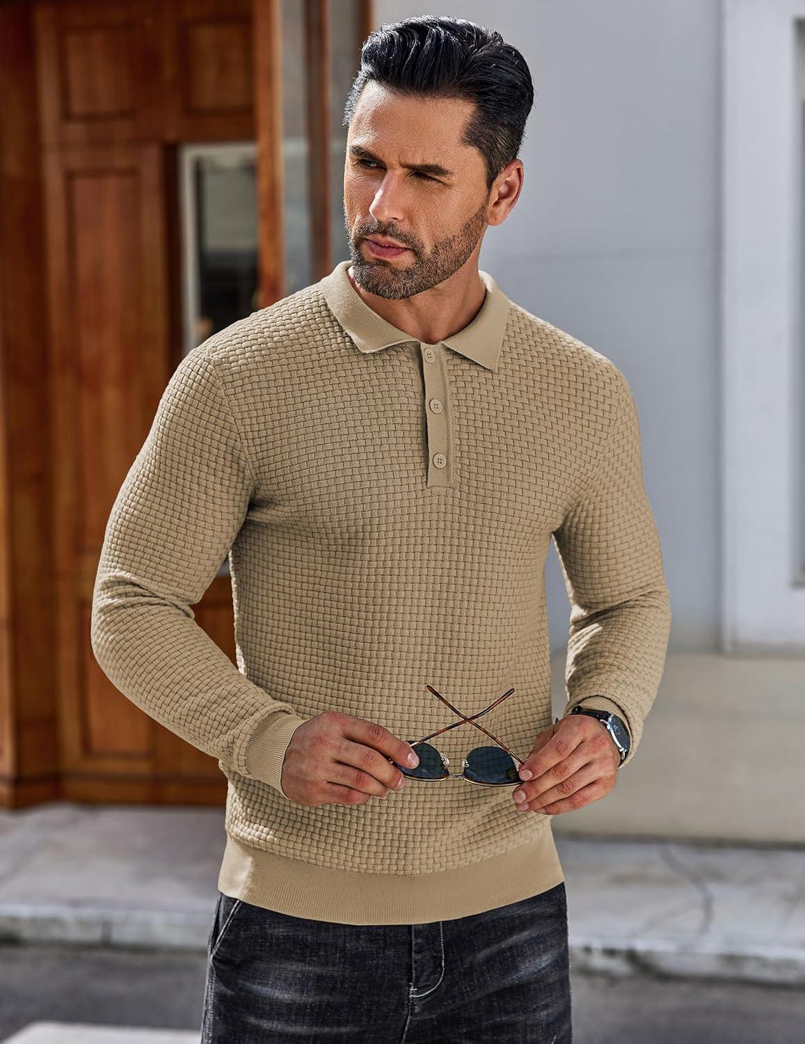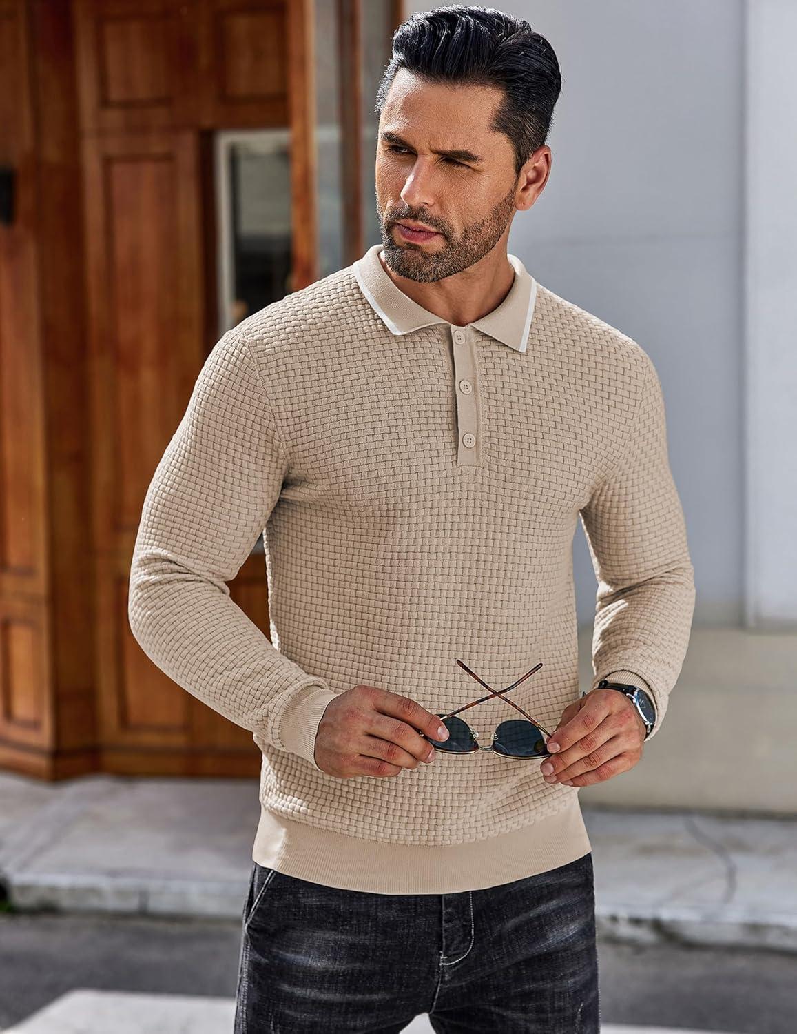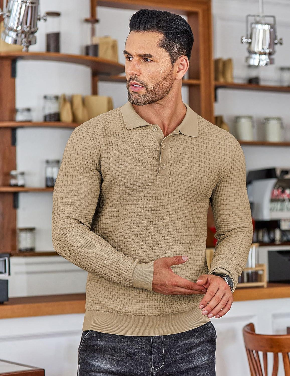 COOFANDY Men’s Knit Polo Shirts Long Sleeve Sweater Polo Lightweight Fashion Casual Collared Shirts(Khaki)