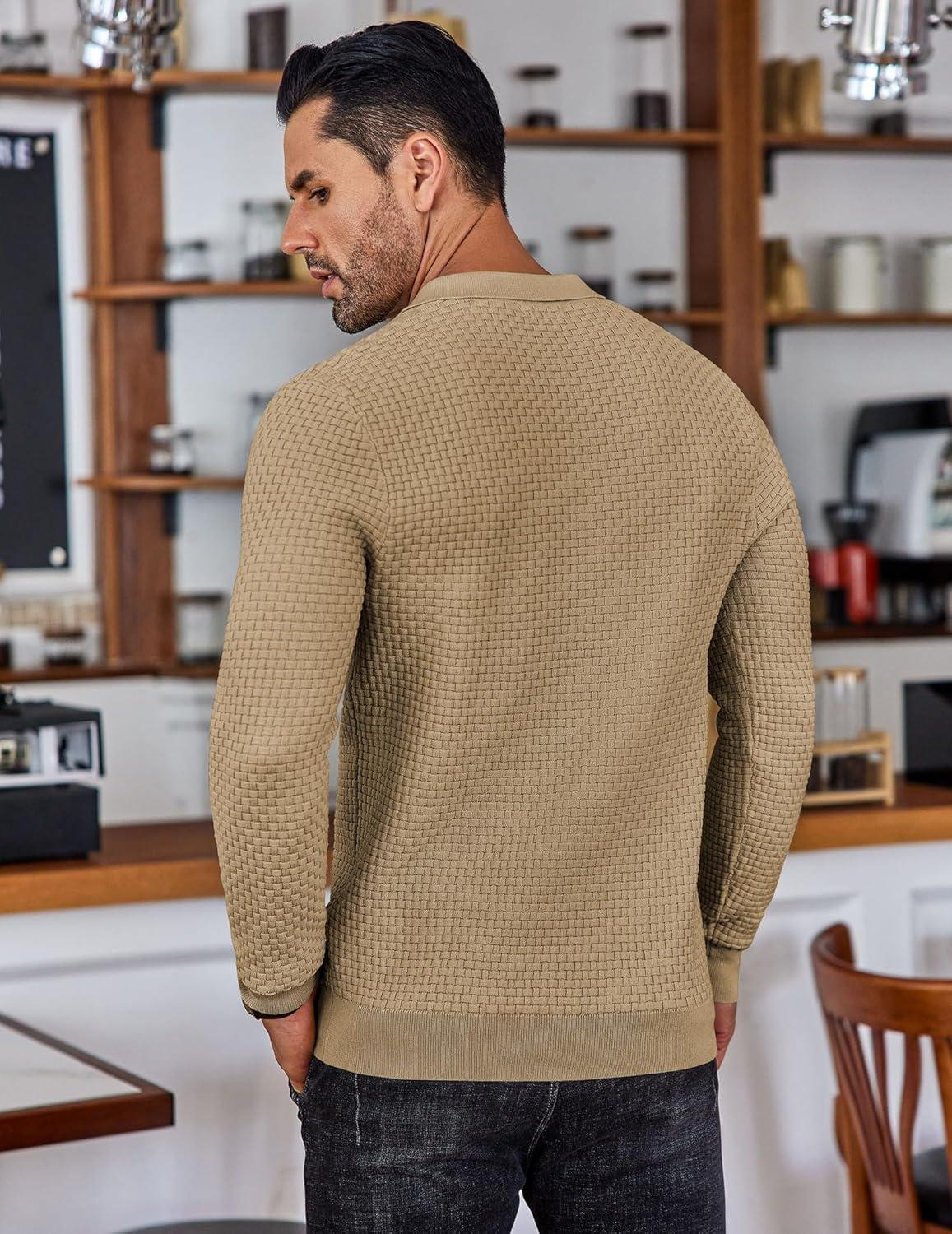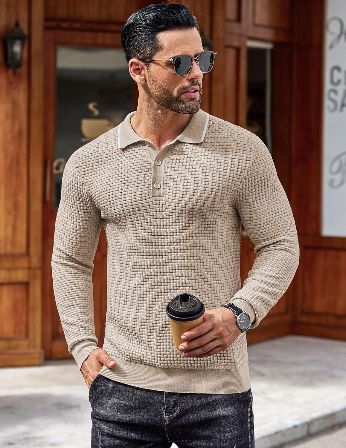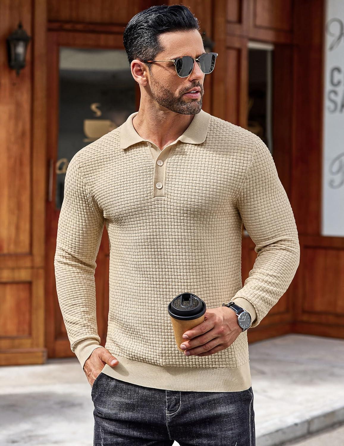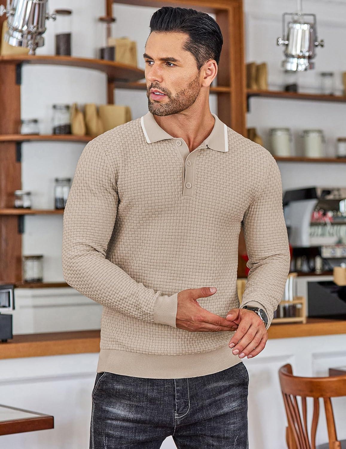 COOFANDY Men’s Knit Polo Shirts Long Sleeve Sweater Polo Lightweight Fashion Casual Collared Shirts(Khaki)