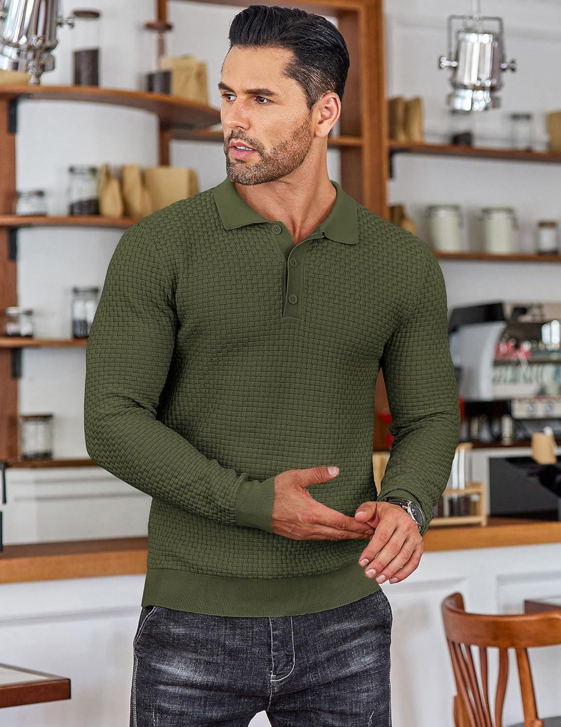 COOFANDY Men’s Knit Polo Shirts Long Sleeve Sweater Polo Lightweight Fashion Casual Collared Shirts(Army Green)