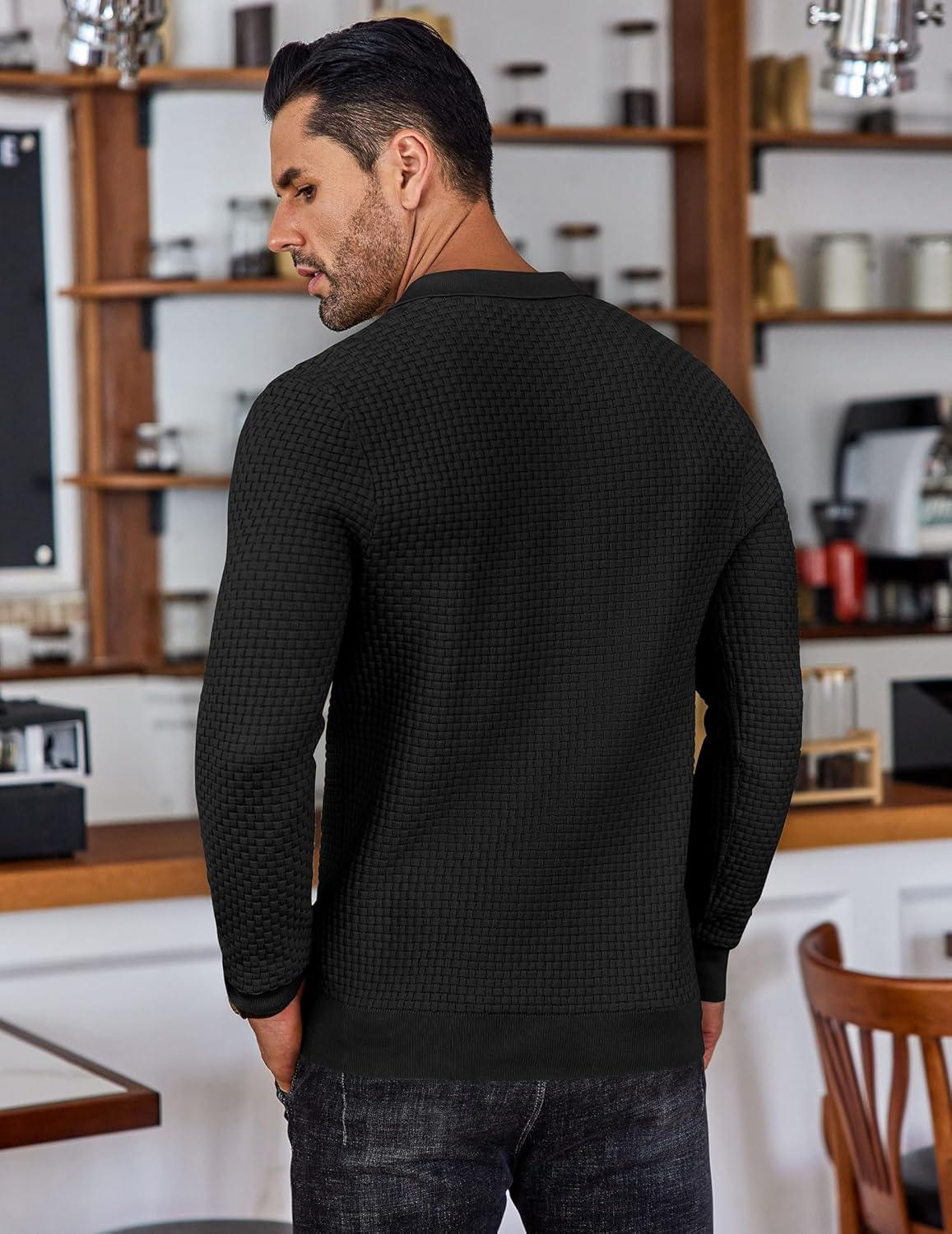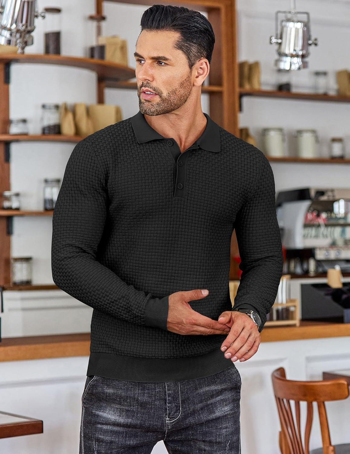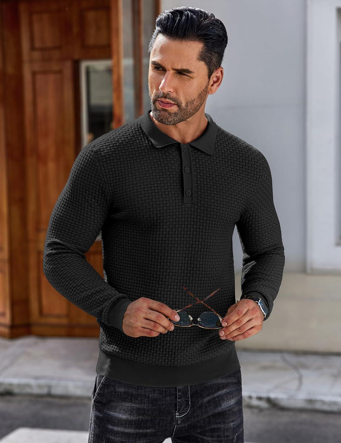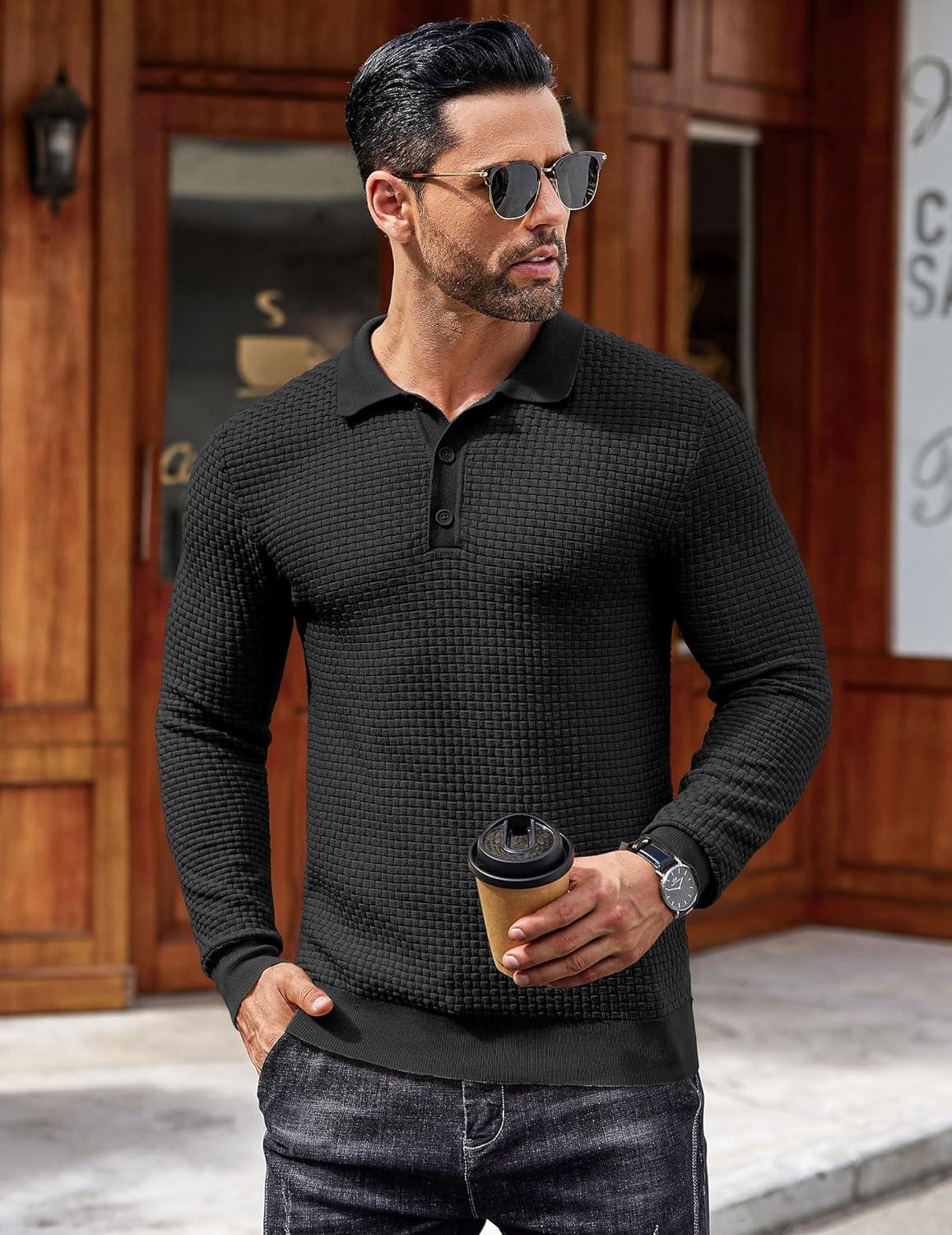 COOFANDY Men’s Knit Polo Shirts Long Sleeve Sweater Polo Lightweight Fashion Casual Collared Shirts(Black)
