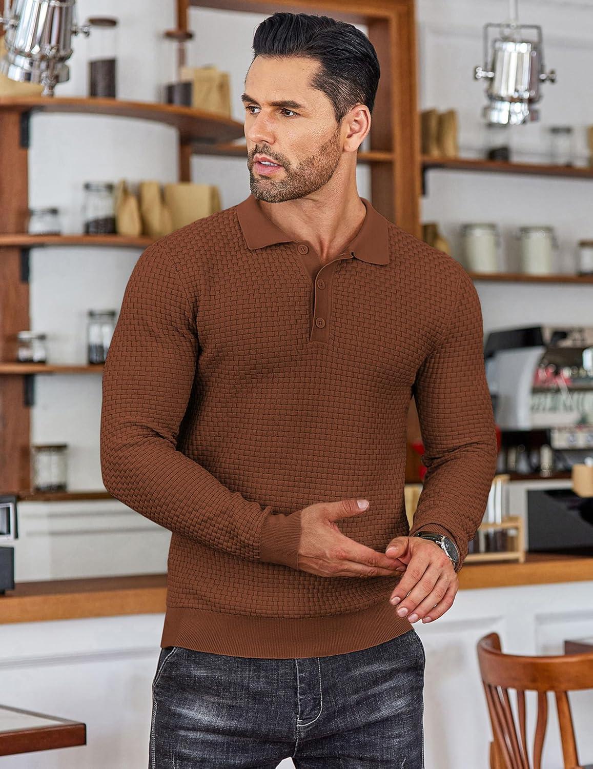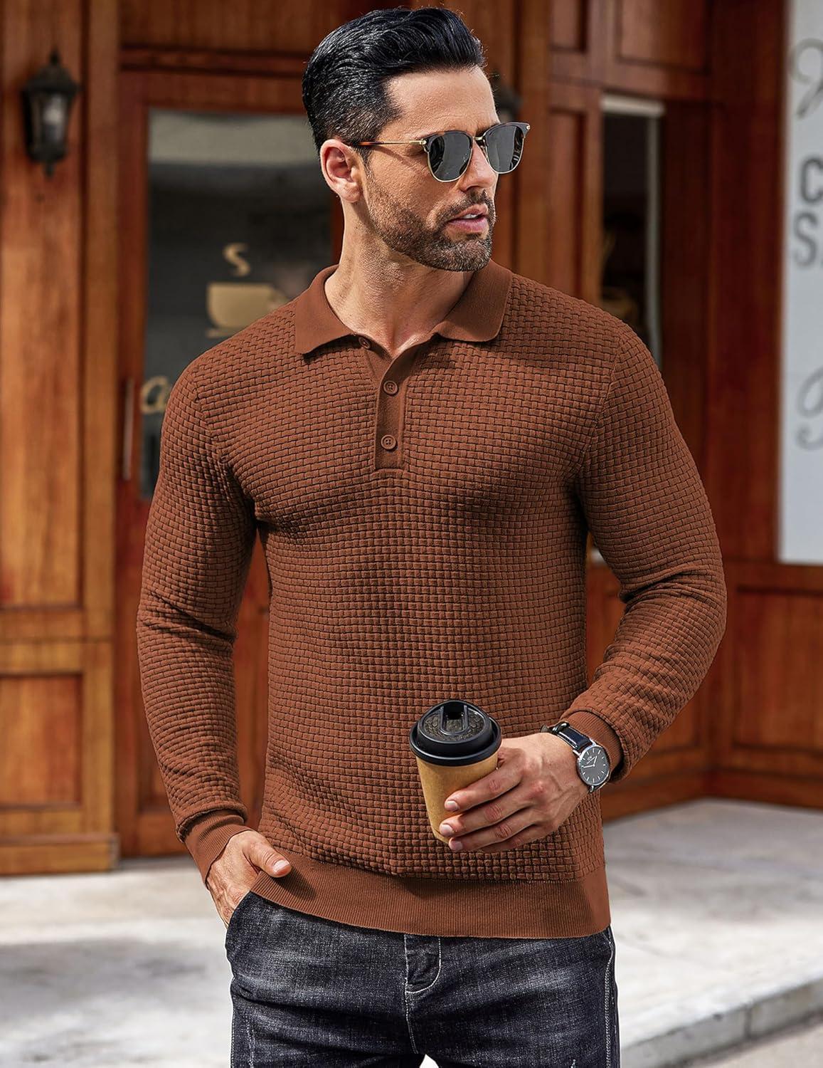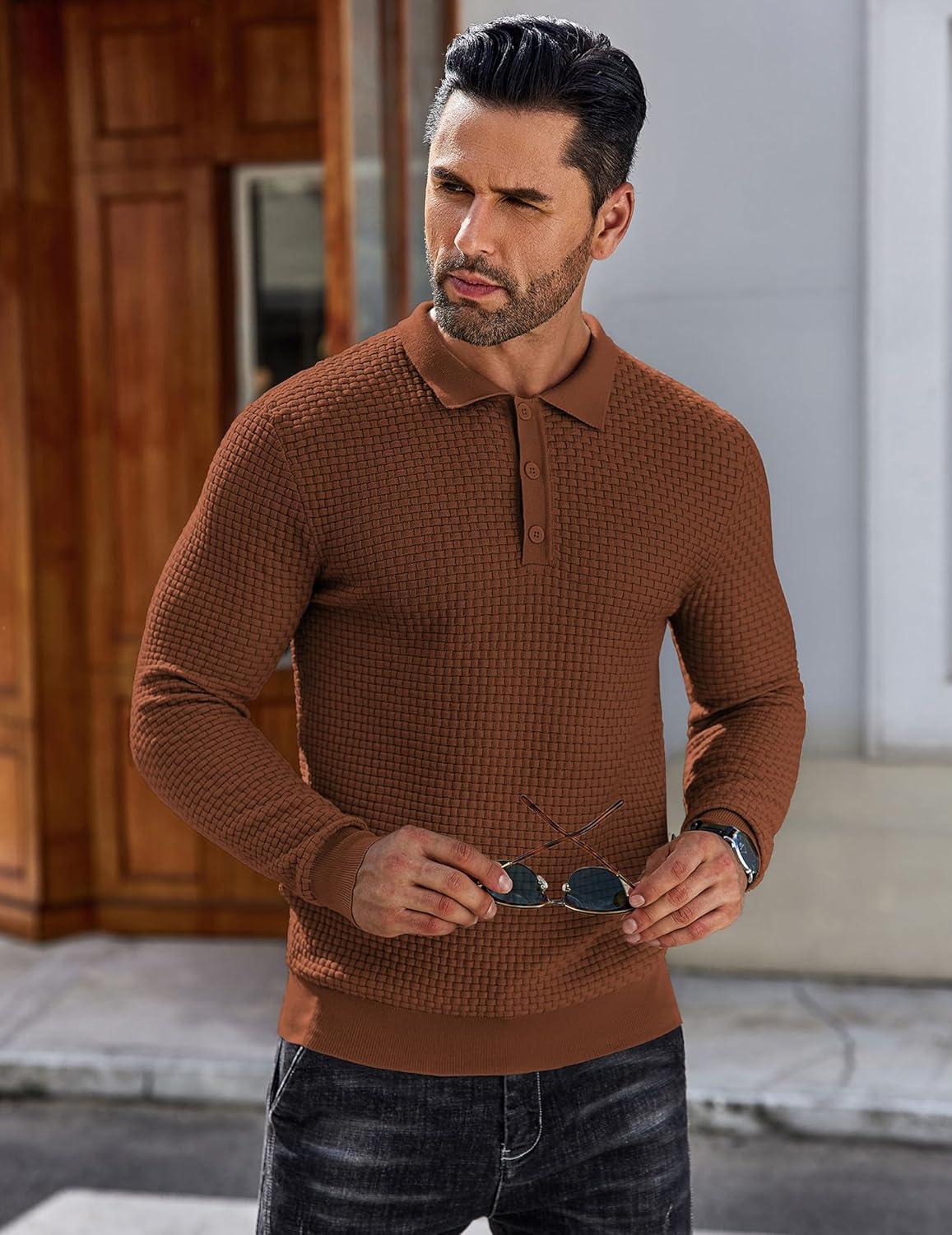 COOFANDY Men’s Knit Polo Shirts Long Sleeve Sweater Polo Lightweight Fashion Casual Collared Shirts(Brown)