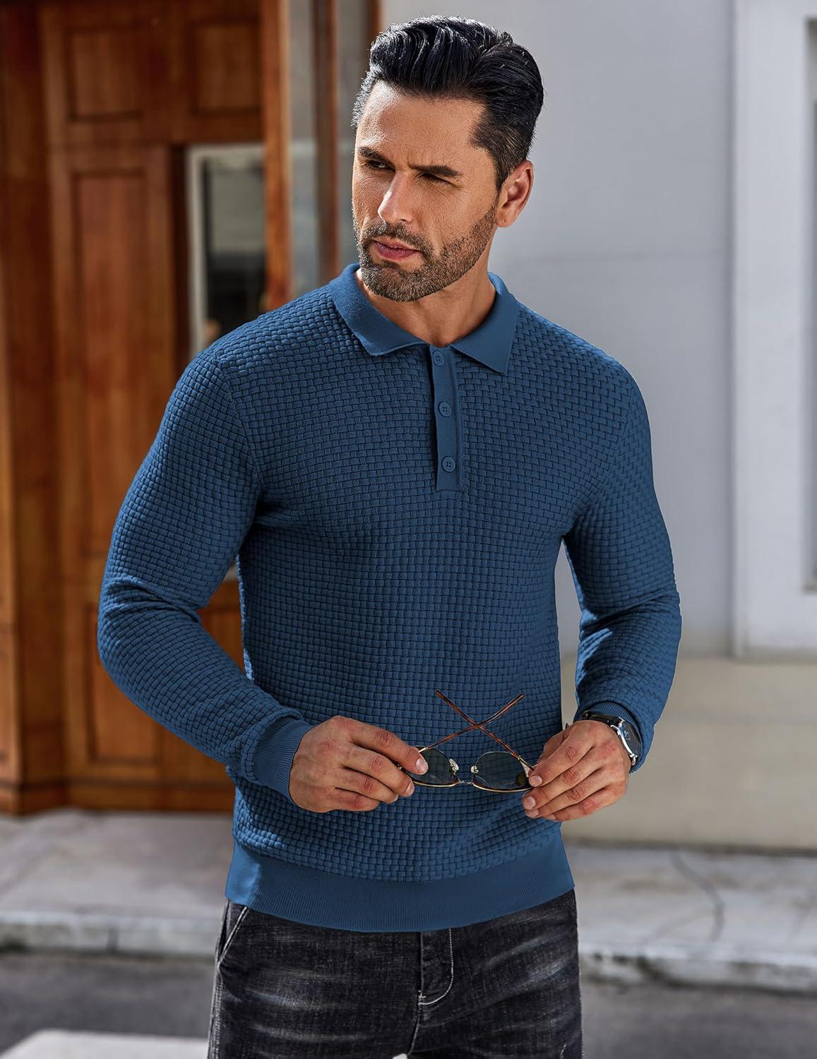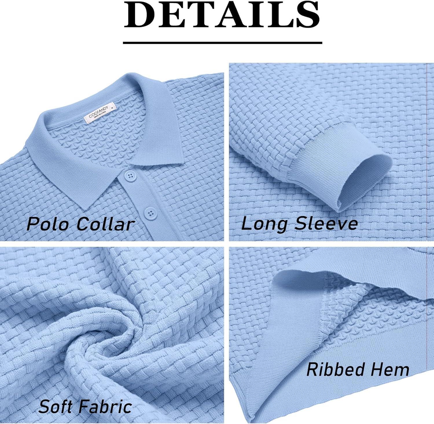 COOFANDY Men’s Knit Polo Shirts Long Sleeve Sweater Polo Lightweight Fashion Casual Collared Shirts(Airy Blue)