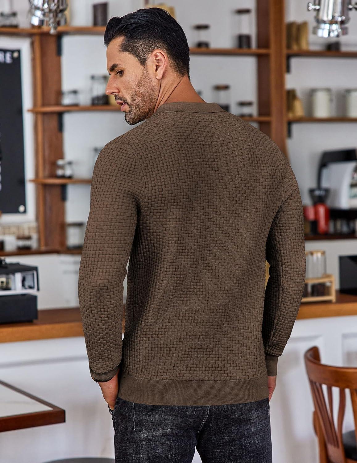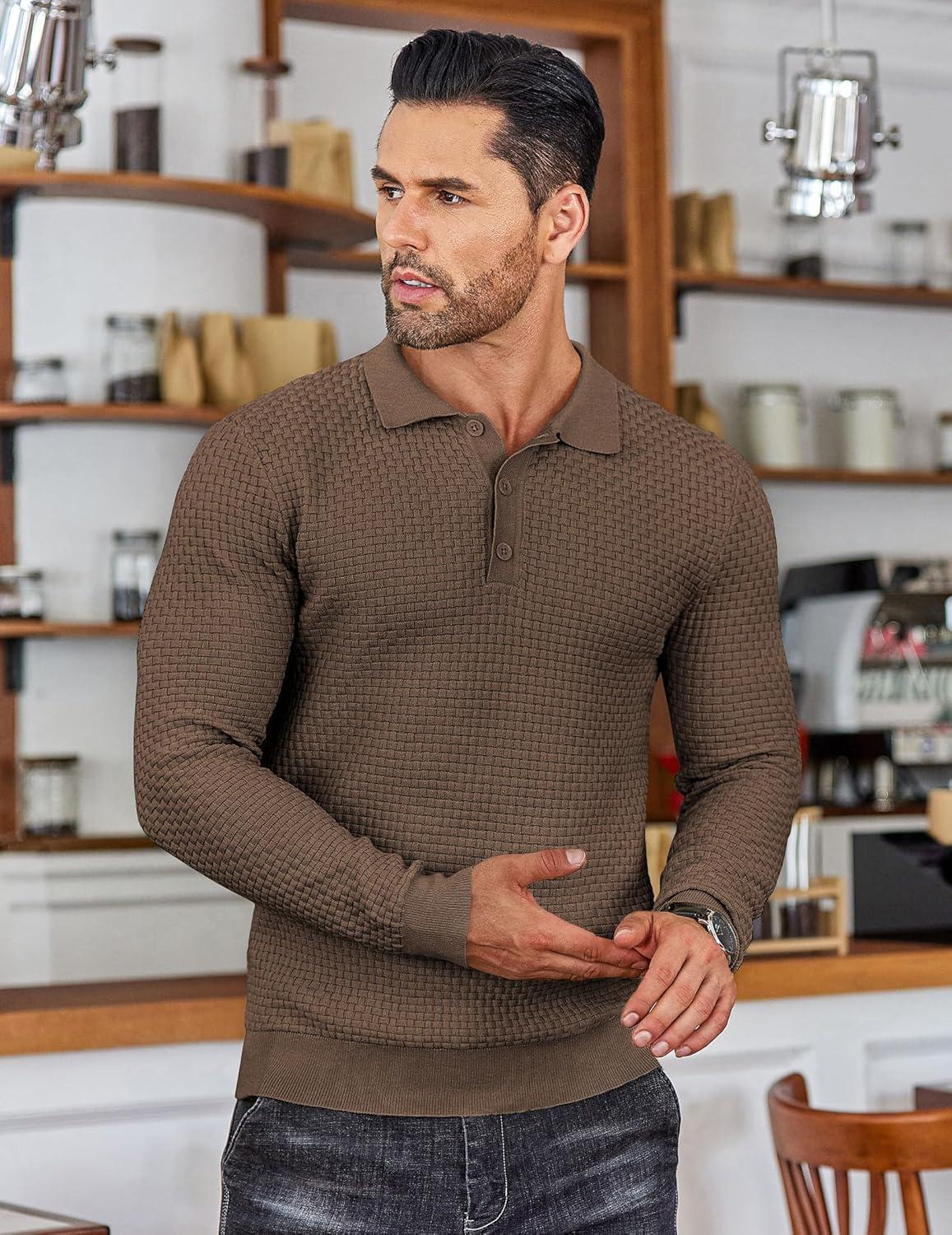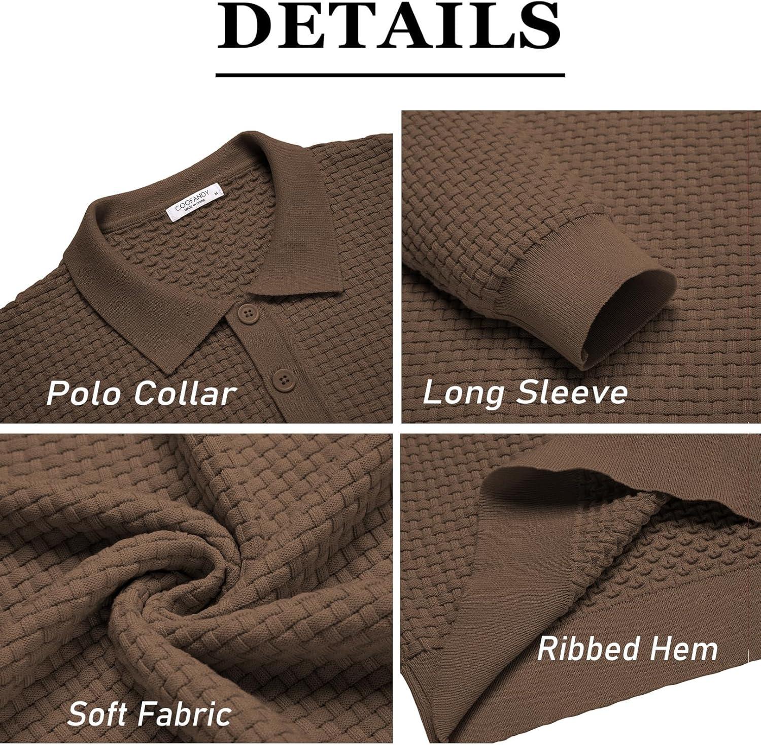 COOFANDY Men’s Knit Polo Shirts Long Sleeve Sweater Polo Lightweight Fashion Casual Collared Shirts(Dark Coffee)