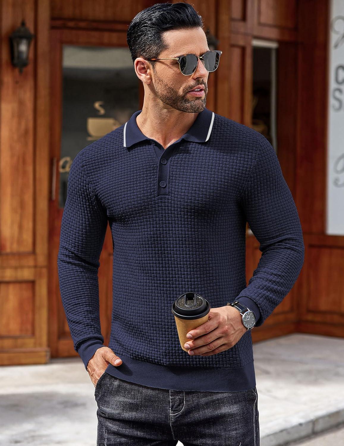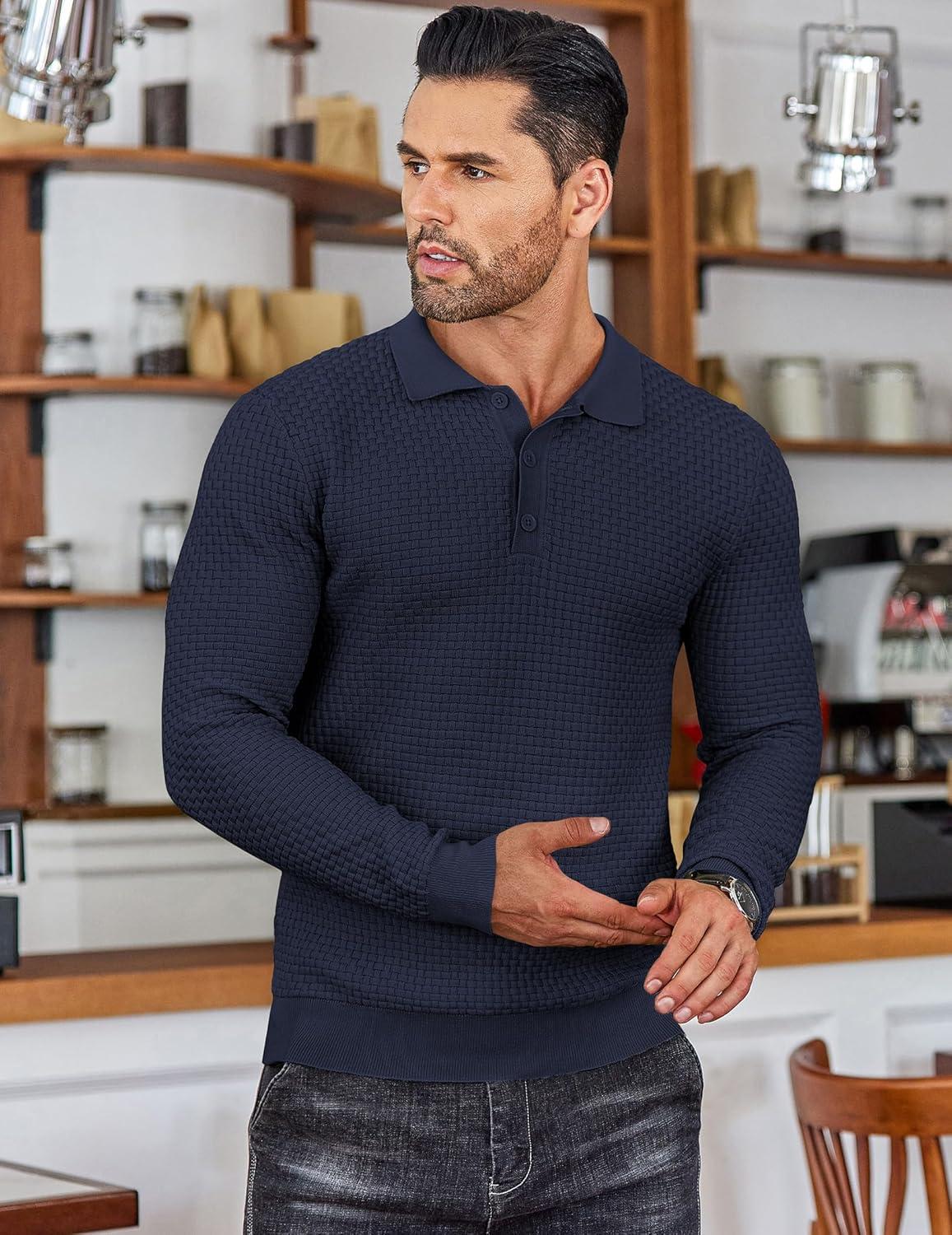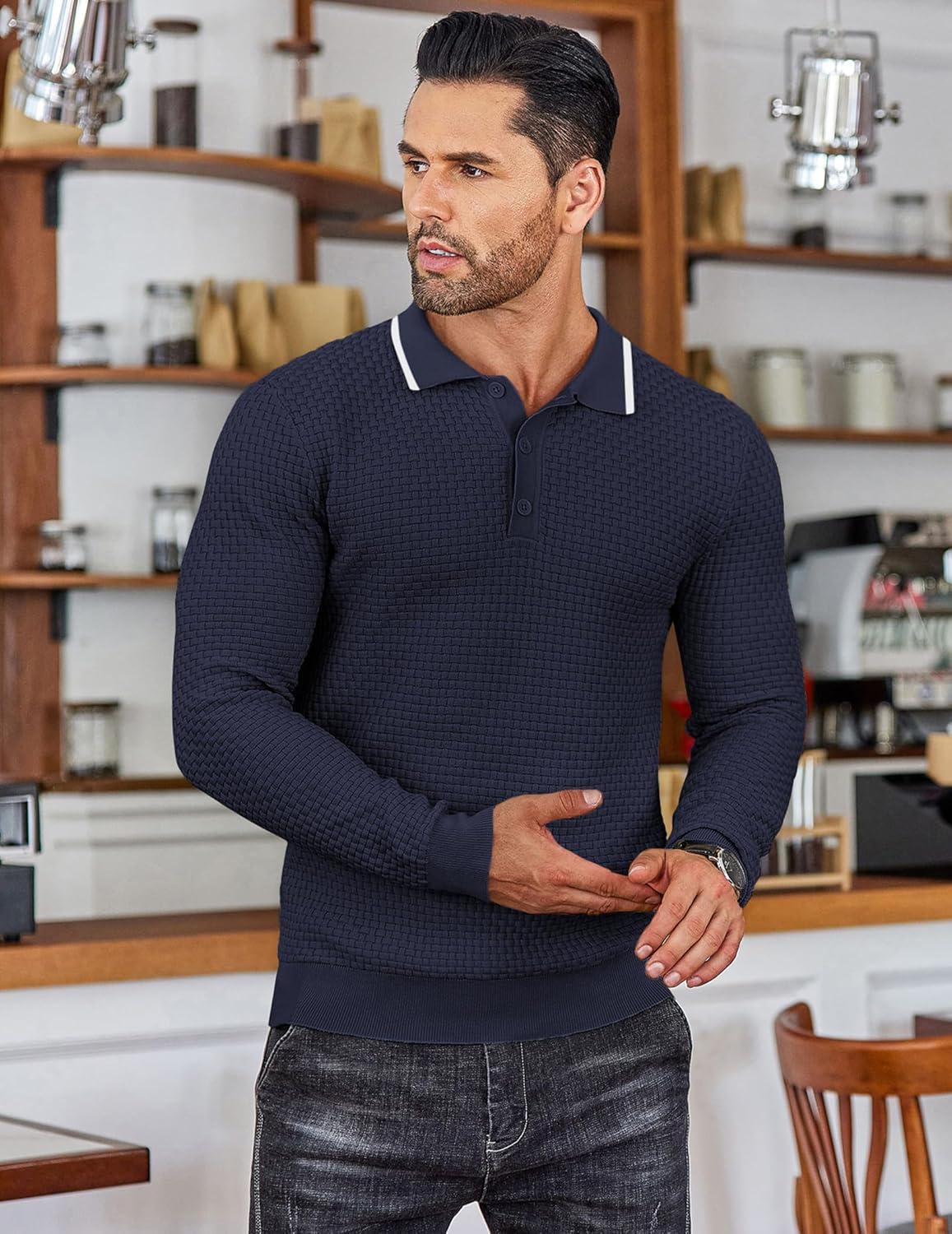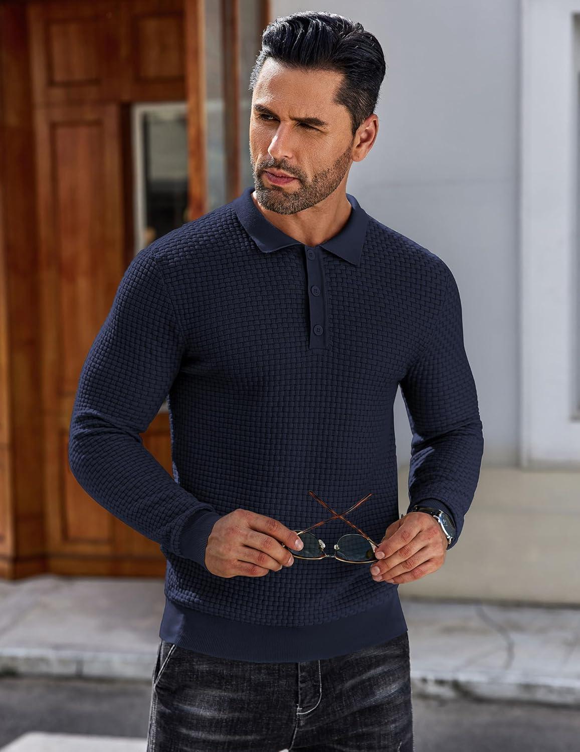 COOFANDY Men’s Knit Polo Shirts Long Sleeve Sweater Polo Lightweight Fashion Casual Collared Shirts(Dark Blue)