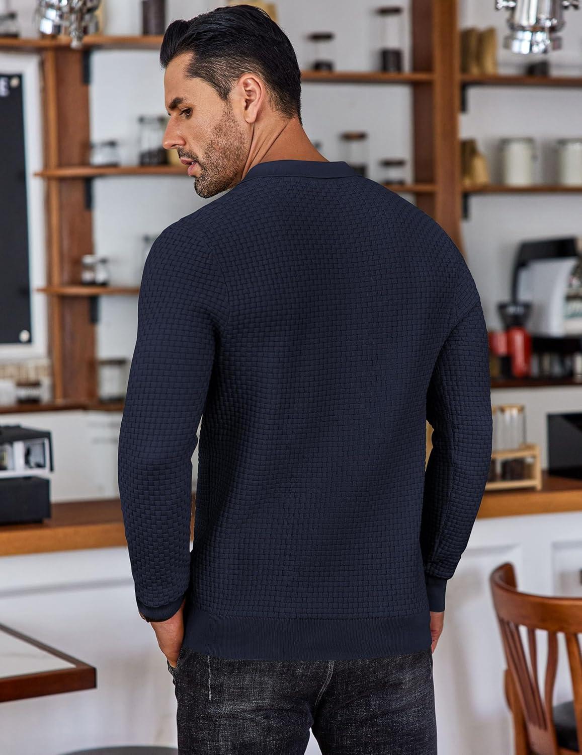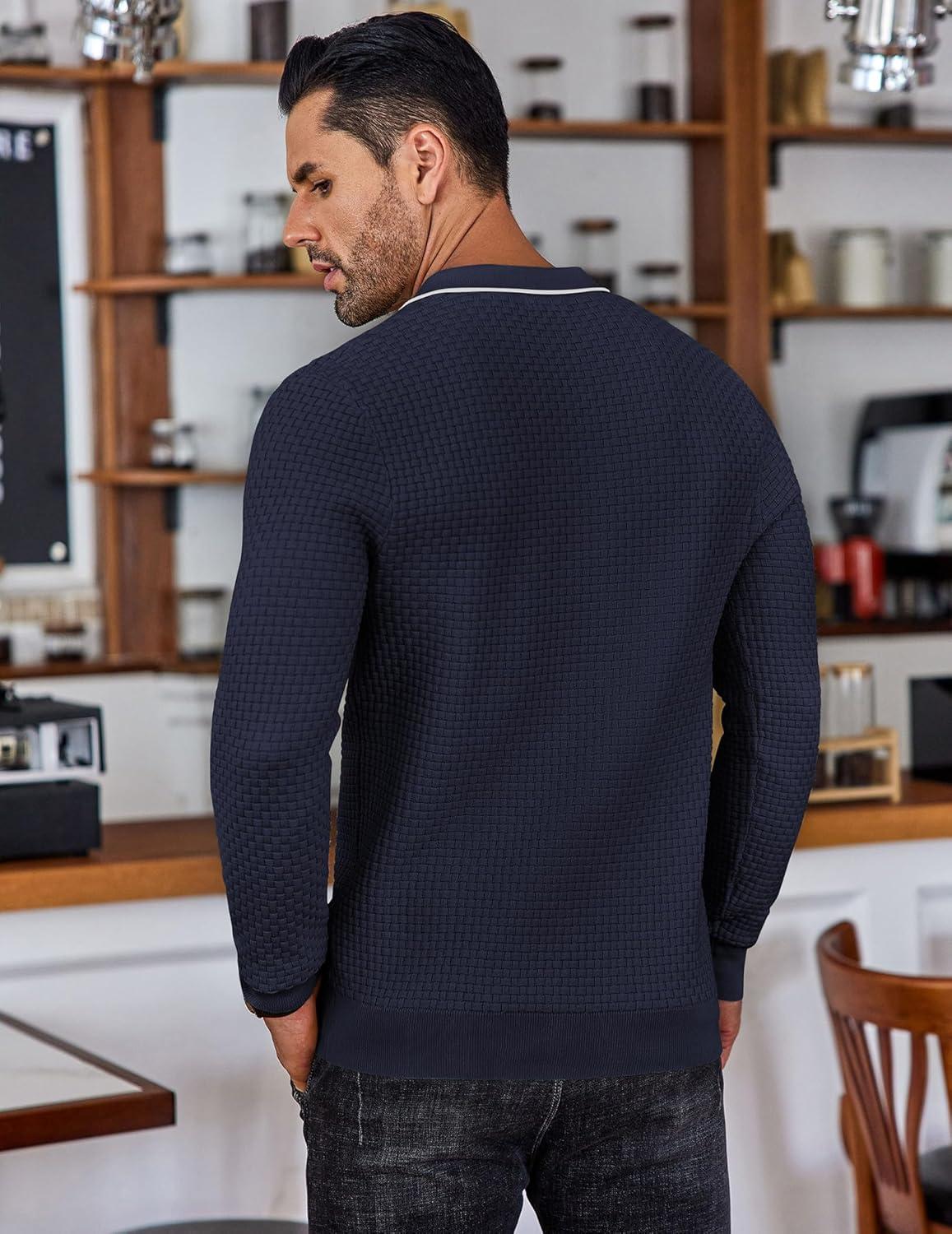 COOFANDY Men’s Knit Polo Shirt Long Sleeve Quarter Zip Polo Sweater Casual Golf Shirts Vintage Striped Collar Polo(Navy Blue)