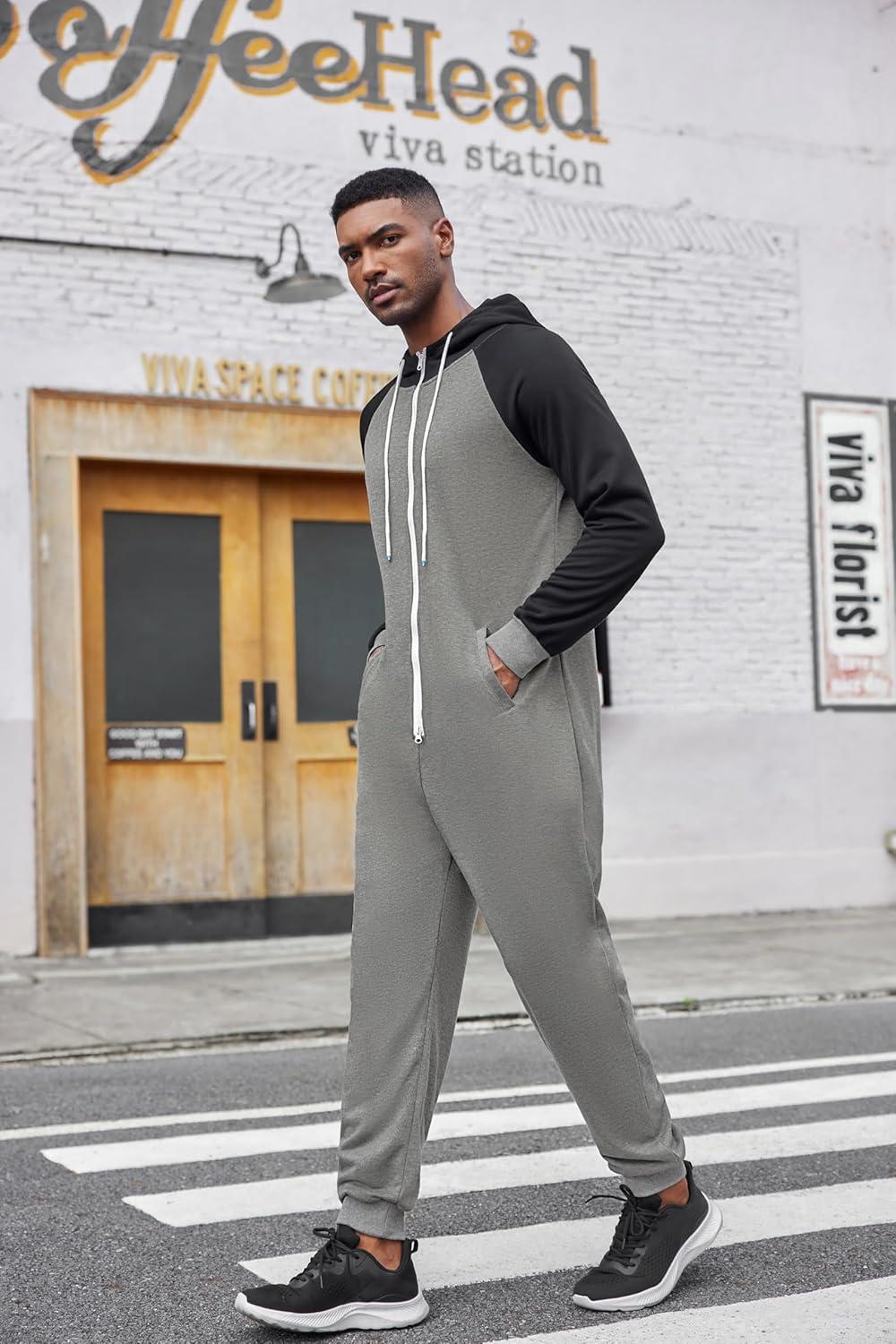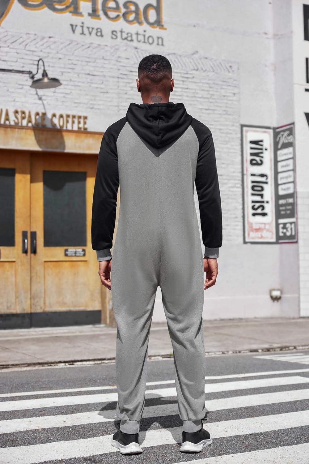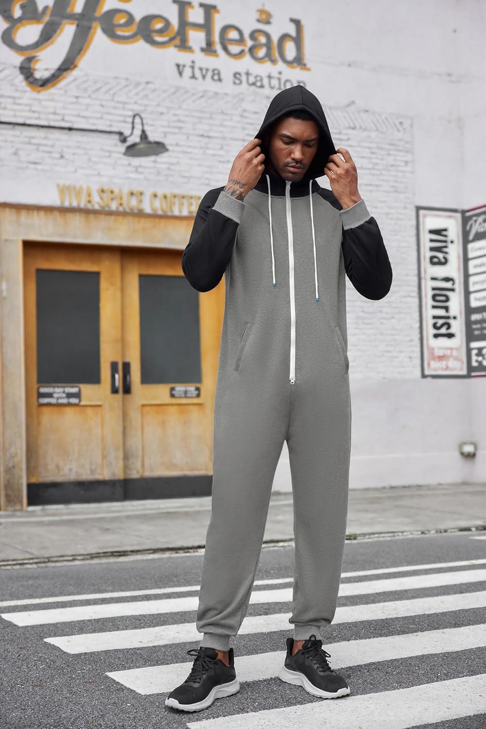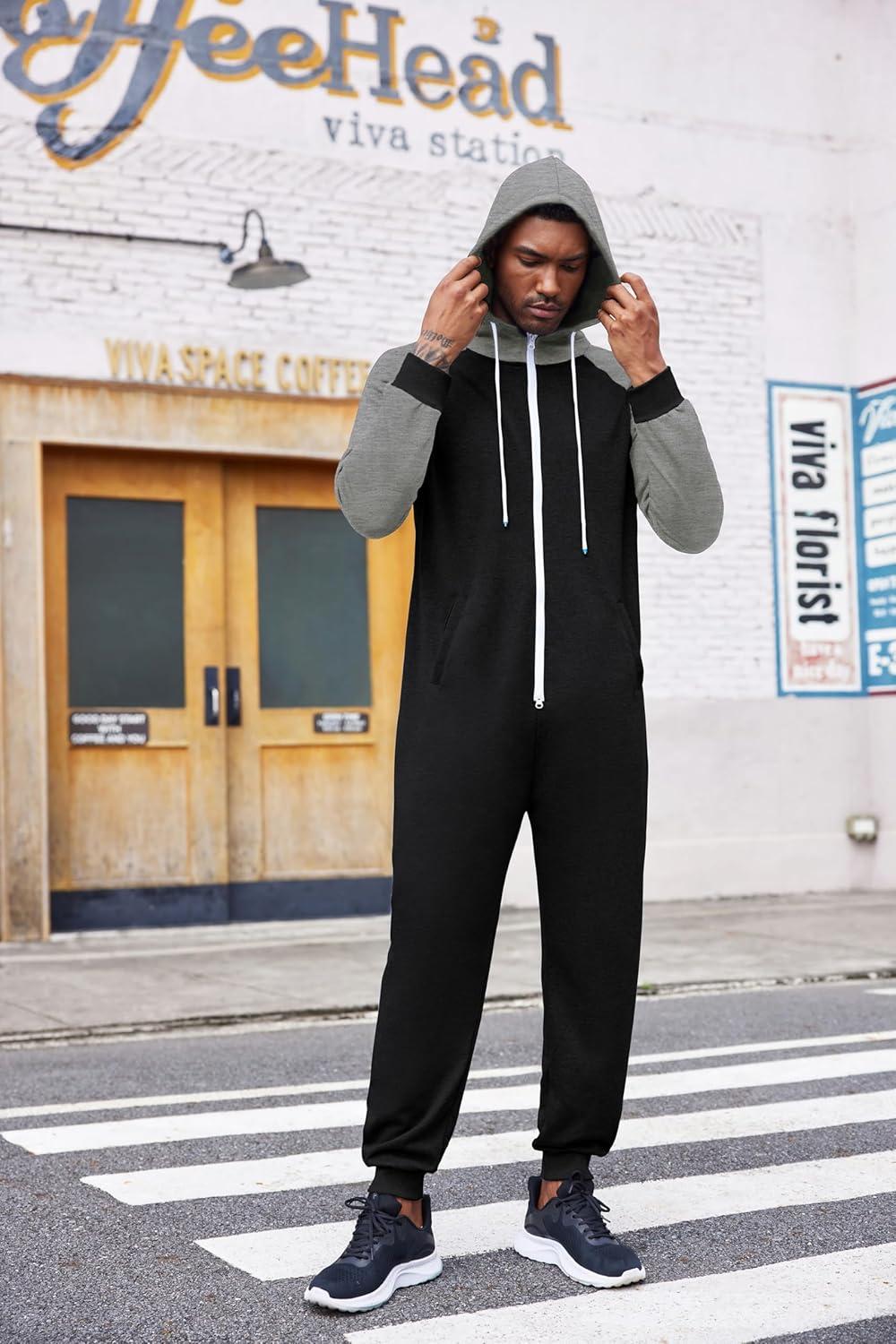 COOFANDY Mens Jumpsuit Onesie Rompers Drawstring Hooded Full Zip One Piece Tracksuit with Pockets(Black / Grey)