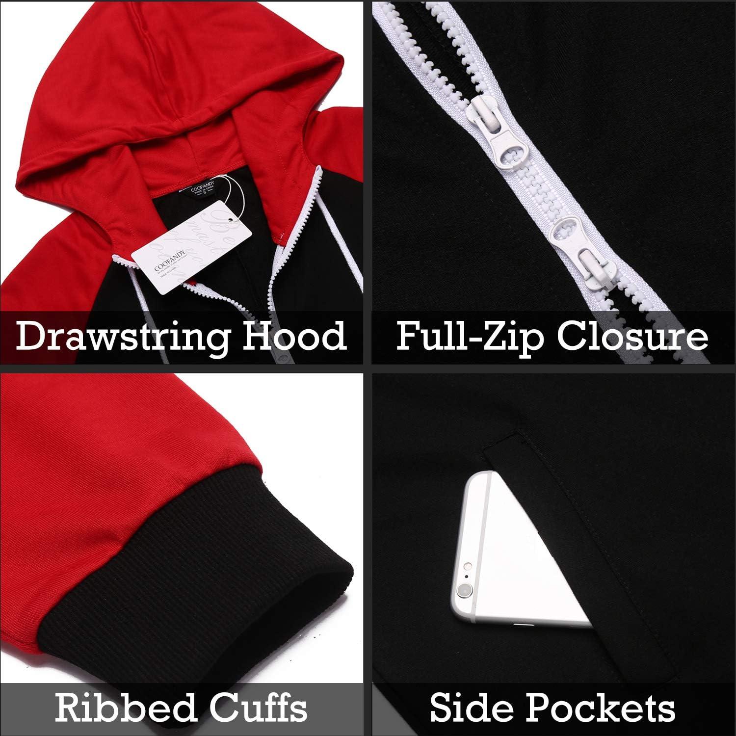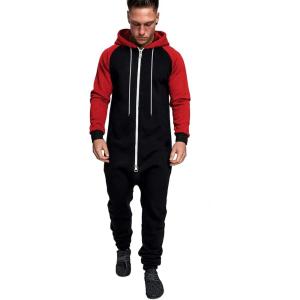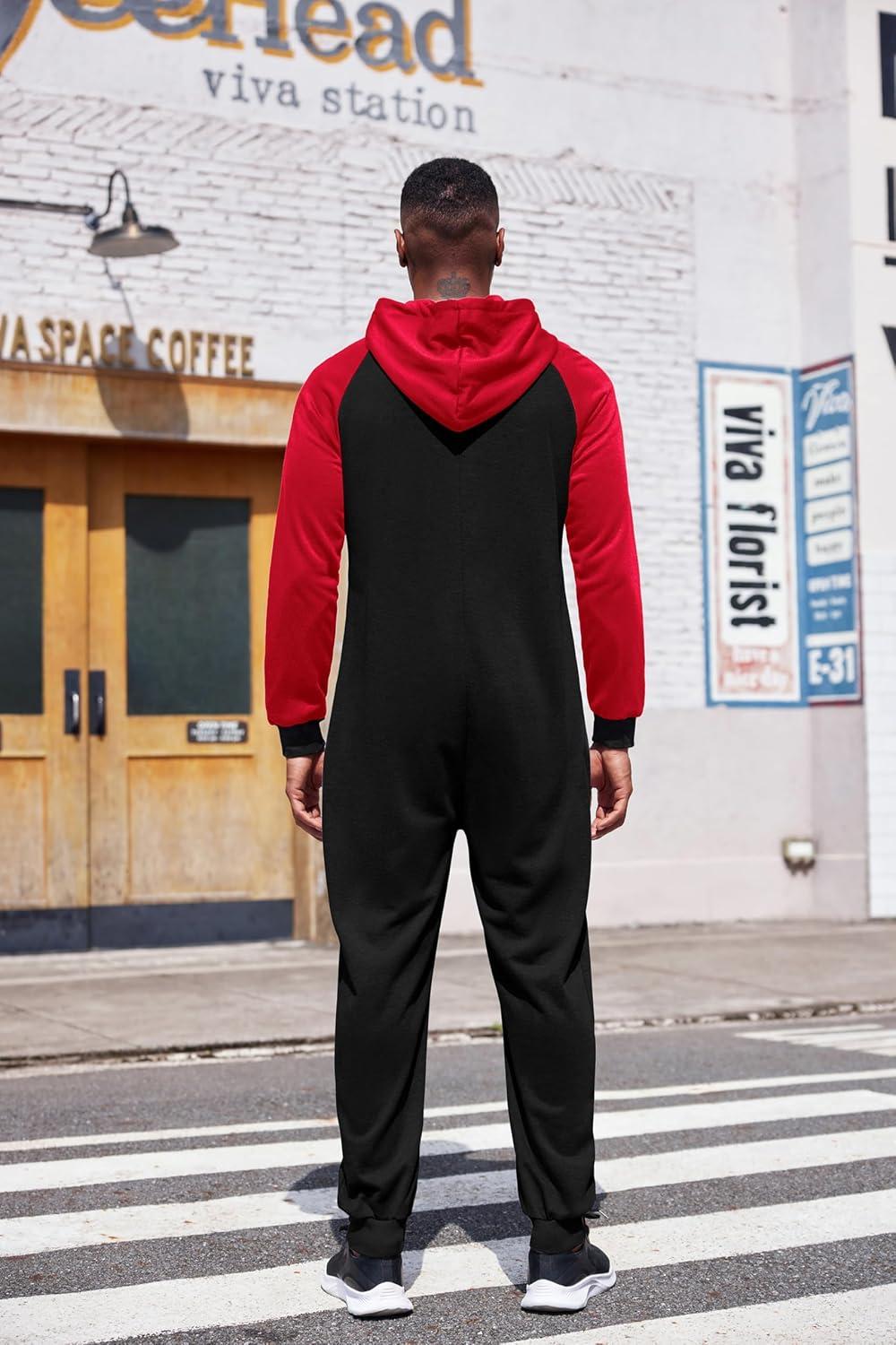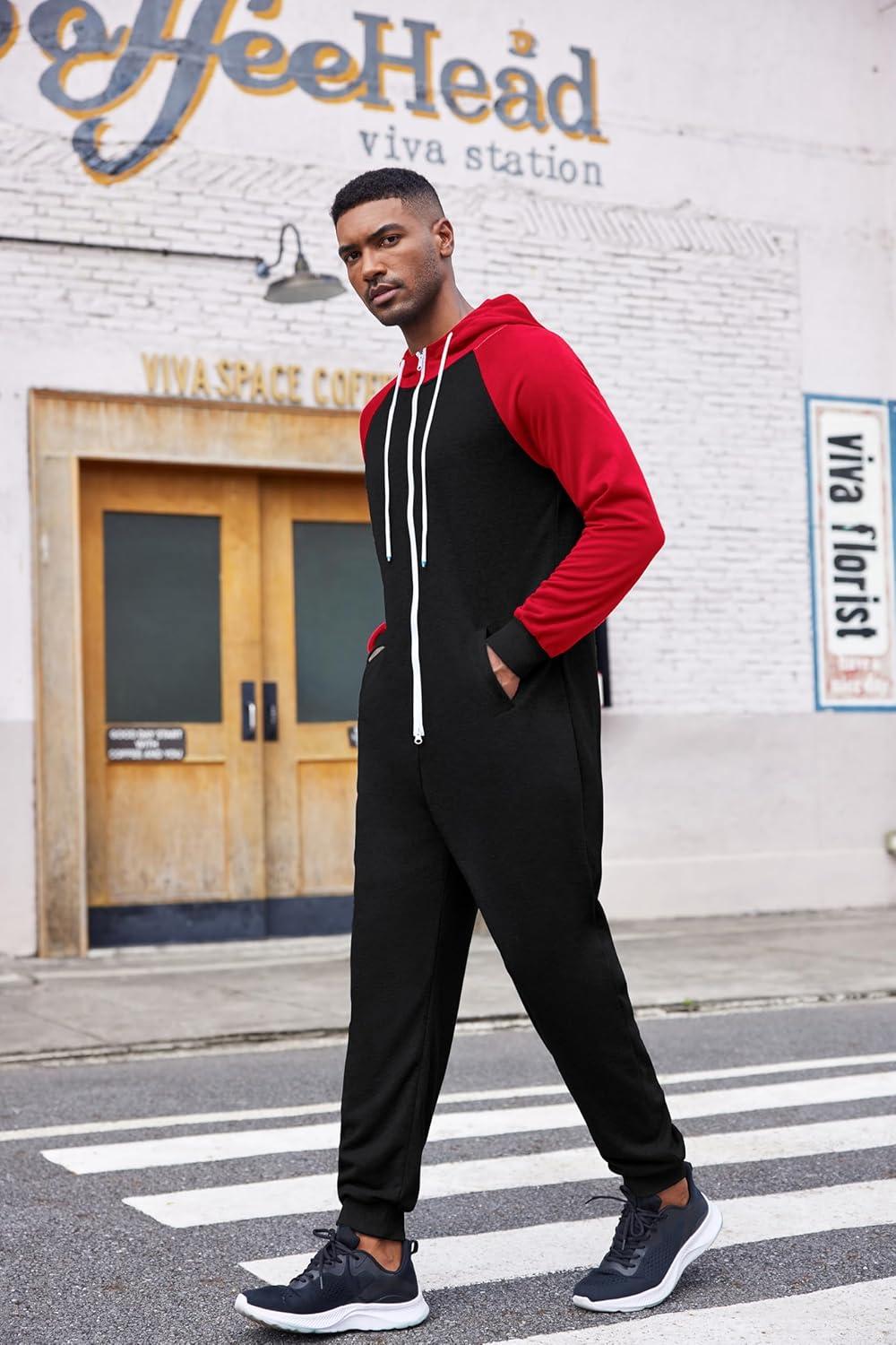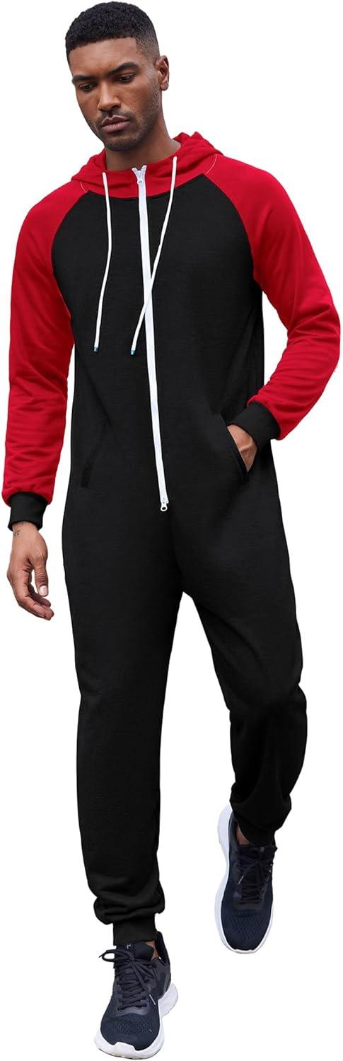 COOFANDY Mens Jumpsuit Onesie Rompers Drawstring Hooded Full Zip One Piece Tracksuit with Pockets(Black / Red)