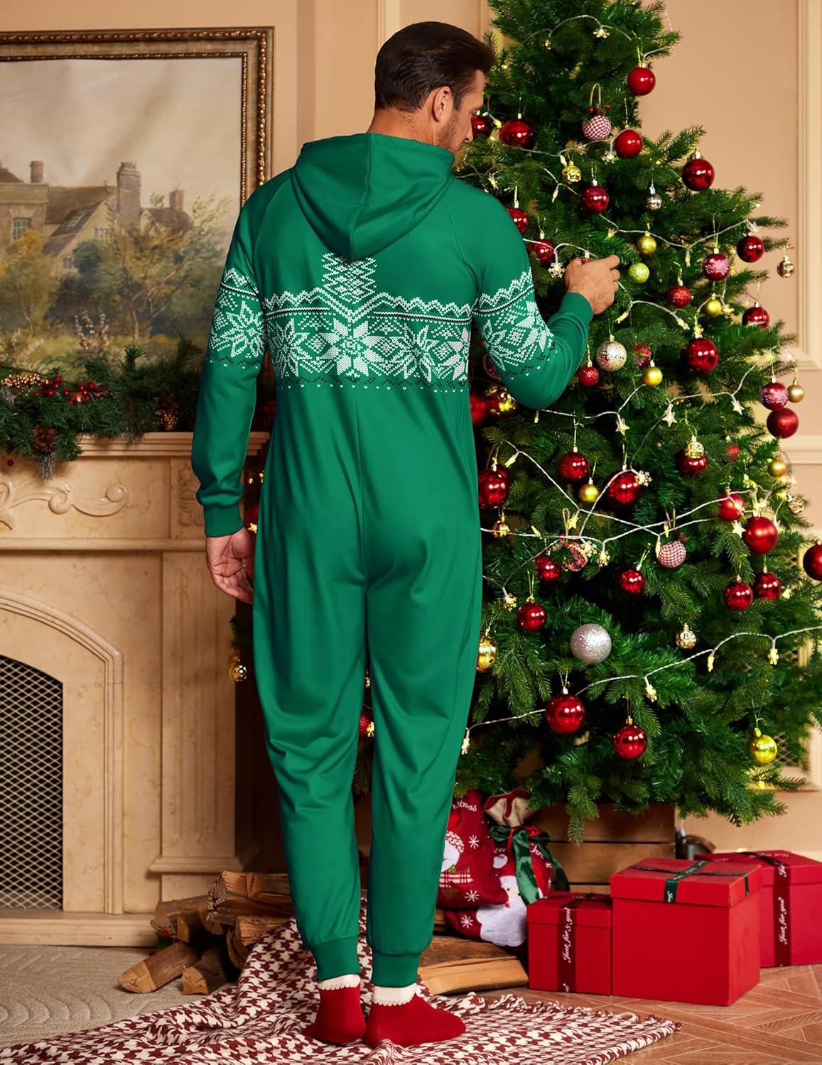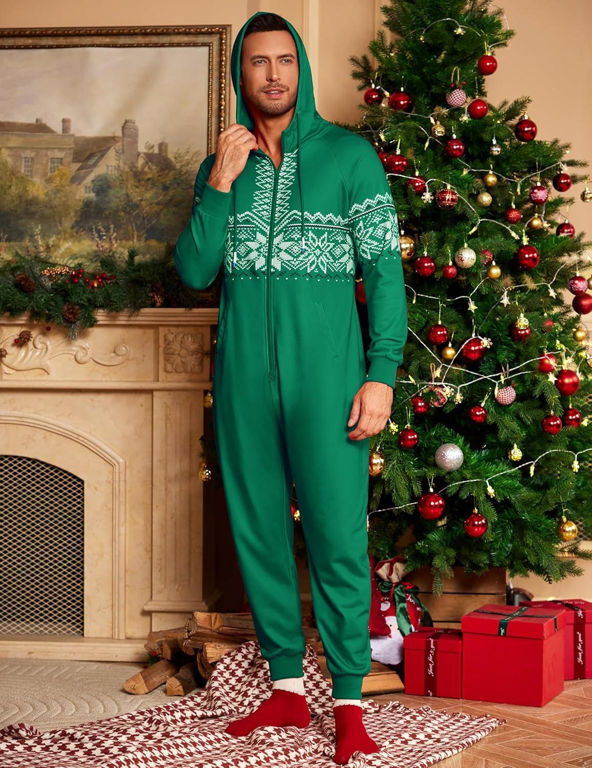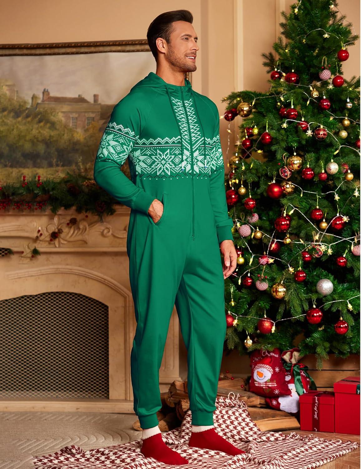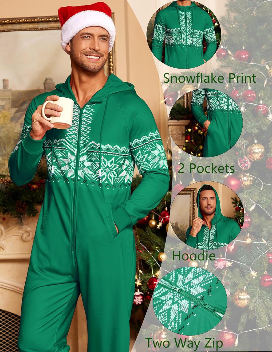 COOFANDY Mens Jumpsuit Onesie Rompers Drawstring Hooded Full Zip One Piece Tracksuit with Pockets(Green Christmas)