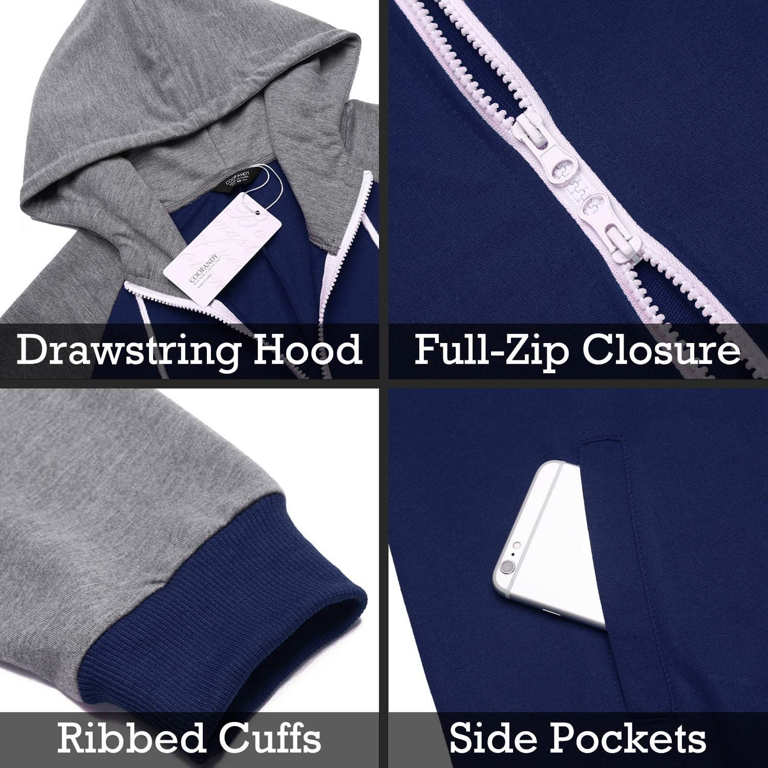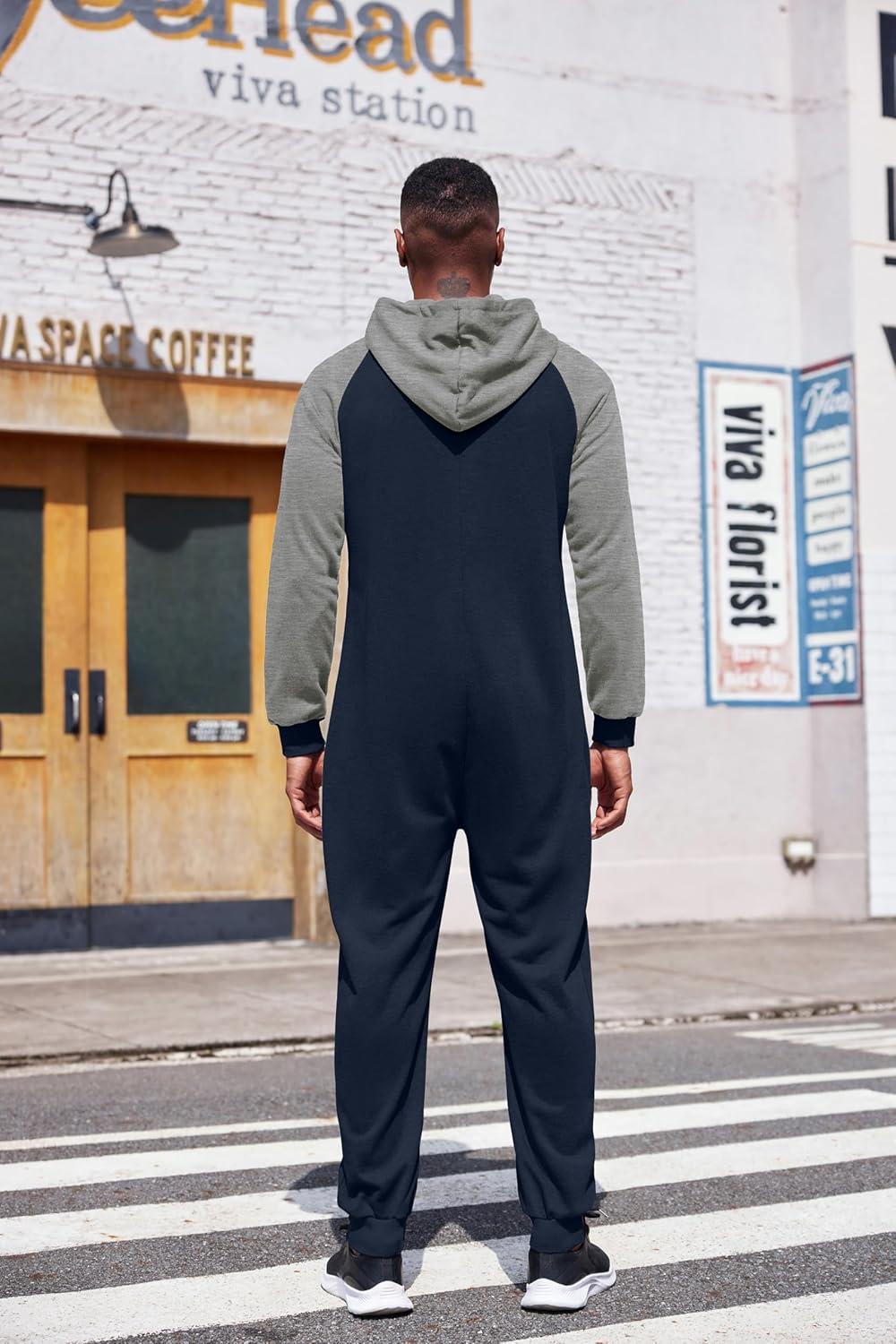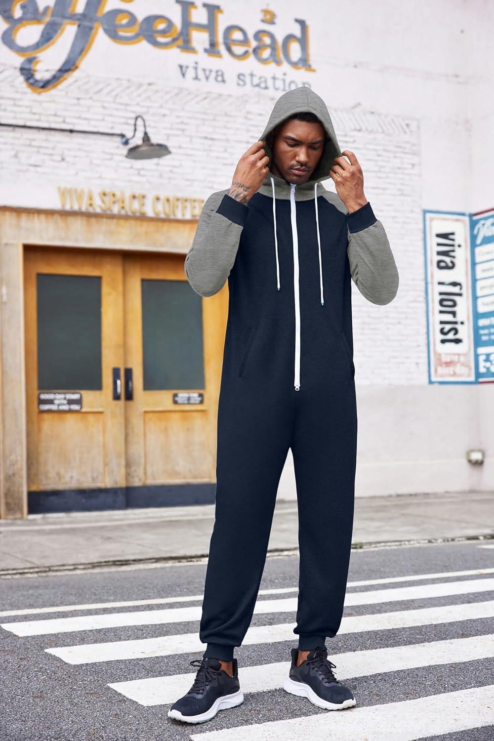 COOFANDY Mens Jumpsuit Onesie Rompers Drawstring Hooded Full Zip One Piece Tracksuit with Pockets(Navy Blue / Grey)