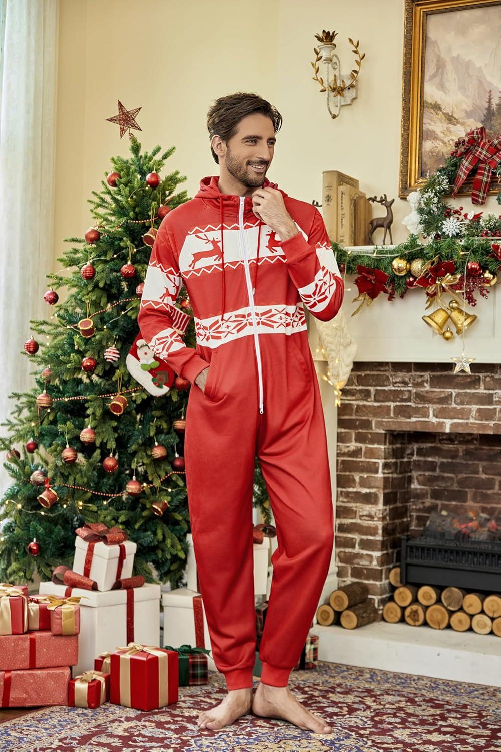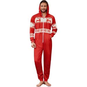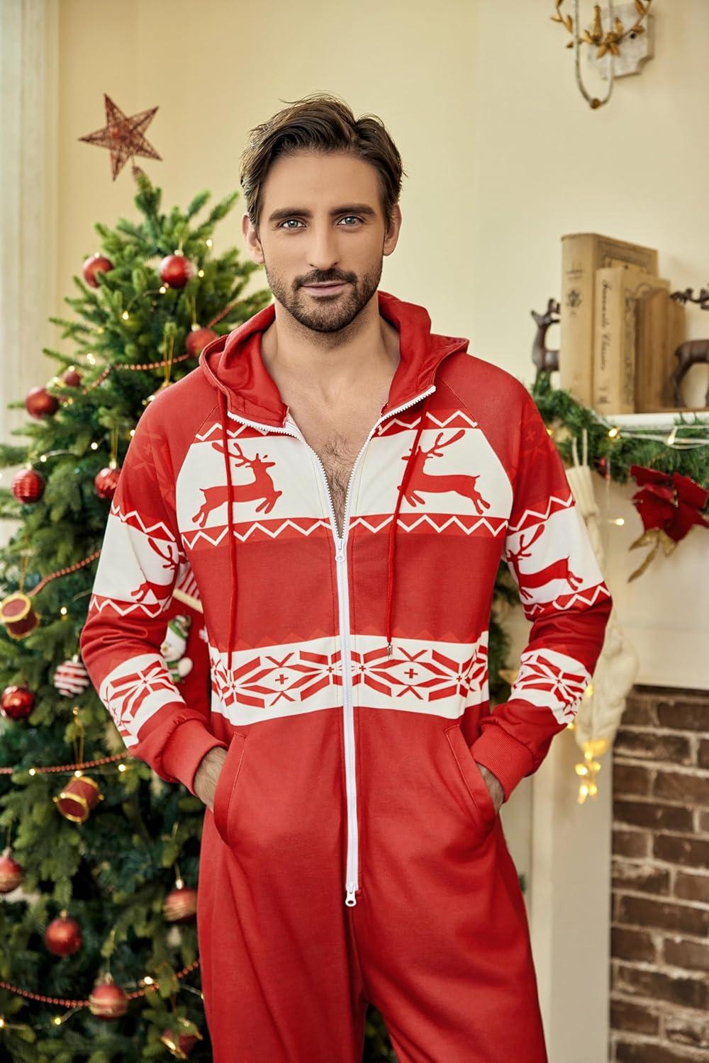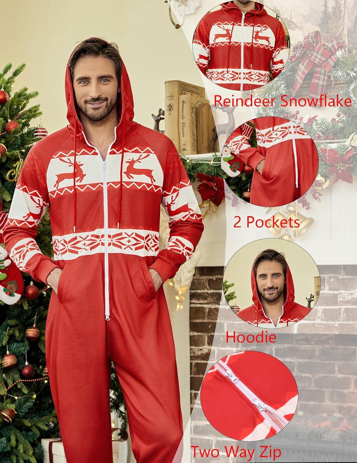 COOFANDY Mens Jumpsuit Onesie Rompers Drawstring Hooded Full Zip One Piece Tracksuit with Pockets(Red Christmas)
