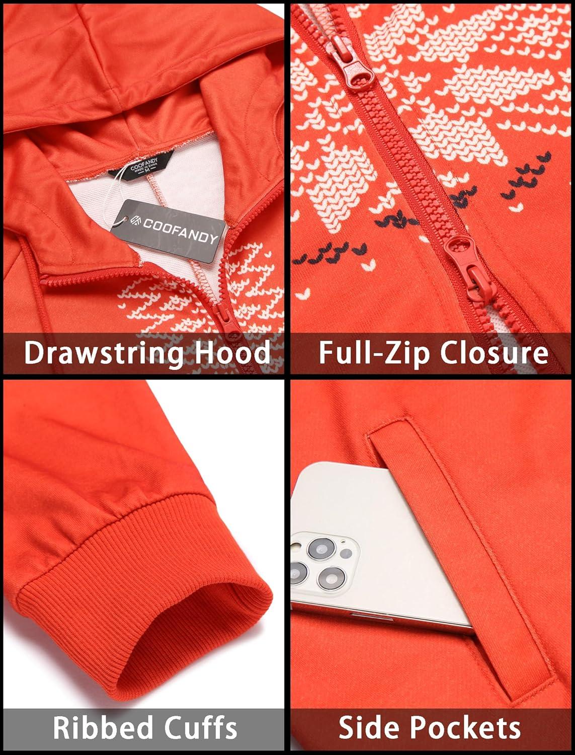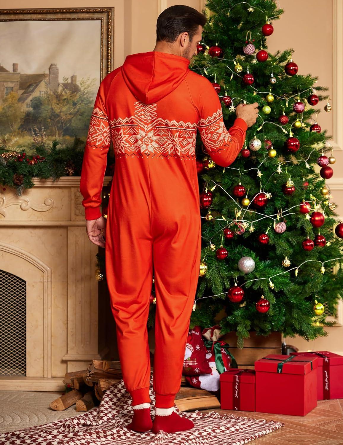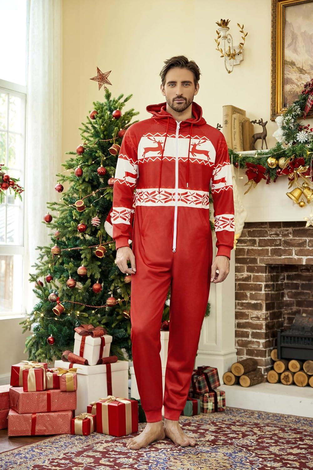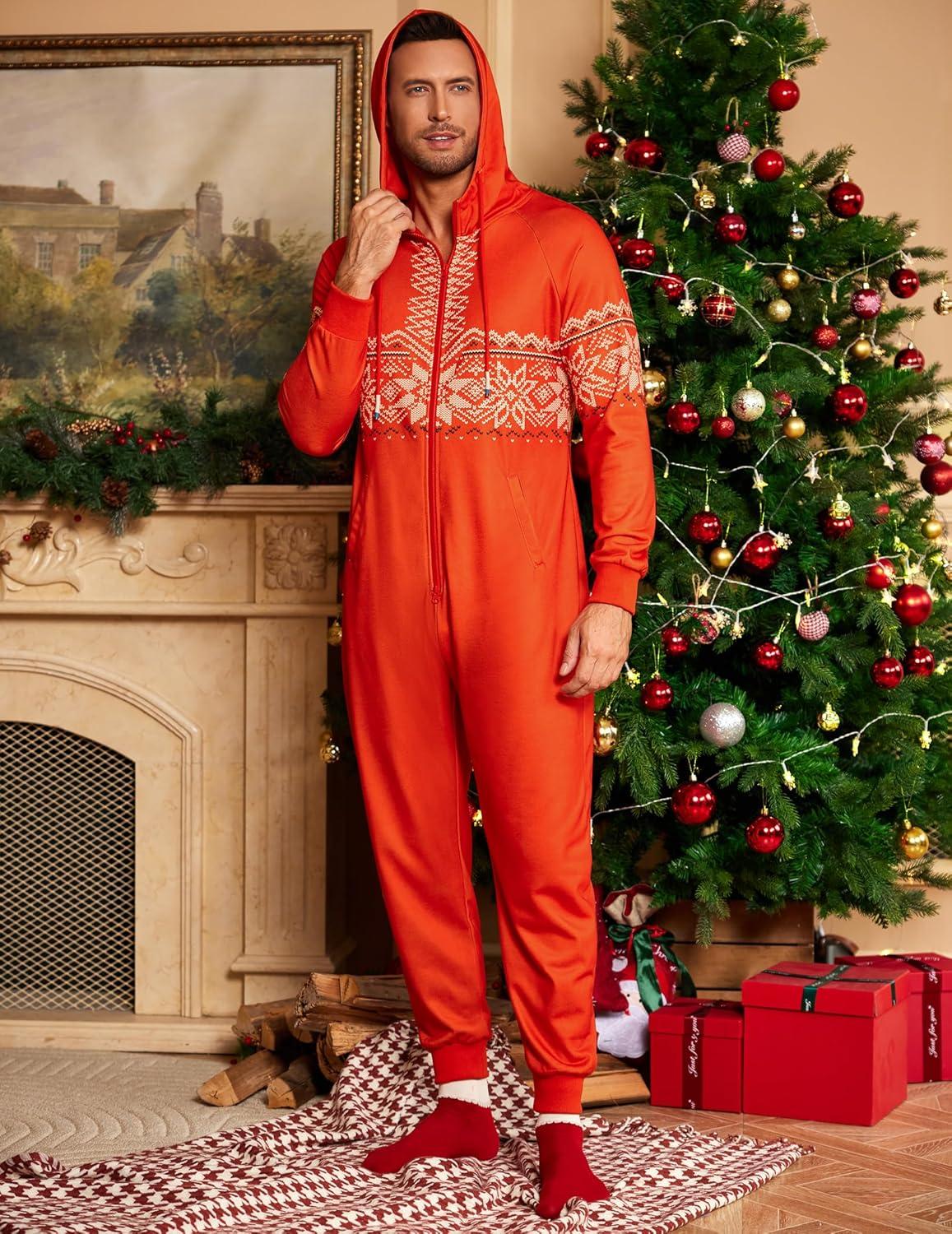 COOFANDY Mens Jumpsuit Onesie Rompers Drawstring Hooded Full Zip One Piece Tracksuit with Pockets(Red Christmas)