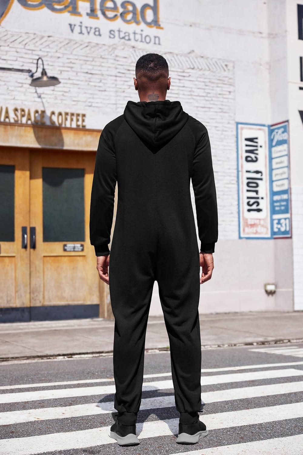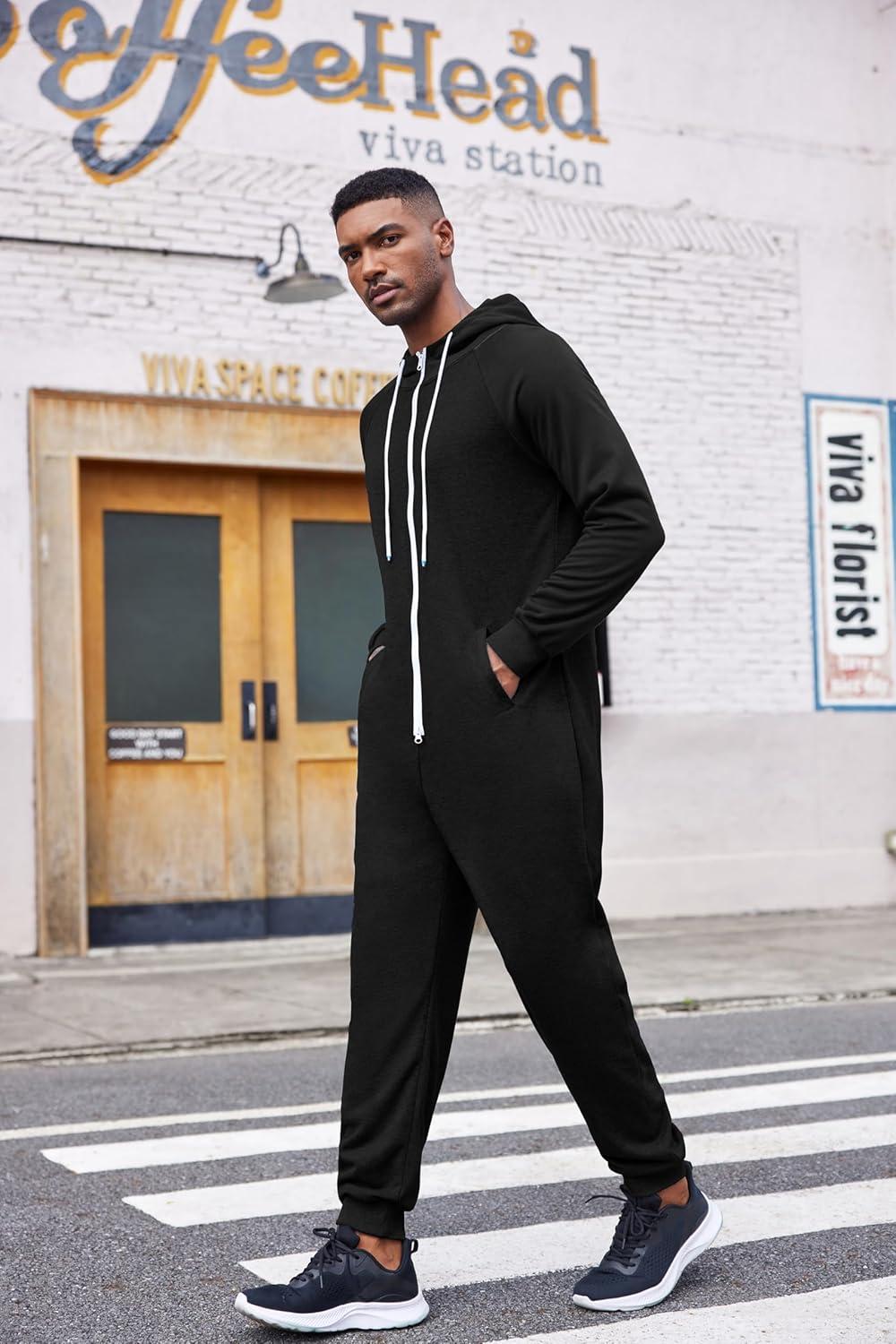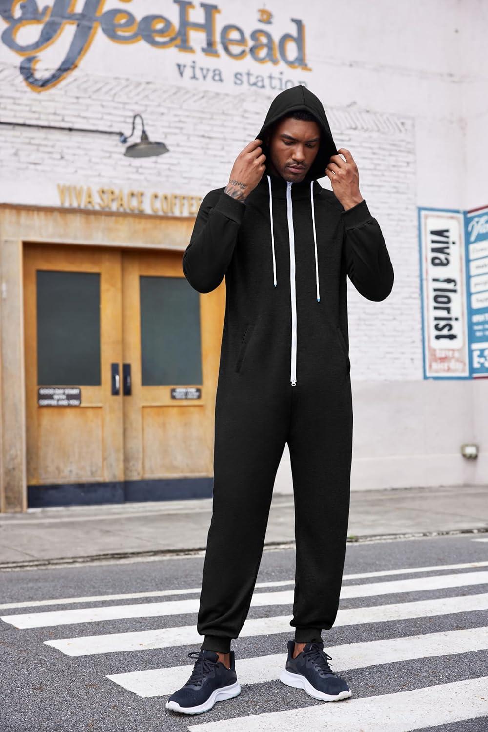 COOFANDY Mens Jumpsuit Onesie Rompers Drawstring Hooded Full Zip One Piece Tracksuit with Pockets(Solid Black)