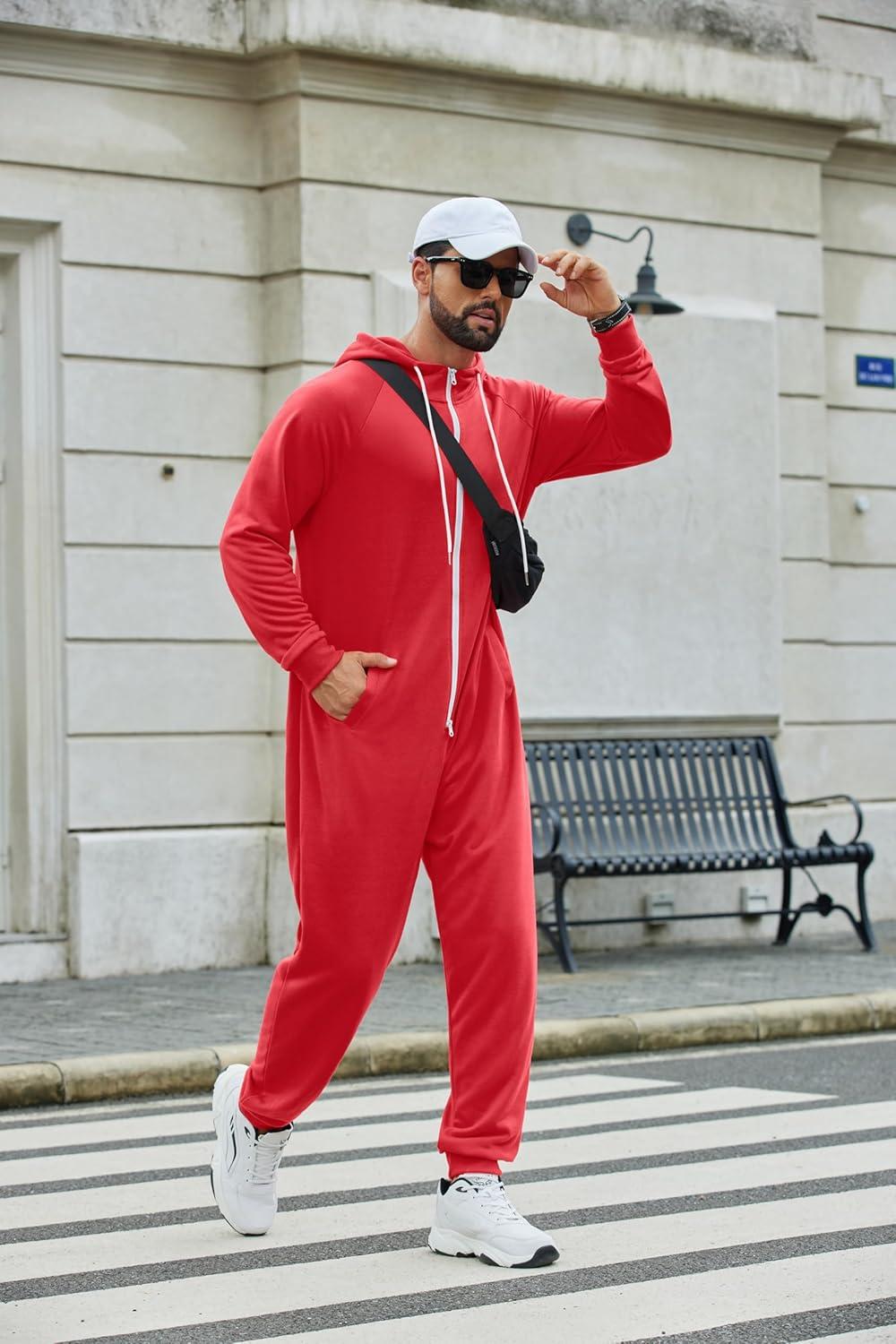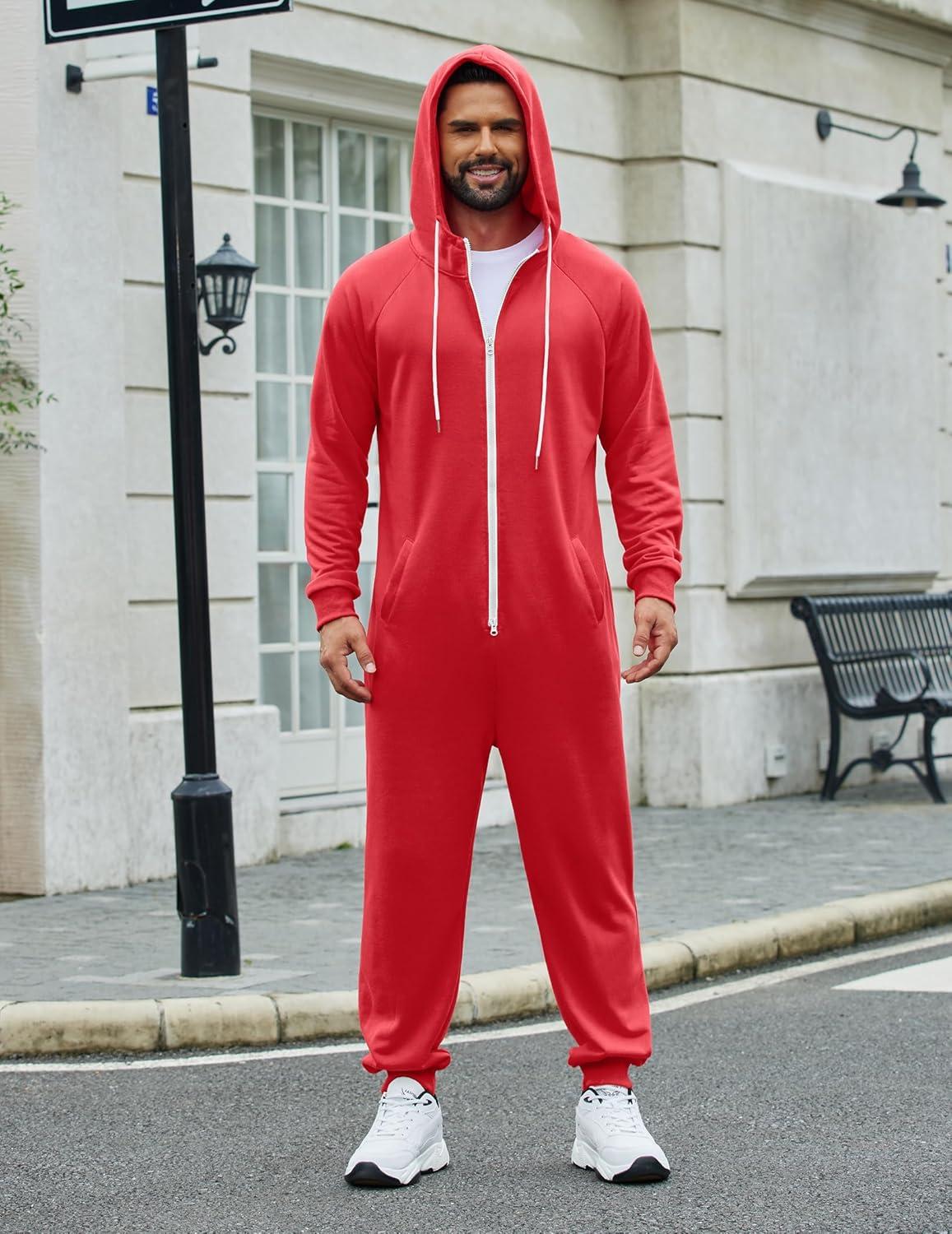 COOFANDY Mens Jumpsuit Onesie Rompers Drawstring Hooded Full Zip One Piece Tracksuit with Pockets(Solid Red)