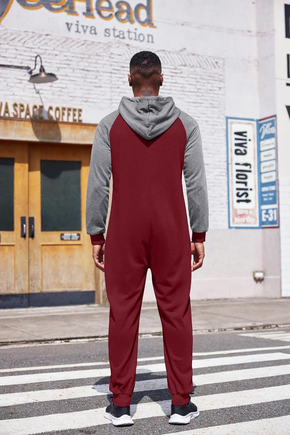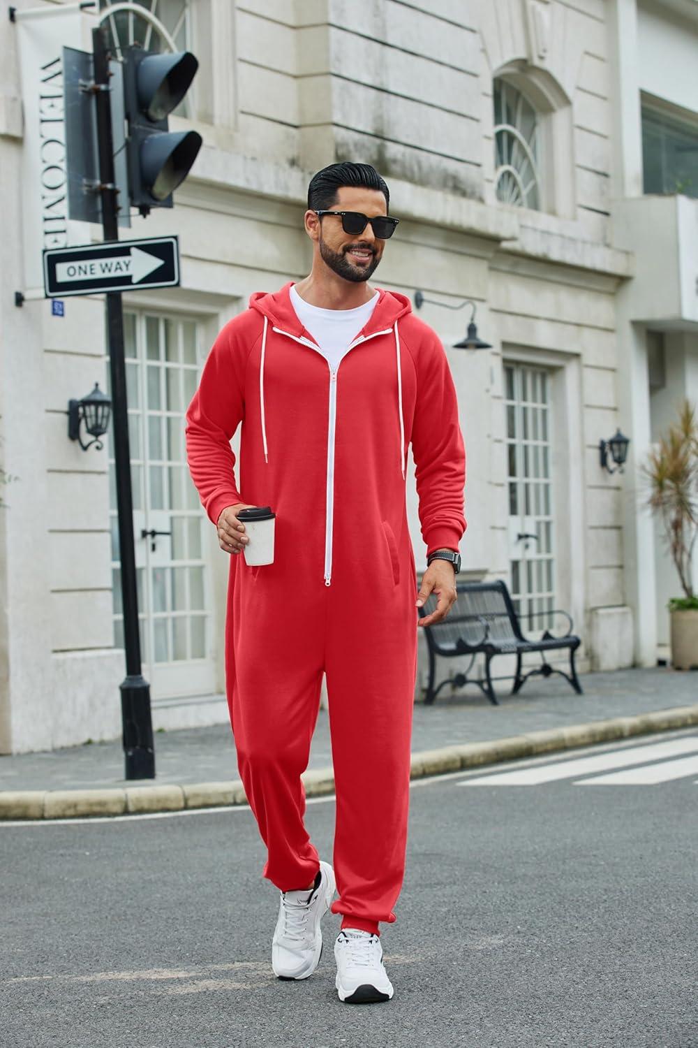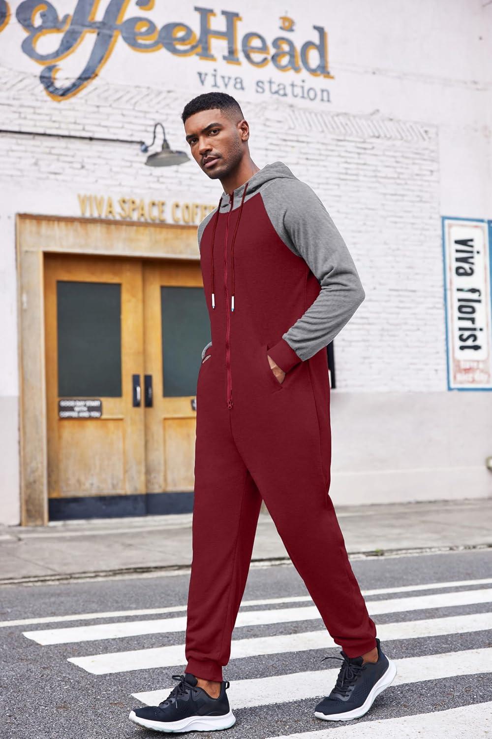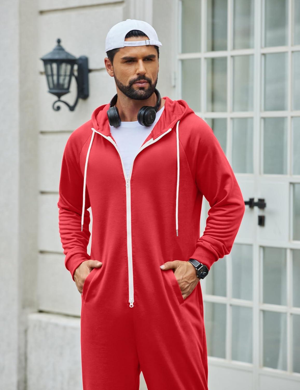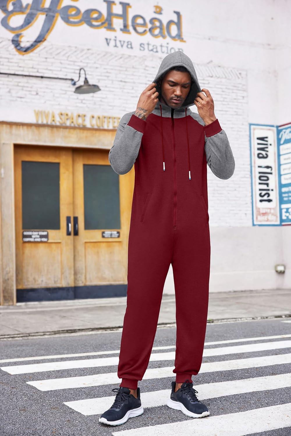 COOFANDY Mens Jumpsuit Onesie Rompers Drawstring Hooded Full Zip One Piece Tracksuit with Pockets(Red Elk)