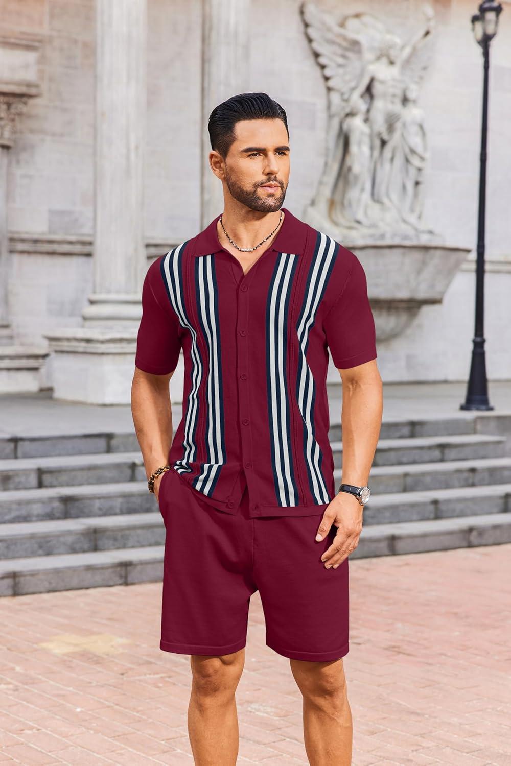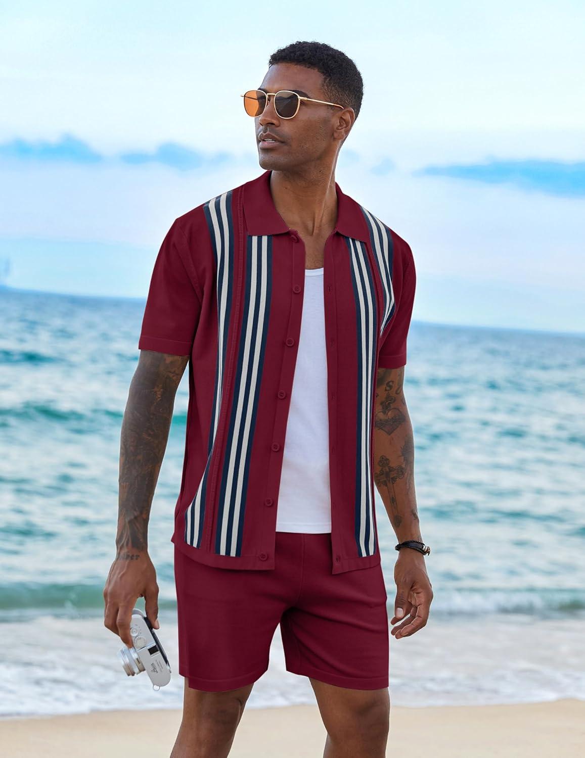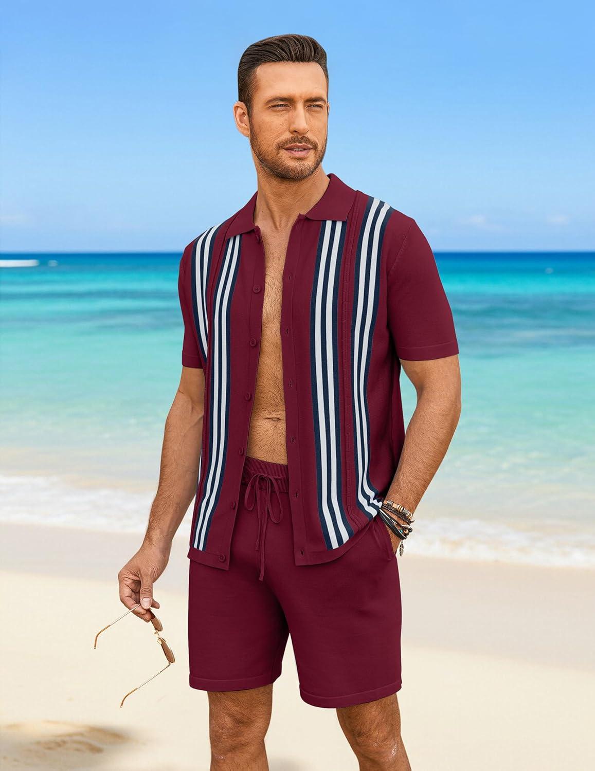 COOFANDY Men’s 2 Piece Outfits Summer Short Sets Vintage Knit Button Down Shirt Short Sleeve Polo Casual Beach Suits(Wine Red)