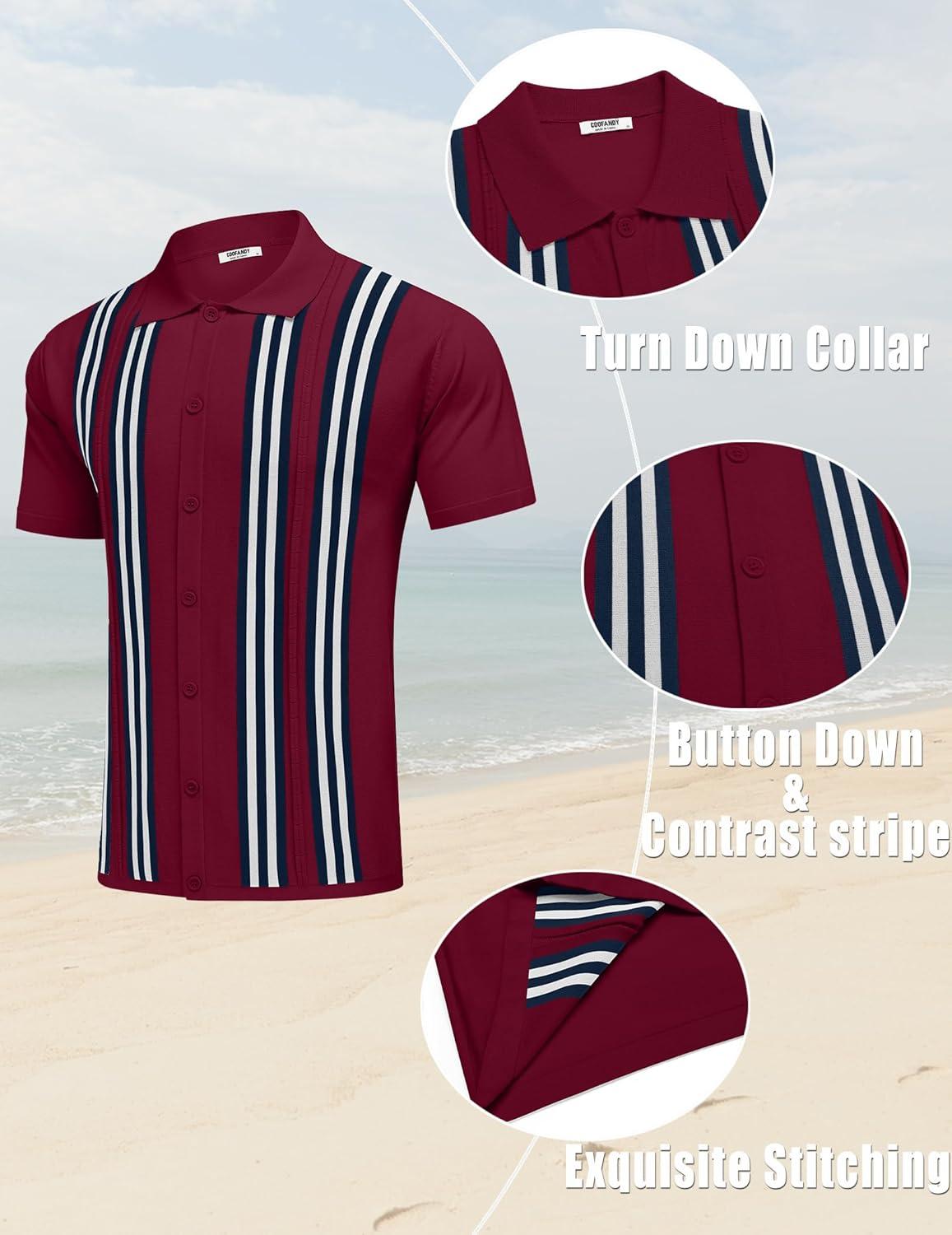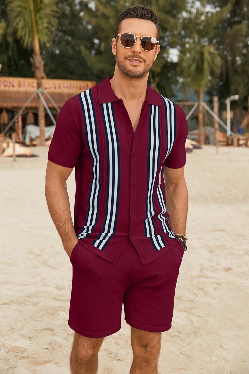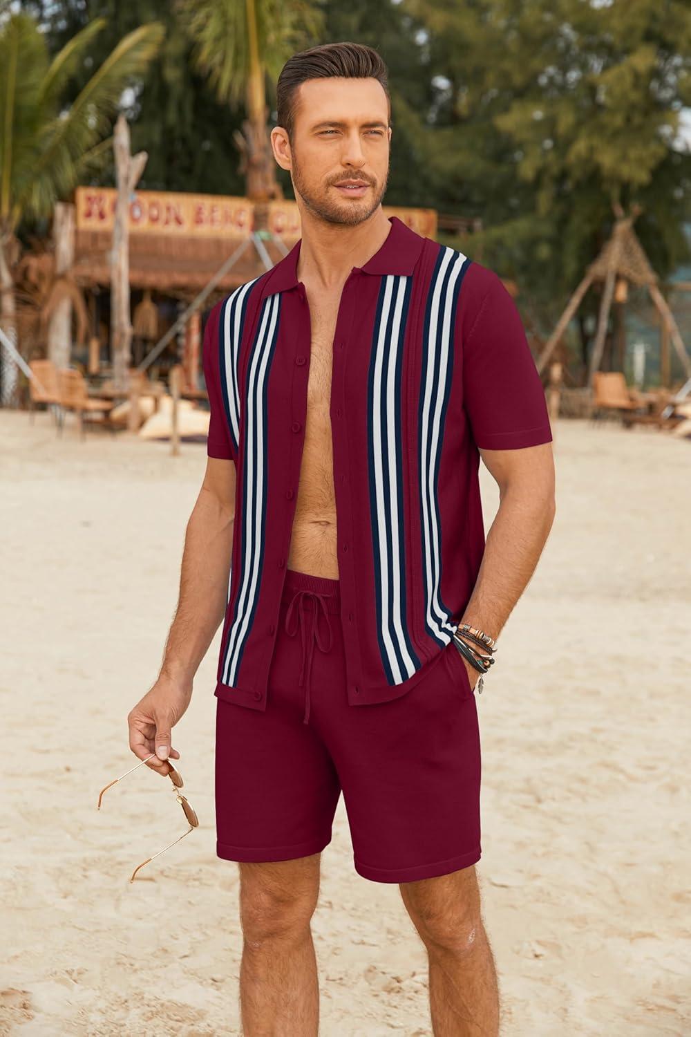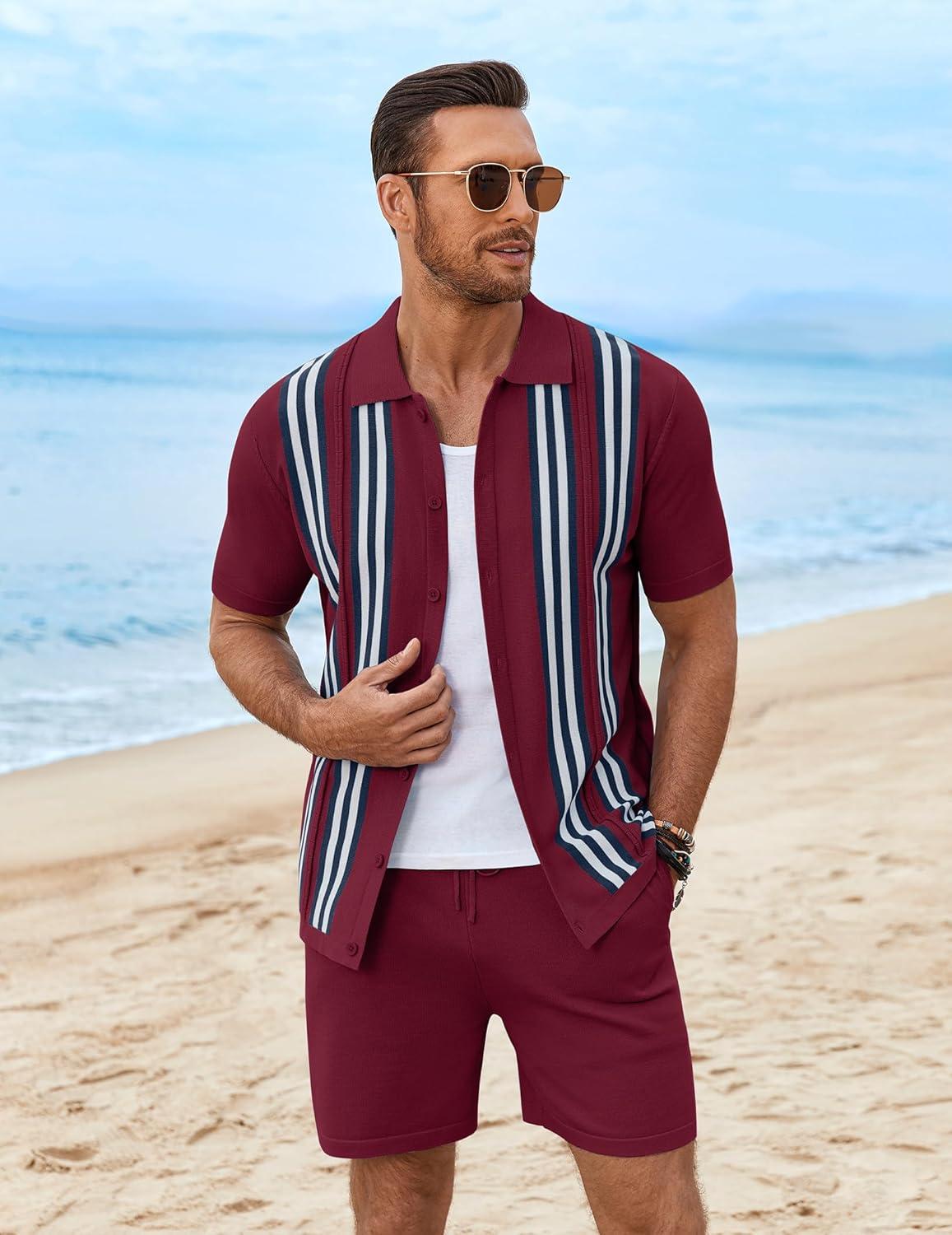 COOFANDY Men’s 2 Piece Outfits Summer Short Sets Vintage Knit Button Down Shirt Short Sleeve Polo Casual Beach Suits(Wine Red)