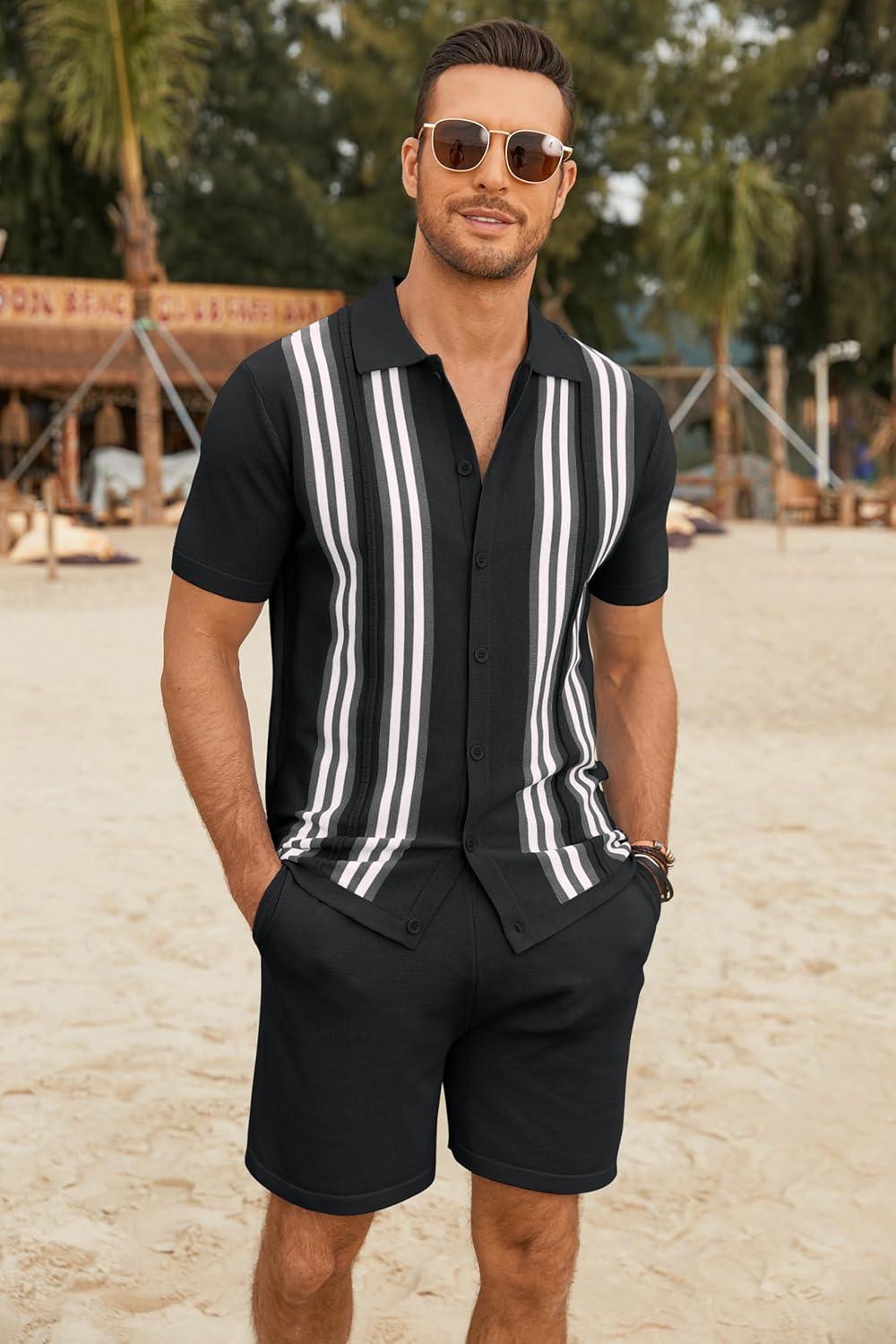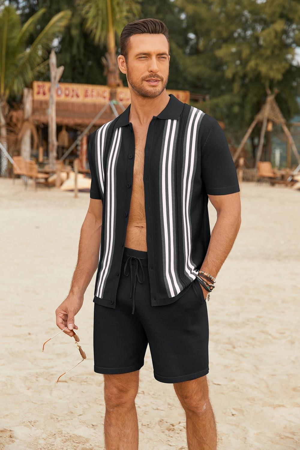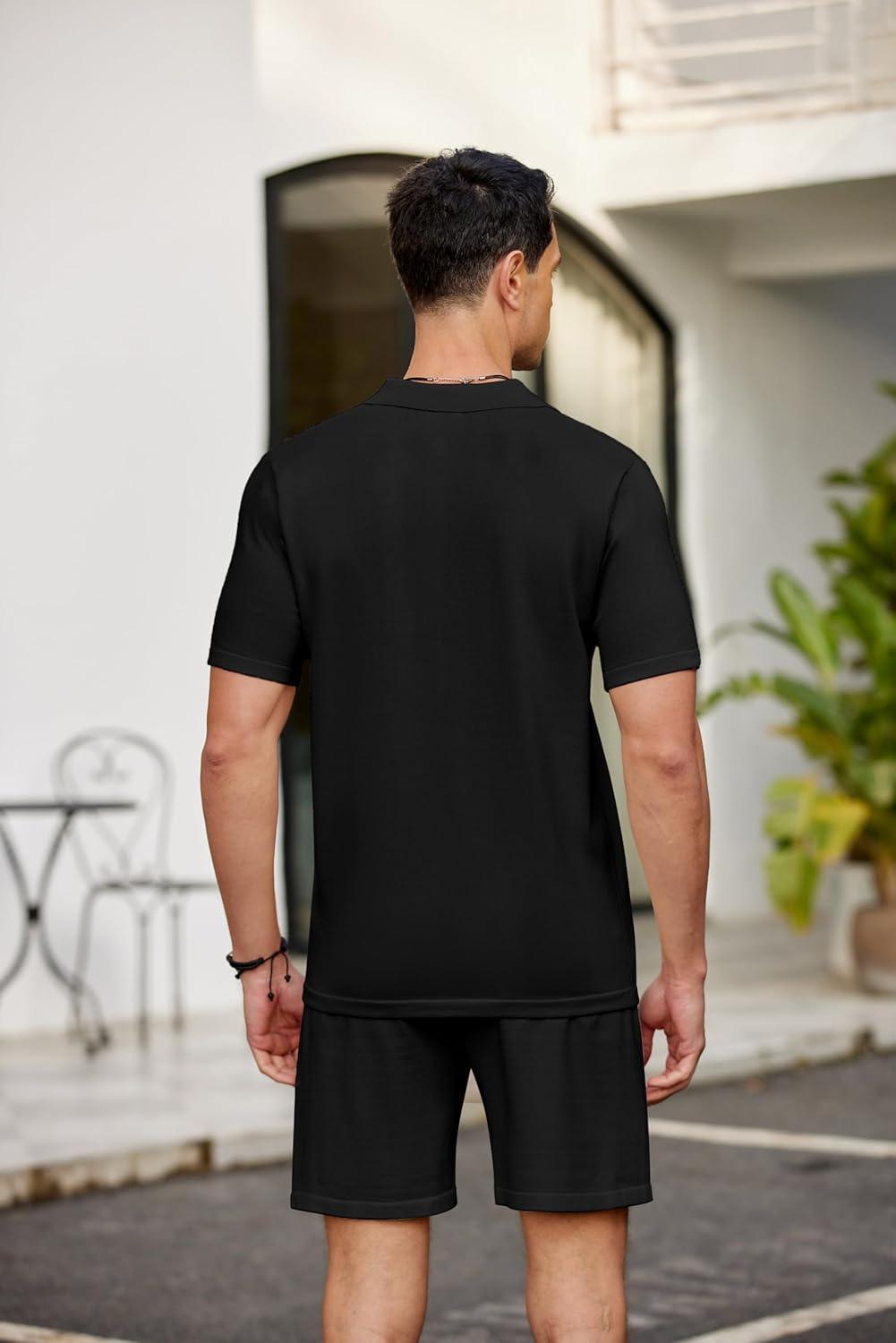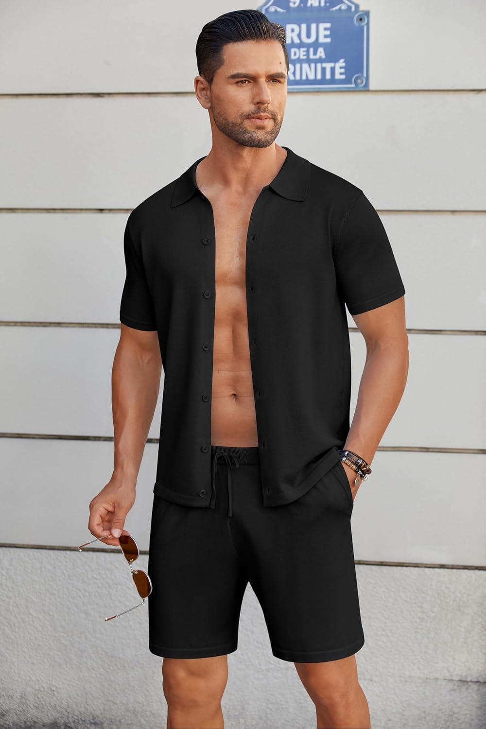 COOFANDY Men’s 2 Piece Outfits Sets Casual Short Sleeve Button Down Knit Shirt and Shorts Sets Summer Beach Outfits(Black)