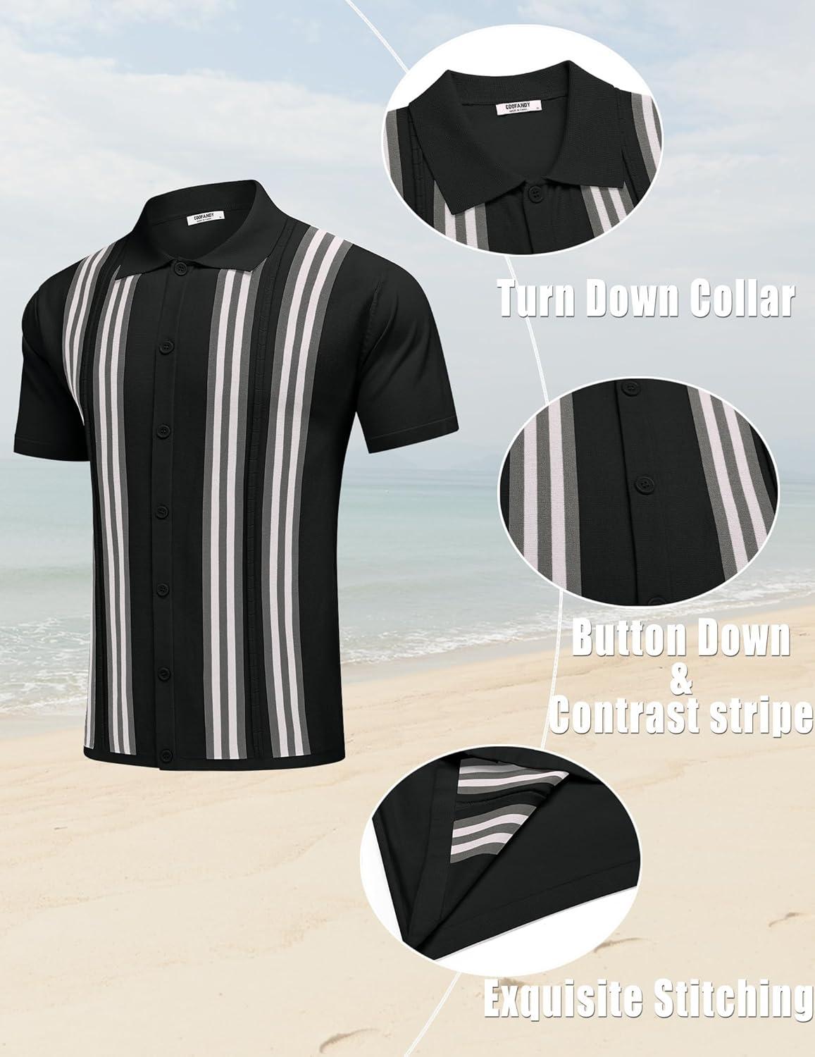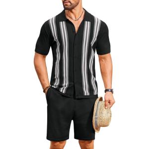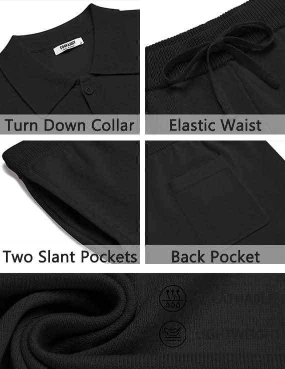 COOFANDY Men’s 2 Piece Outfits Summer Short Sets Vintage Knit Button Down Shirt Short Sleeve Polo Casual Beach Suits(Black)