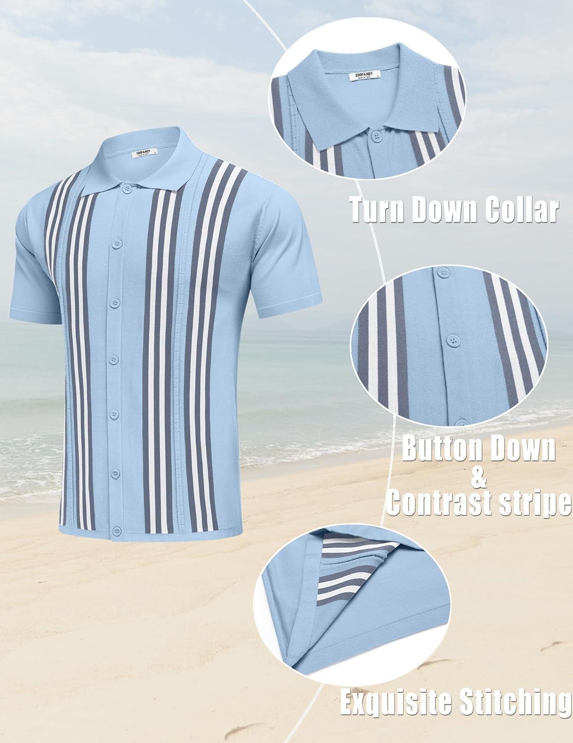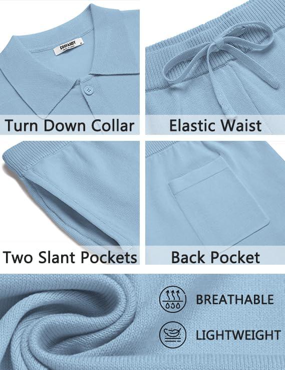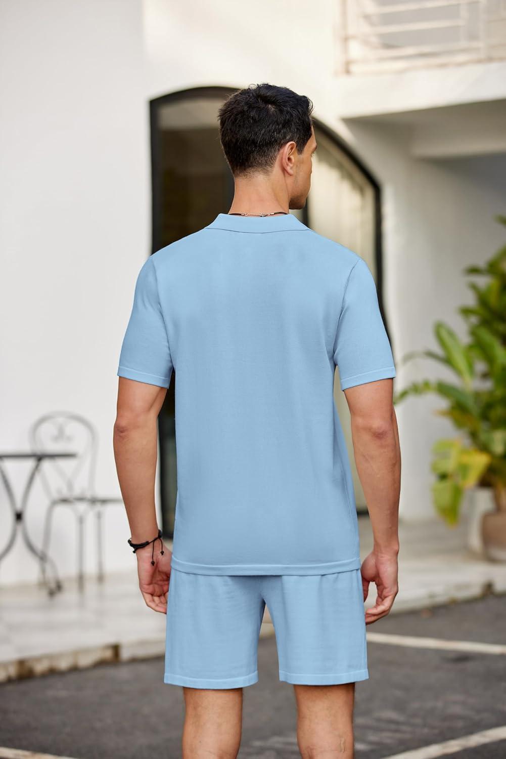 COOFANDY Men’s 2 Piece Outfits Summer Short Sets Vintage Knit Button Down Shirt Short Sleeve Polo Casual Beach Suits(Blue)