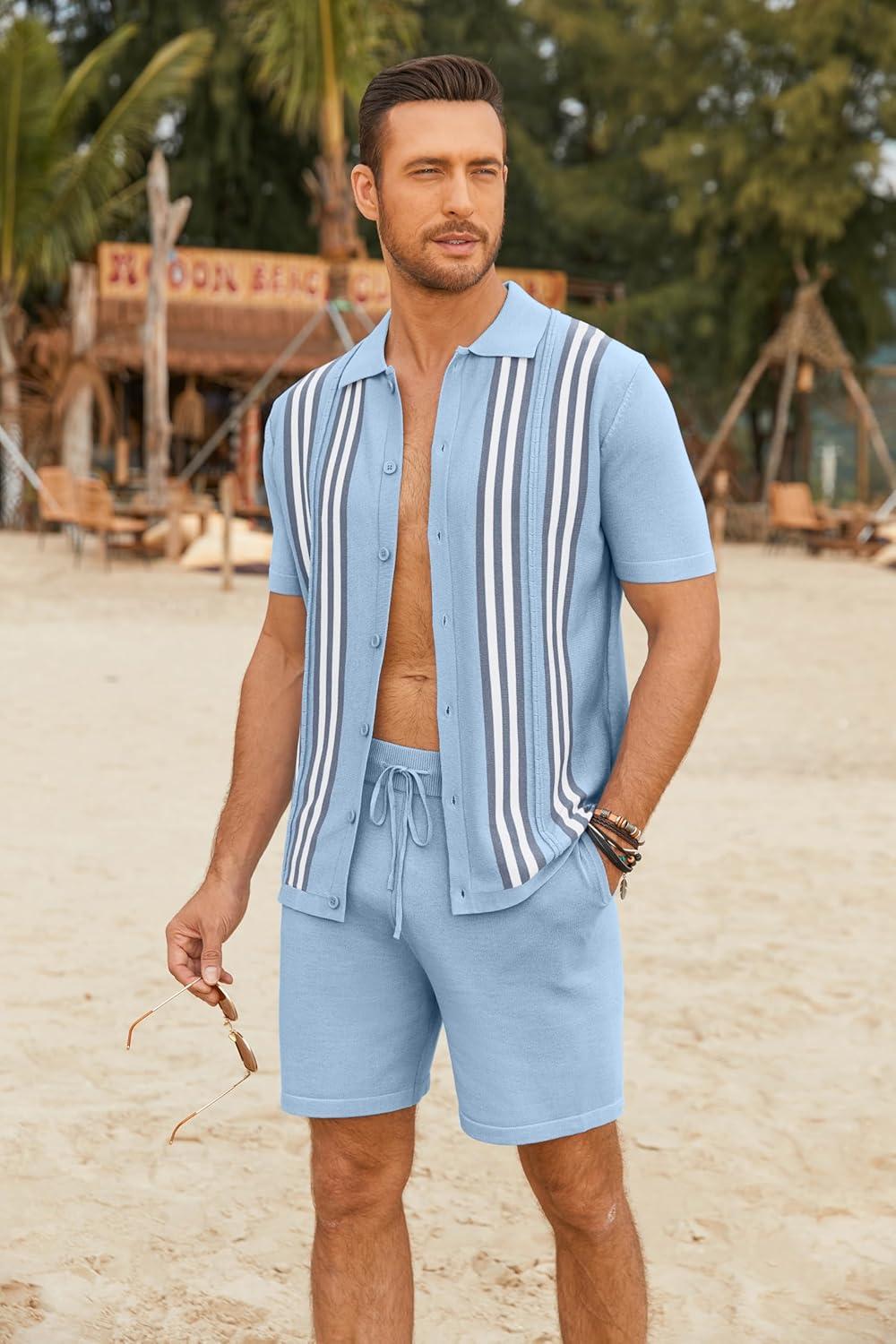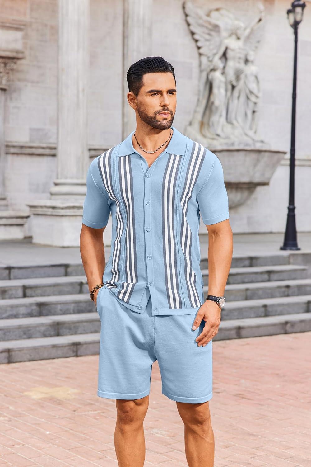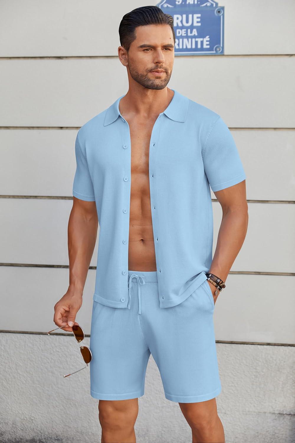 COOFANDY Men’s 2 Piece Outfits Sets Casual Short Sleeve Button Down Knit Shirt and Shorts Sets Summer Beach Outfits(Blue)