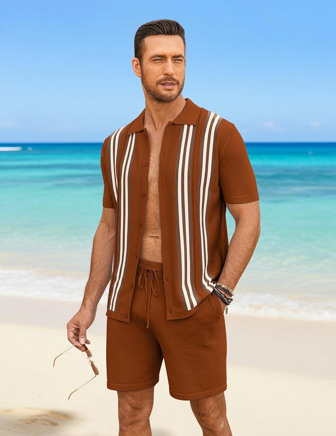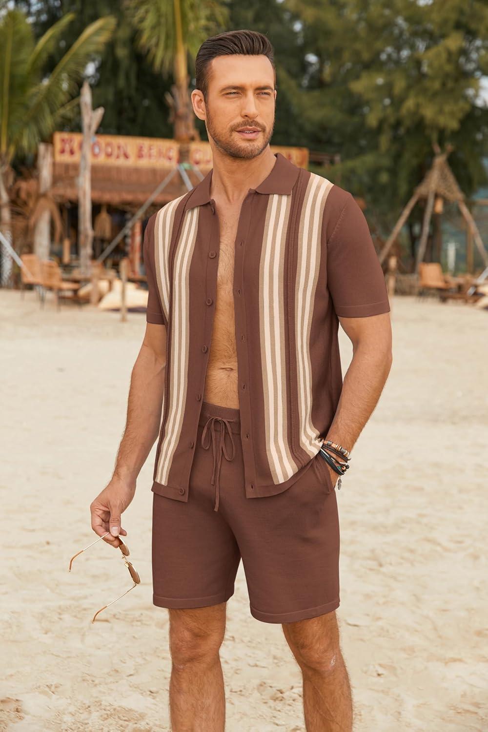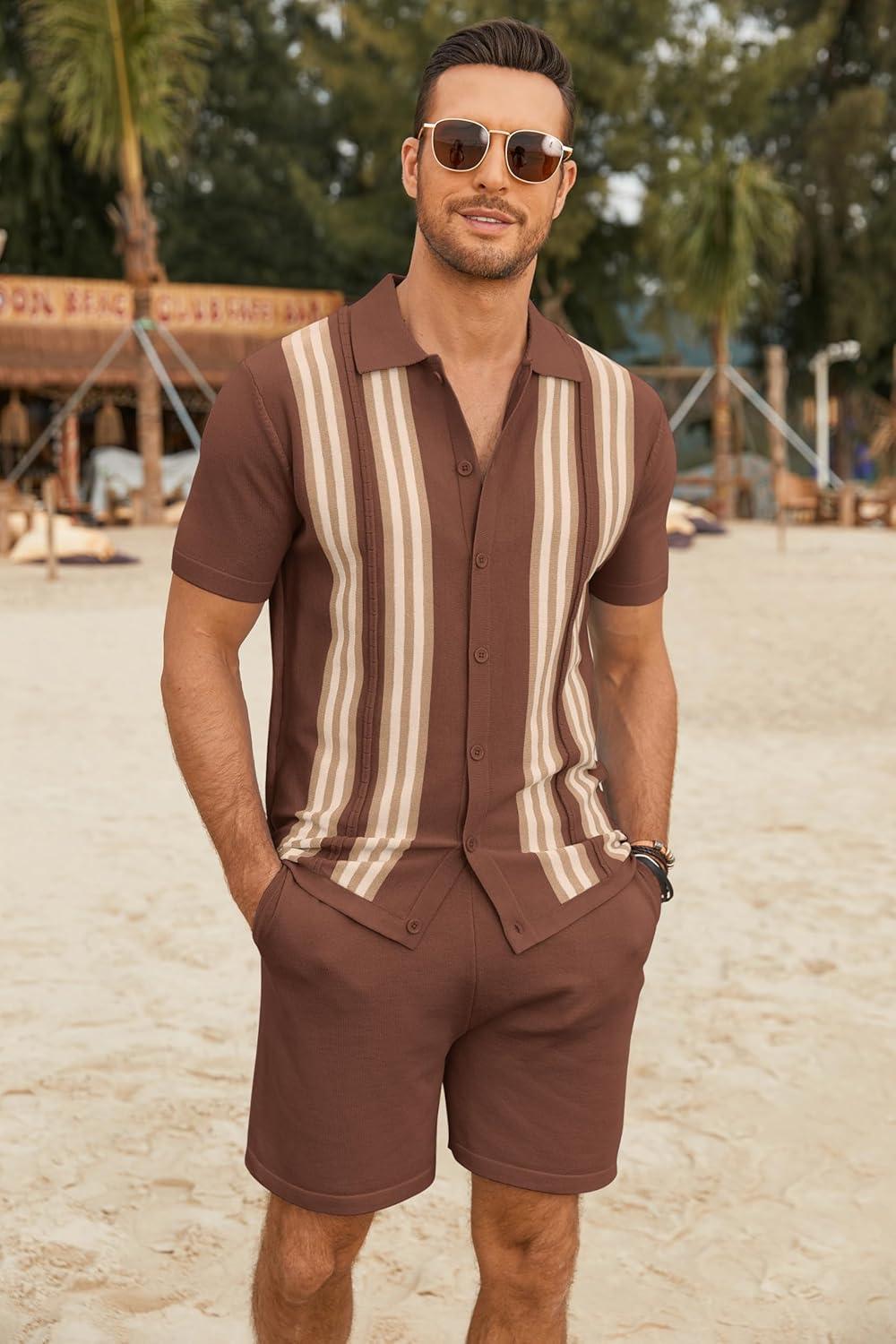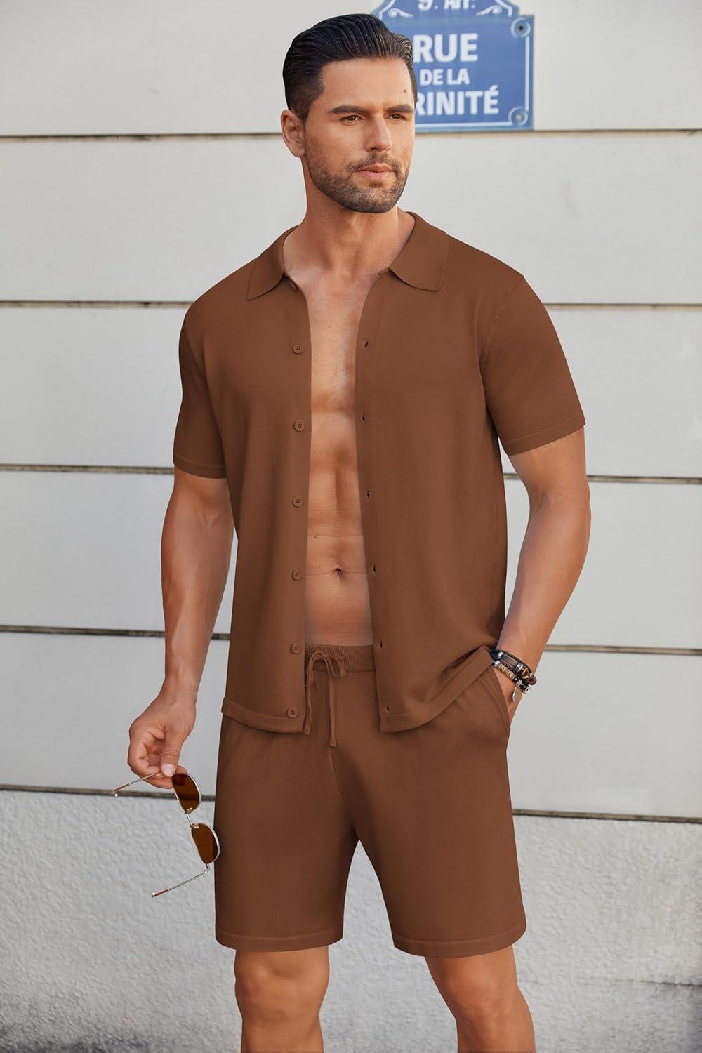 COOFANDY Men’s 2 Piece Outfits Sets Casual Short Sleeve Button Down Knit Shirt and Shorts Sets Summer Beach Outfits(Brown)