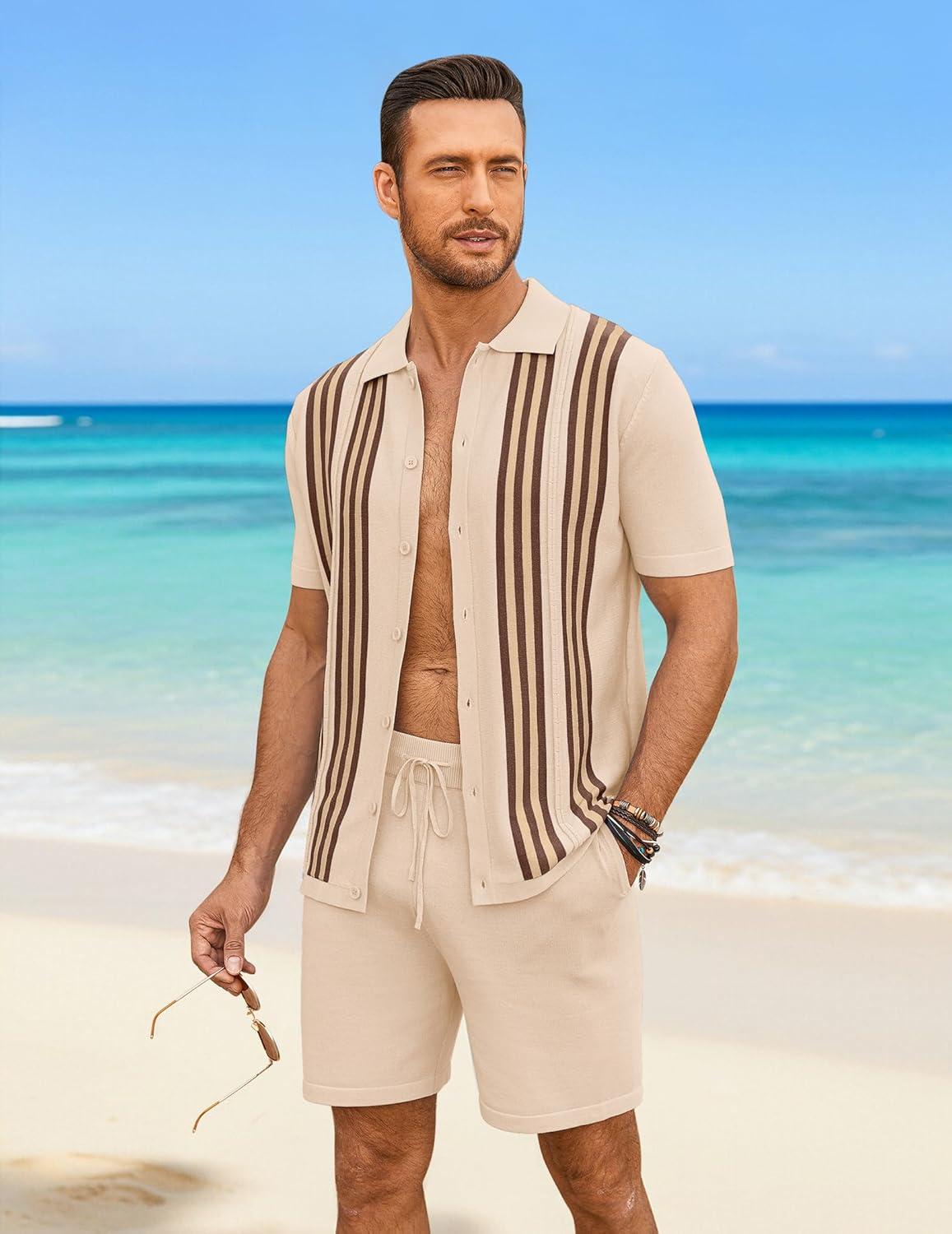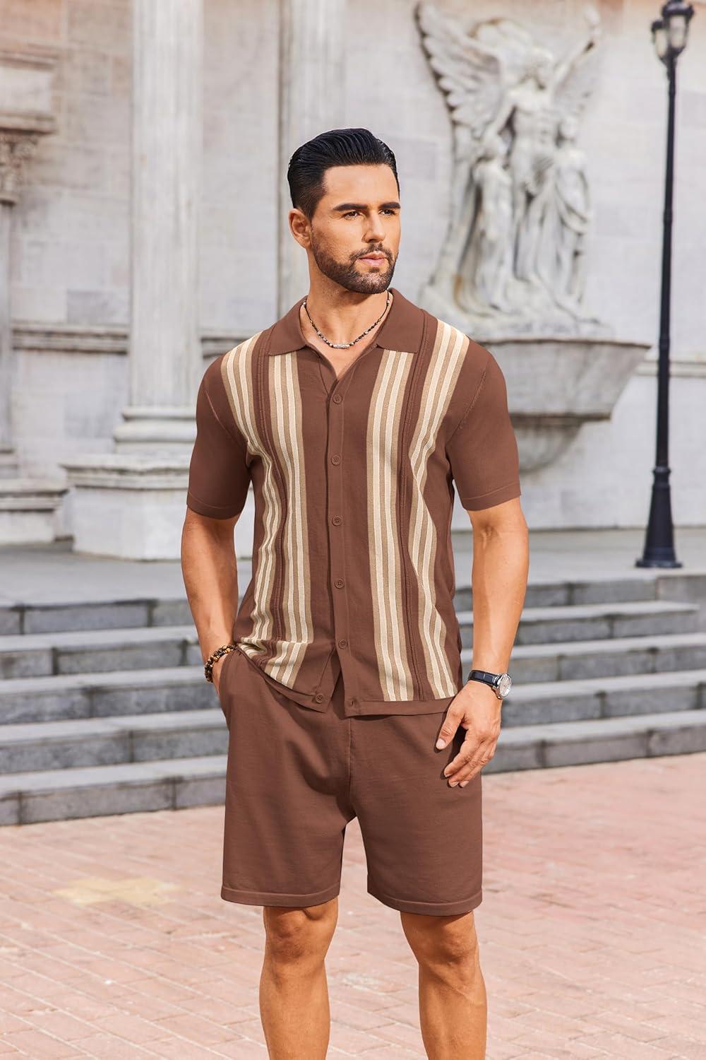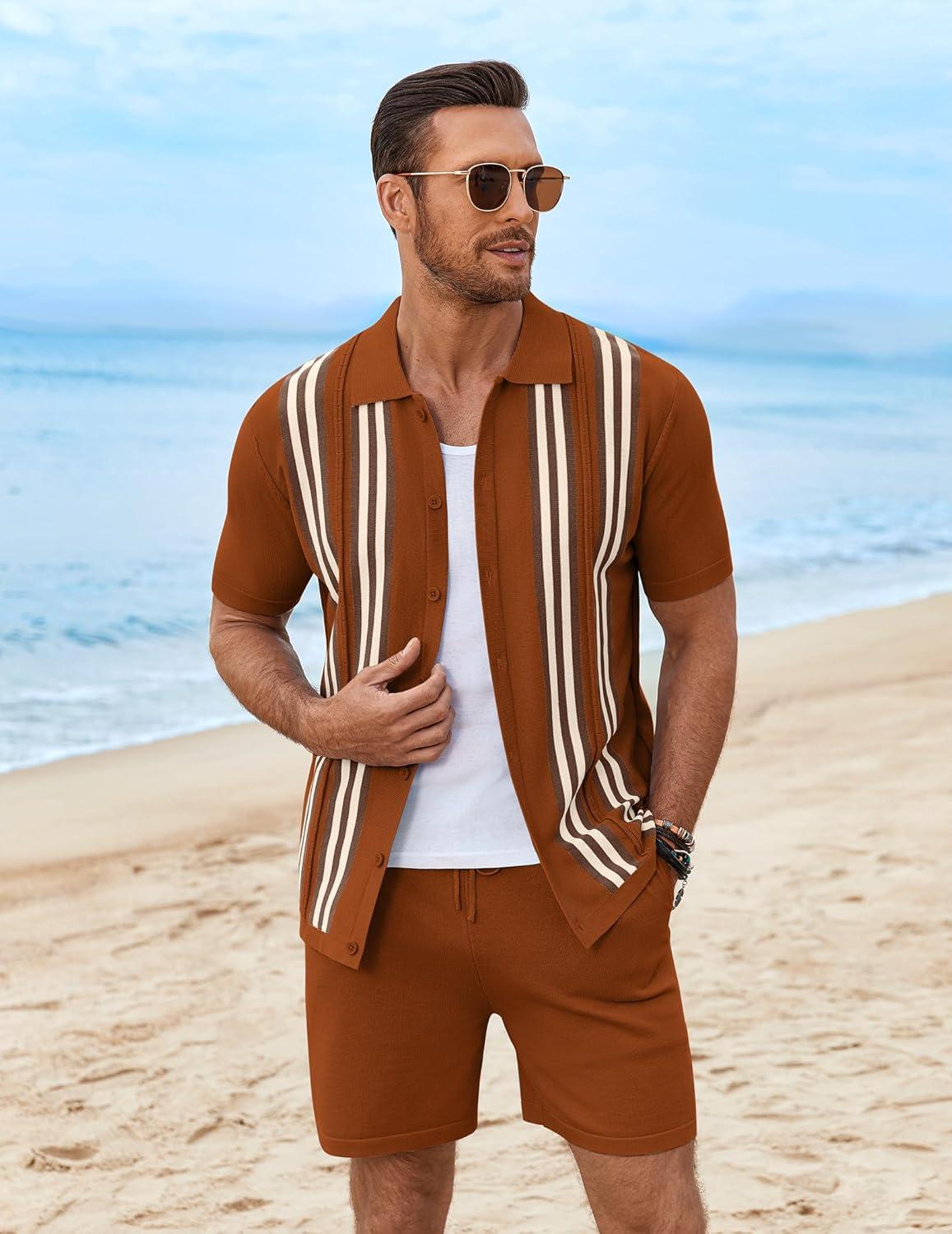 COOFANDY Men’s 2 Piece Outfits Sets Casual Short Sleeve Button Down Knit Shirt and Shorts Sets Summer Beach Outfits(Brown)